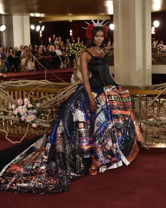 Закрыла шоу Наоми Кэмпбелл — в платье с видом на Таймс-Сквер и семиконечной короне как у Статуи Свободы. Этот образ прослеживался на протяжении всего показа — в стайлинге, принтах и силуэтах луков. Даже топы-корсеты, которые, кажется, снова войдут в моду, были зашнурованы не до конца и не сковывали движений. Очень удобно для зажигательных танцев на афтепати, куда модели отправились в сопровождении Сары Джессики-Паркер, Дакоты Фаннинг, Изабеллы Росселлини и Кэтрин Зета-Джонс.