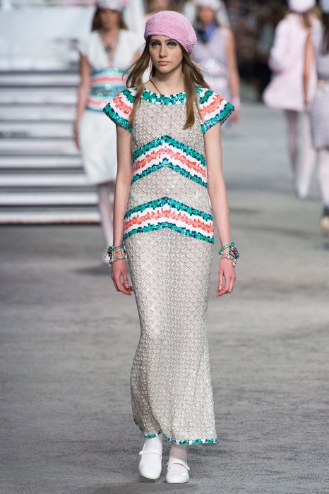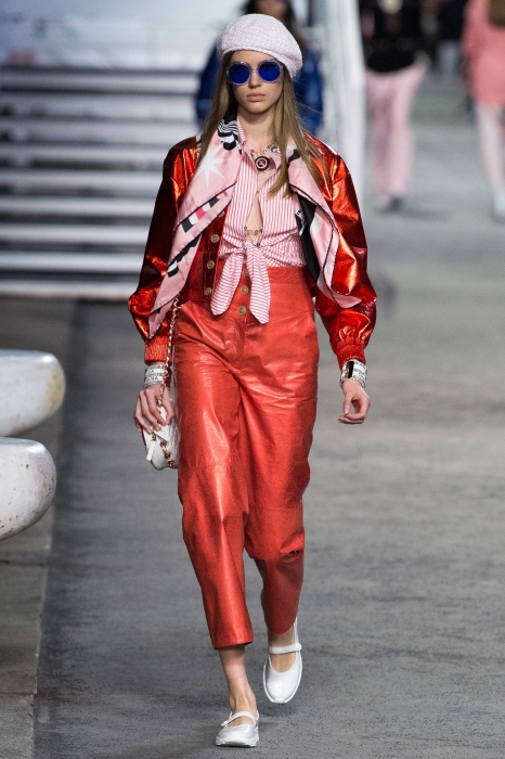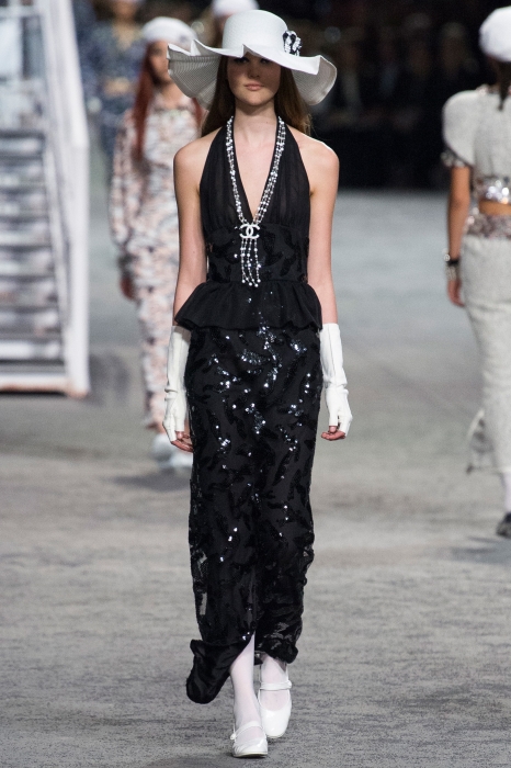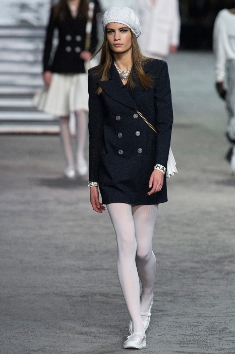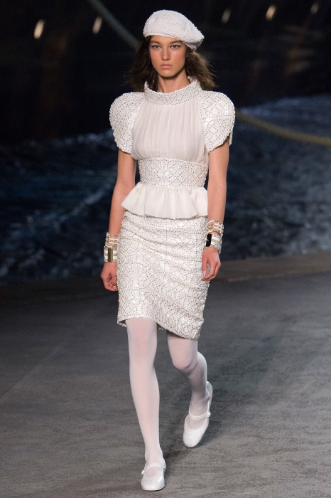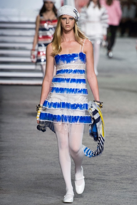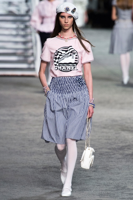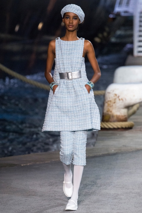 Пассажирками стали молодые богатые девушки: в фирменных твидовых костюмах с поправкой на жаркую погоду, удлиненных двубортных пиджаках, белоснежных комплектах с вместительными карманами и джинсовых жакетах, переливающихся в свете софитов. Намек на морскую тематику resort-коллекции был сделан еще на шоу pre-fall: на своей родине, в Гамбурге, Карл показал морские фуражки, синие бушлаты и свитеры с вышитыми якорями. В новой коллекции к ним добавились матросские береты, пляжные сумки, шелковые шарфы и широкополая шляпа как у Роуз Дьюитт Бьюкейтер, в которой девушка ступила на палубу самого известного лайнера в современной истории.