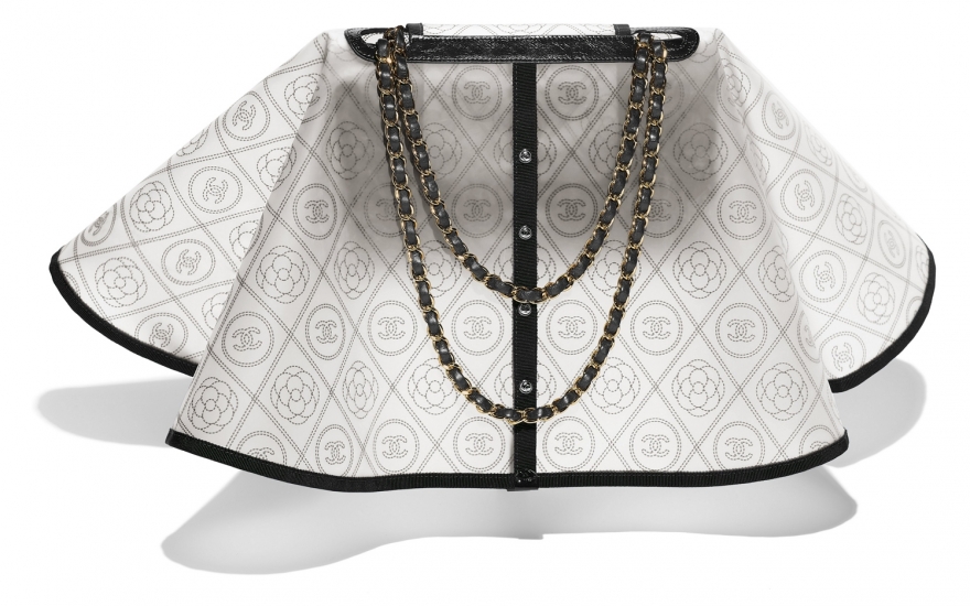 Сумка Chanel нарядилась в дождевик — и мы были бы тоже не прочь: отделка из черной кожи, принты камелии и логотипа дома, плюс фирменная позолоченная цепь. Носить даже под ослепительным солнцем! (Chanel)