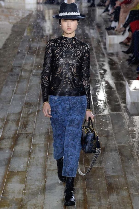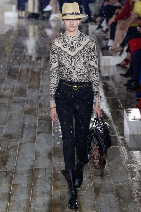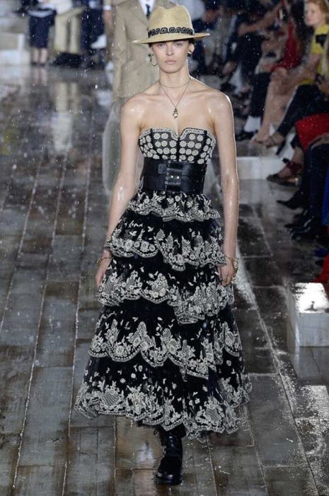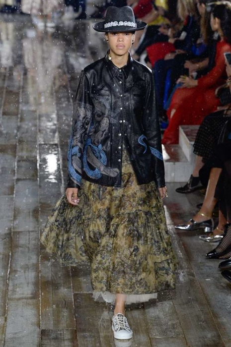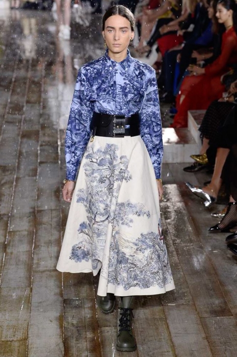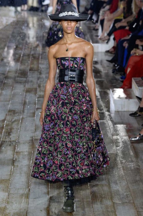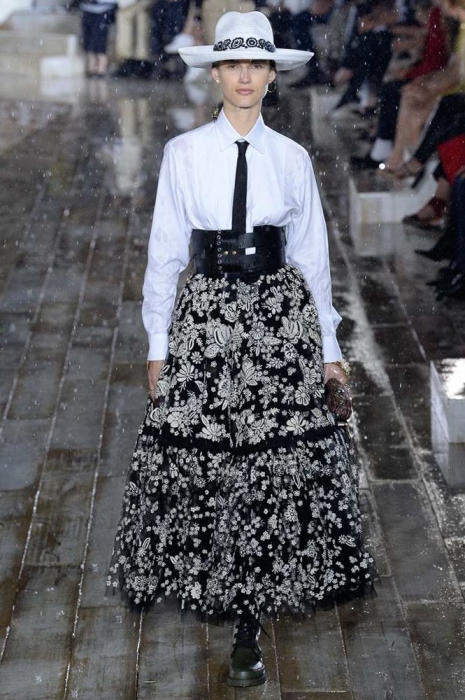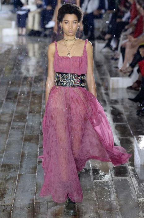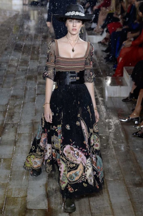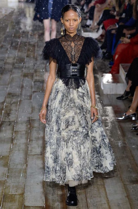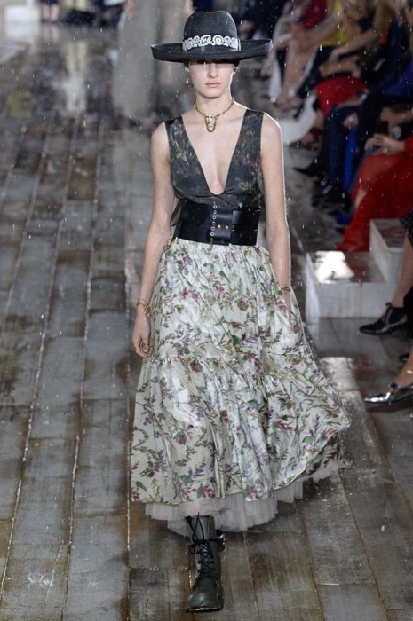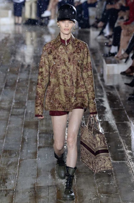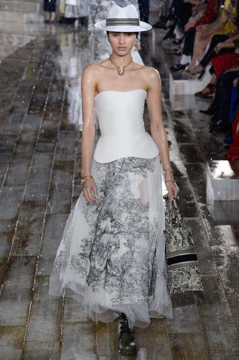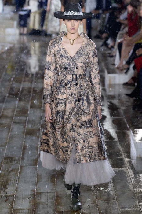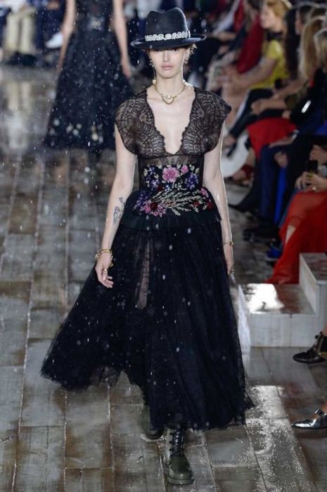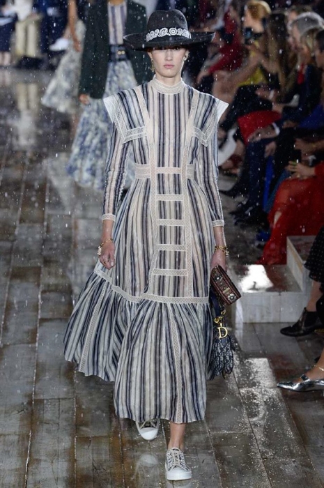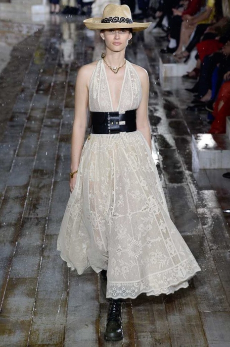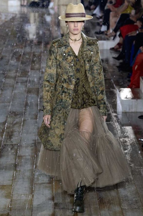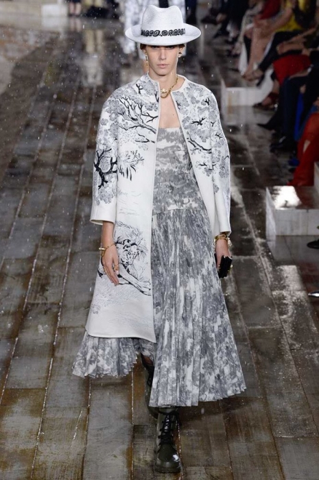 Ради показов круизных коллекций Dior выезжает за пределы родного Парижа: на этот раз фэшн-перфоманс прошел в конюшнях усадьбы Шантийи, в здании, построенном еще в XVIII столетии. Сет-дизайн был устроен самой природой: гости, модели и больше 80 луков в буквальном смысле мокли под проливным дождем. Все как завещала дизайнер бренда Мария Грация Кьюри, пожелавшая, чтобы гости шоу чувствовали себя в «какой-то экзотической локации».