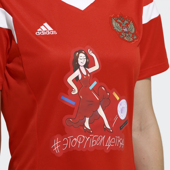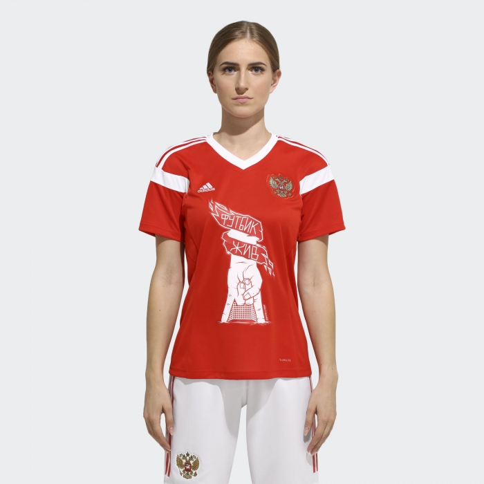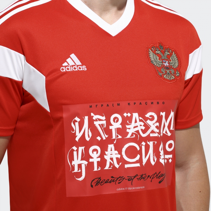 Теперь ярко-красные футболки с гербом России украшены надписями «СуперГуд» от Сергея Шнурова, «Футбик жив» от Юрия Дудя, «Это футбол, детка» от Ирины Горбачевой и фирменной каллиграфией от Покраса Лампаса. Вещи с эксклюзивными принтами уже можно купить на сайте Adidas за 4990 рублей.