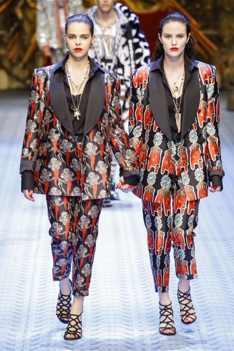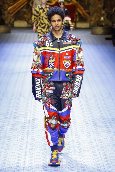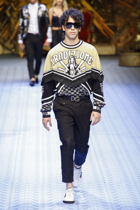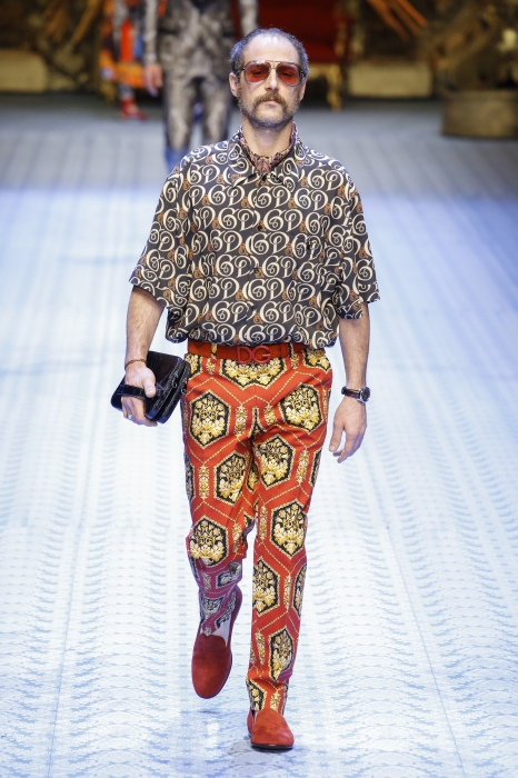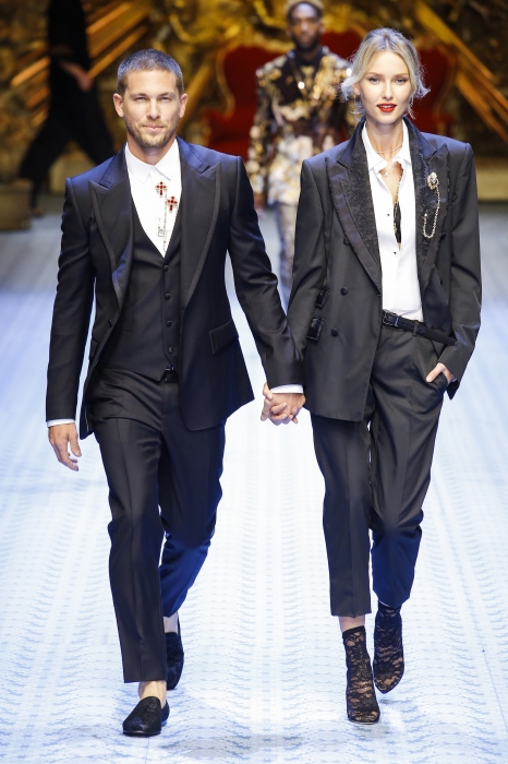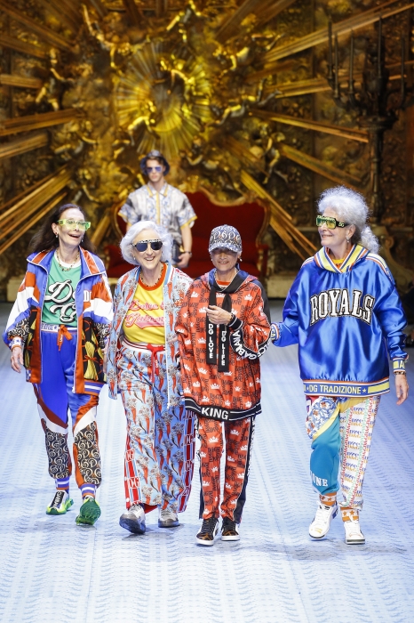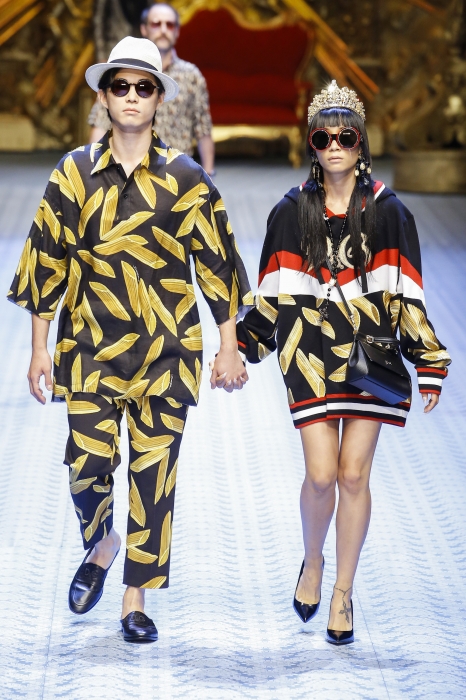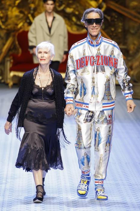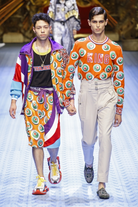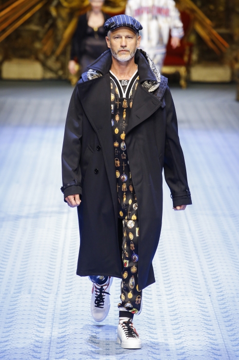 Другие герои мужского шоу — бабушки-хайпбисты в красочных толстовках с надписью «Royals», представители неравного брака в платьях-комбинациях и «религиозных» спортивных костюмах и семьянины в черных тренчкотах и рубашках с принтами-макаронами. Dolce & Gabbana продолжает придерживаться политики «семейного бренда» и концепции «наши наряды подходят каждому», приглашая для этого не только классических моделей, но и обычных людей.