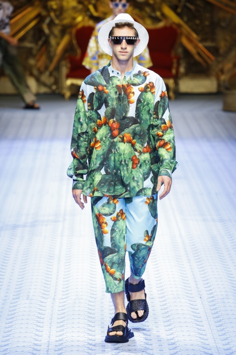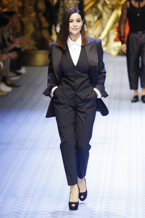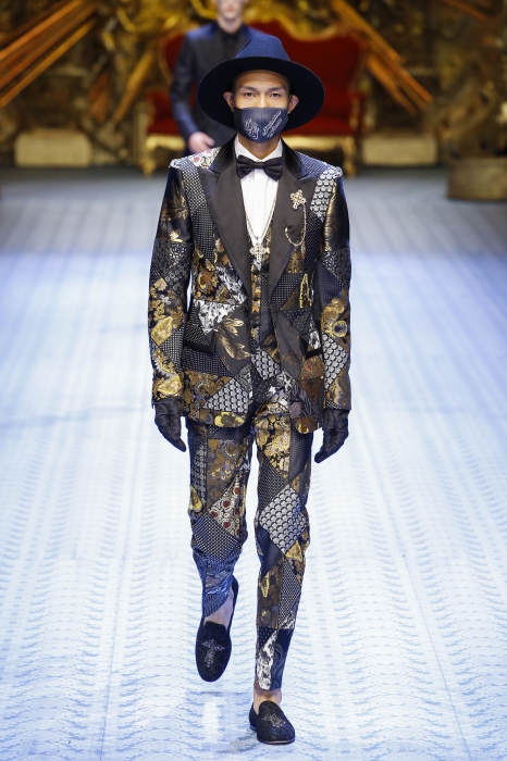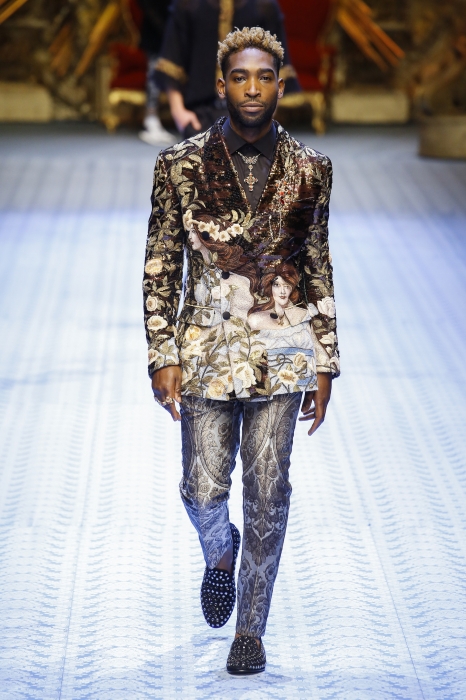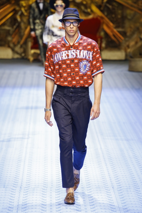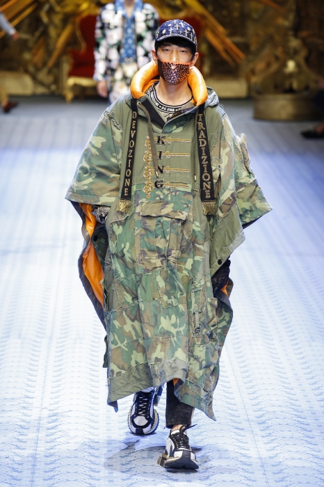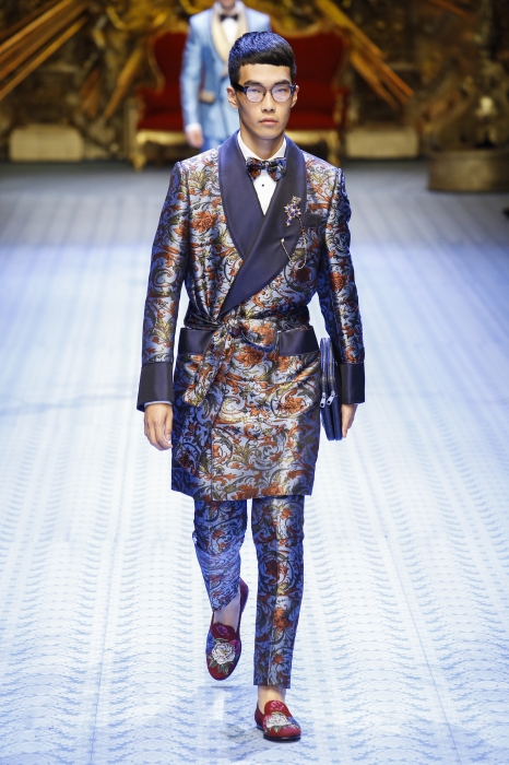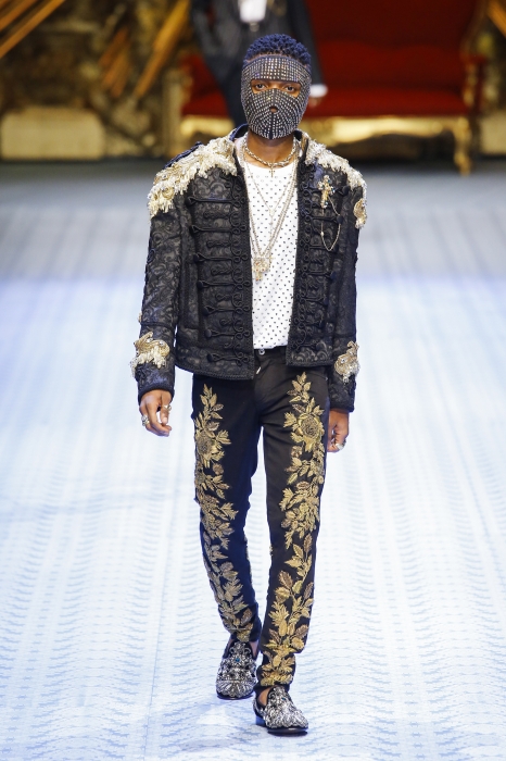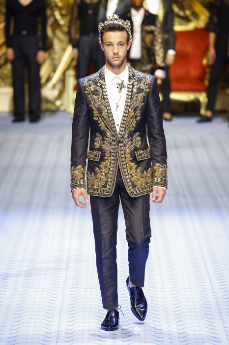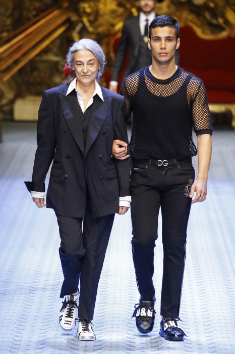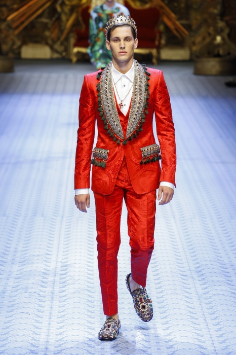 Другие герои мужского шоу — бабушки-хайпбисты в красочных толстовках с надписью «Royals», представители неравного брака в платьях-комбинациях и «религиозных» спортивных костюмах и семьянины в черных тренчкотах и рубашках с принтами-макаронами. Dolce & Gabbana продолжает придерживаться политики «семейного бренда» и концепции «наши наряды подходят каждому», приглашая для этого не только классических моделей, но и обычных людей.