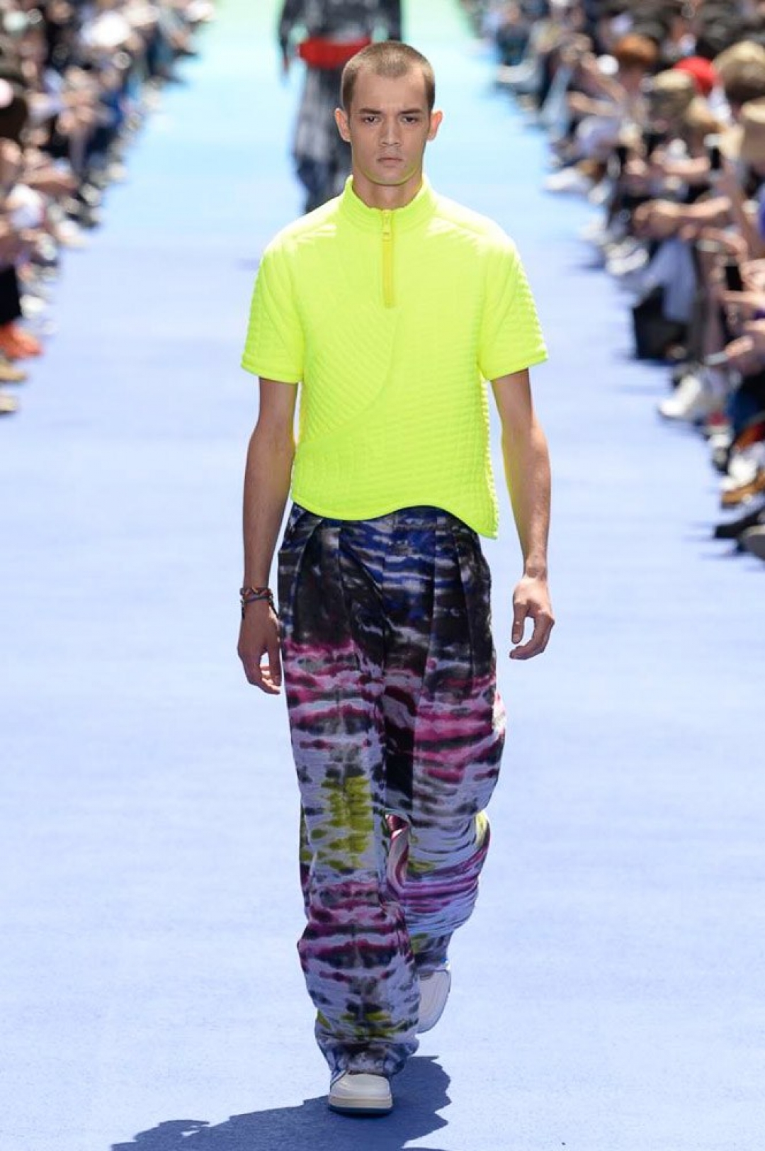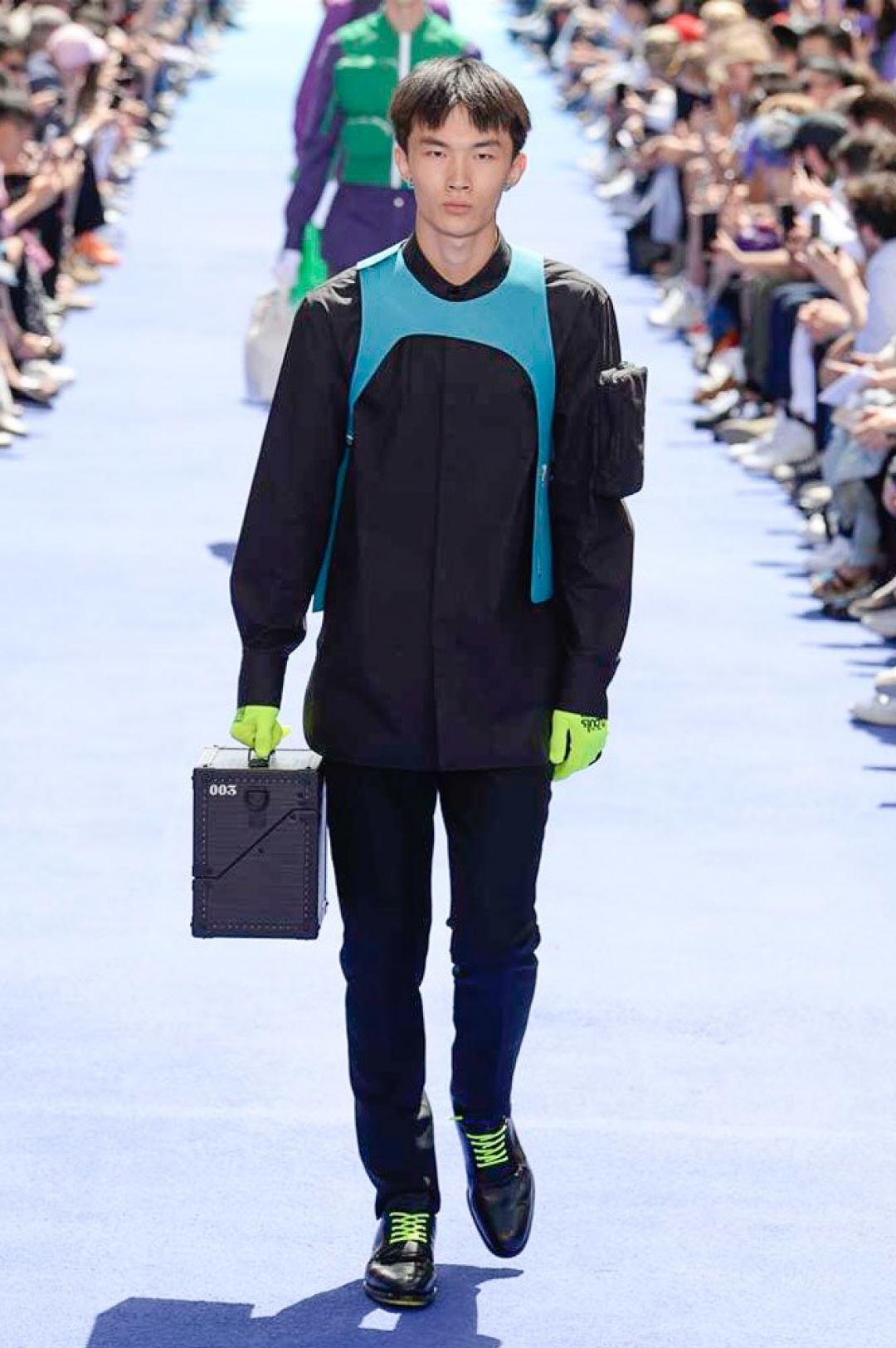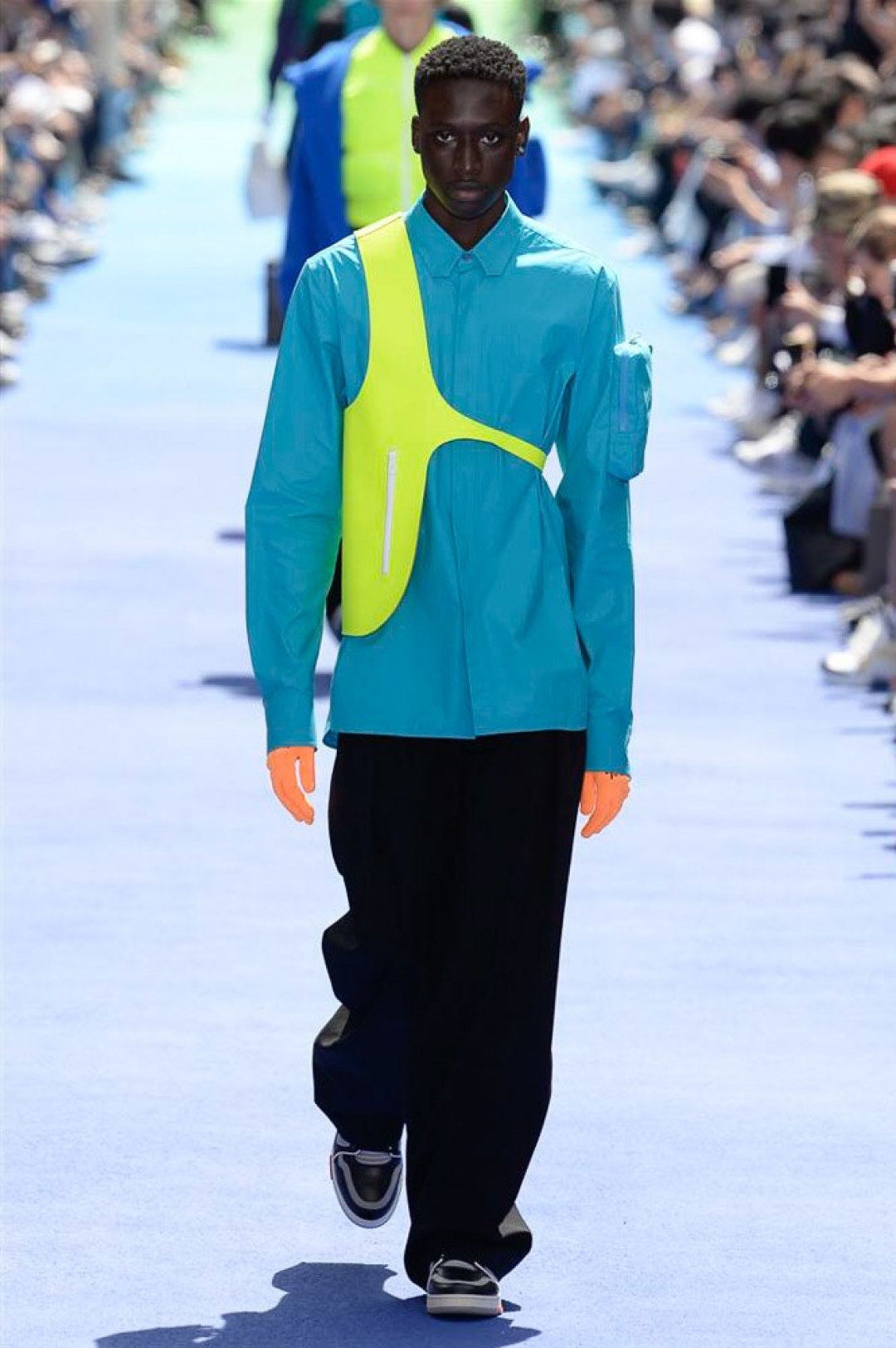 После нескольких выходов в total-white Вирджил вывел на подиум любимые кислотные оттенки. Они окрасили футболки с «неровными» краями, брюки свободного кроя, оверсайзовые рубашки, трикотажные перчатки и жилеты как у инкассаторов. На то, что именно они стали инспирейшеном дизайнера, намекают и сумки-сундуки с номерными знаками — архитектурные модели продолжили идеи Николя Гескьера для женской линии Louis Vuitton.