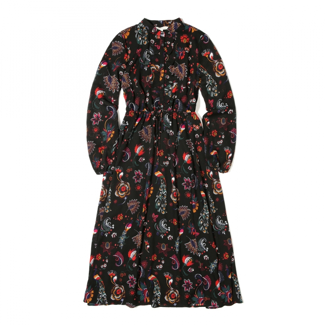 Одни из самых красивых и универсальных элементов коллекции — платья. За первое отвечают красочные цветочные принты, за второе — сочетаемость как с зимней, так и с летней одеждой.