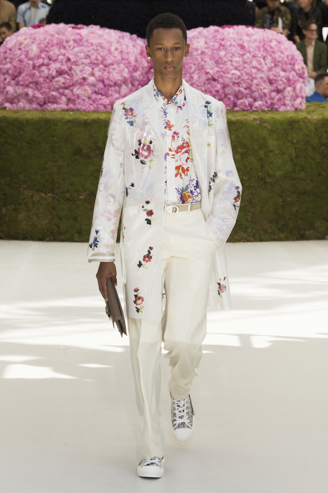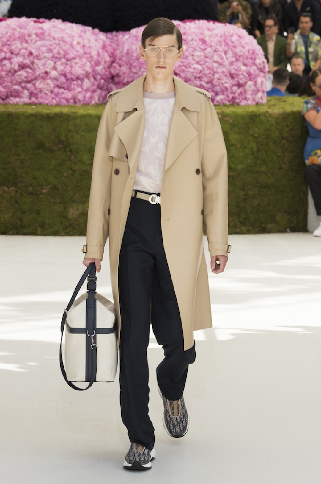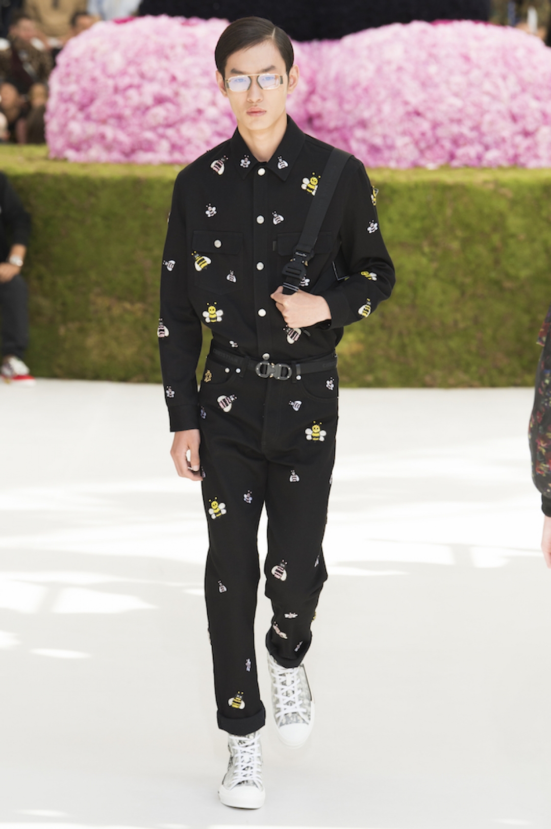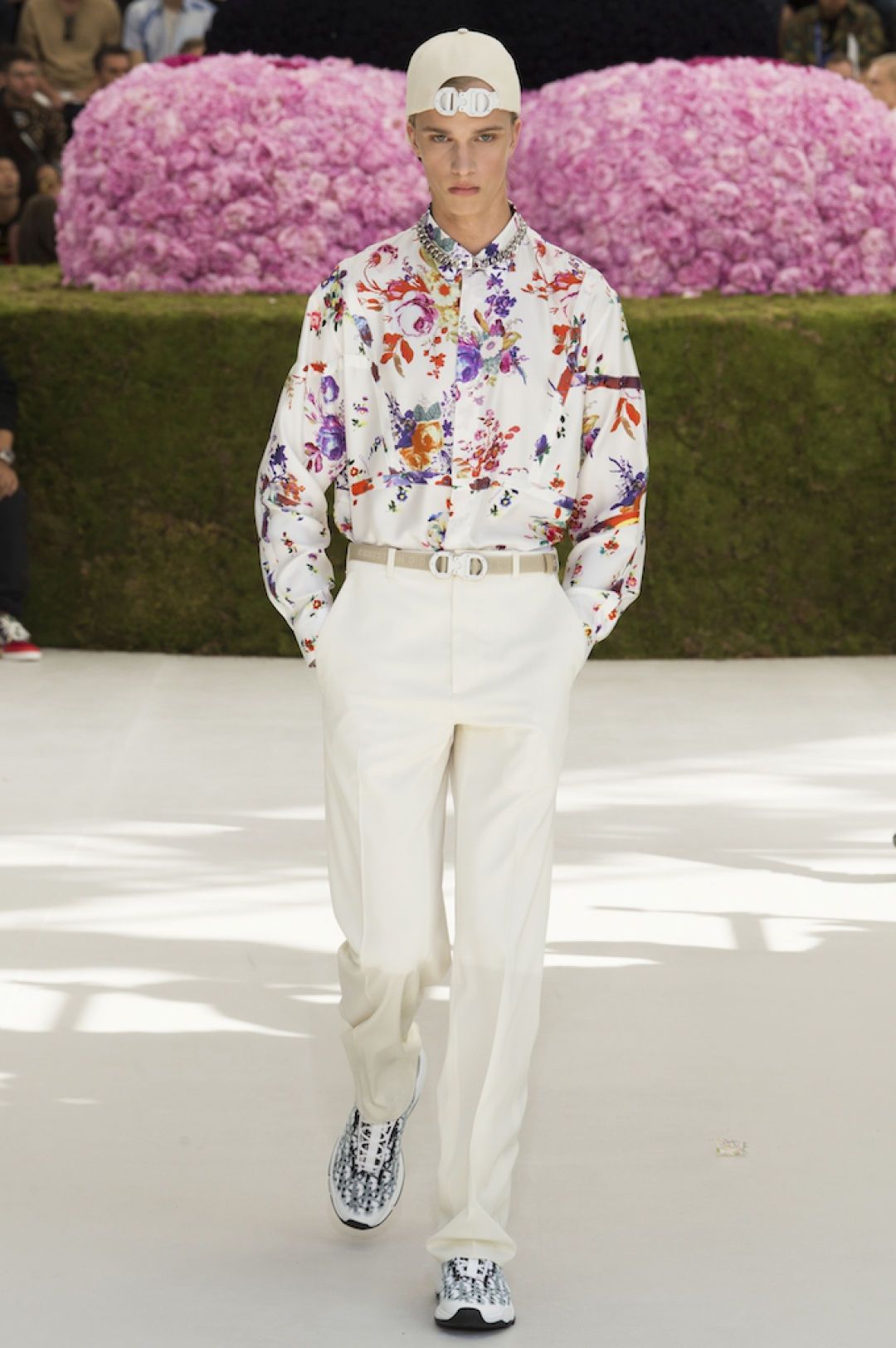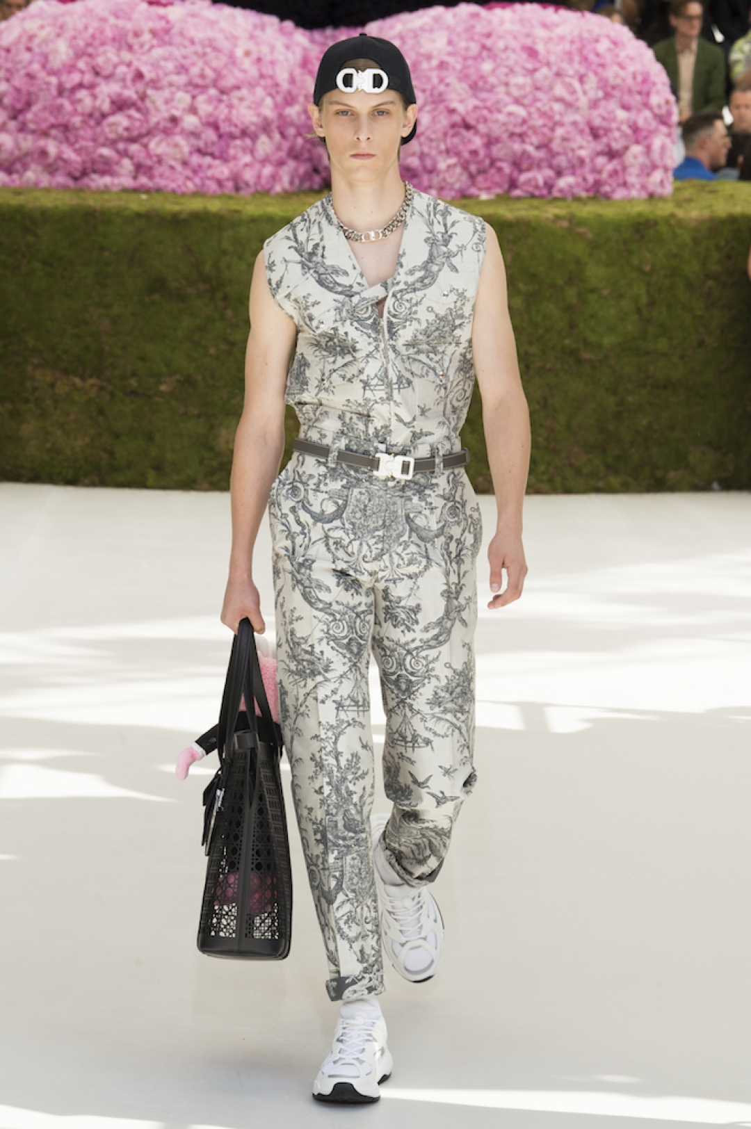 Бывший креативный директор Louis Vuitton Ким Джонс показал первую мужскую коллекцию для Dior — в исторических казармах Республиканской гвардии, украшенных 70 000 цветов и гигантской мультяшной скульптурой от KAWS. Этот ироничный элемент, о котором было известно еще за несколько часов до показа (с похожими на сет-дизайн игрушками в «инстаграме» Джонса позировали Ким Кардашьян и Белла Хадид), в коллекции проявился локально: например, в брелоках в руках моделей или в наполнении сетчатых сумок. В остальном же вещи базировались на двух аспектах: архивах женской кутюрной линии Christian Dior и личности человека, обожающего цветы, дизайн интерьера и домашних питомцев.