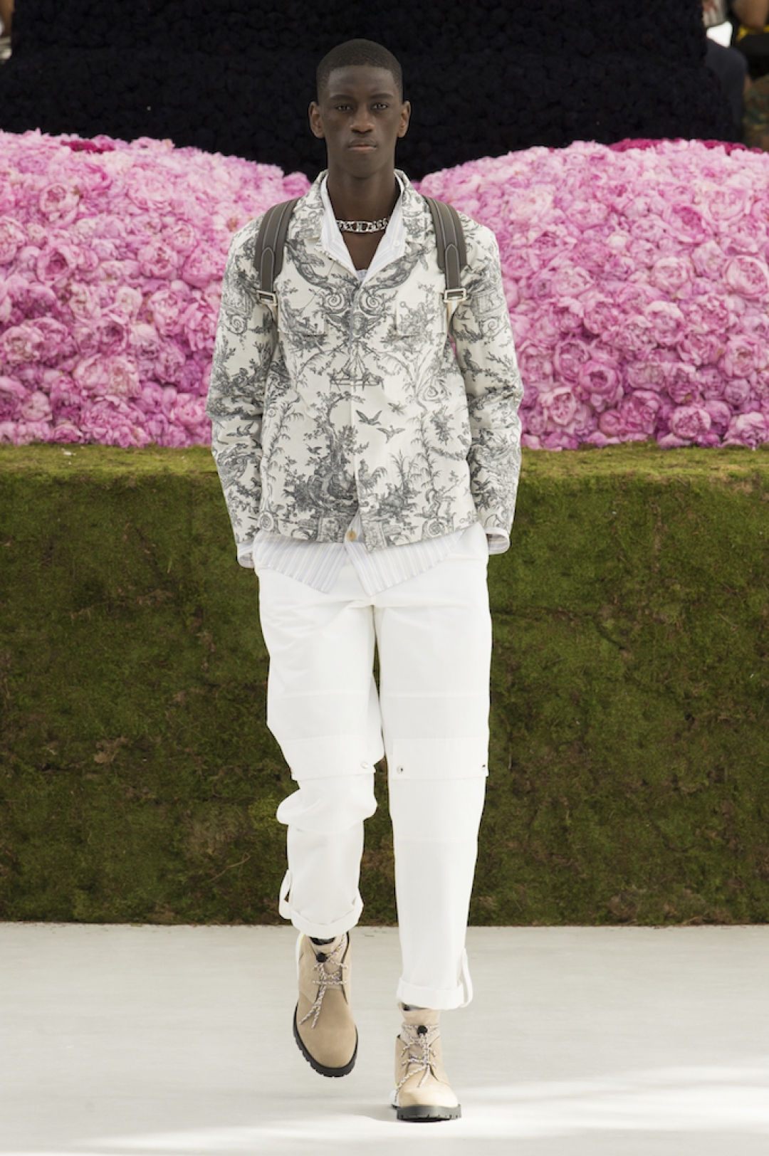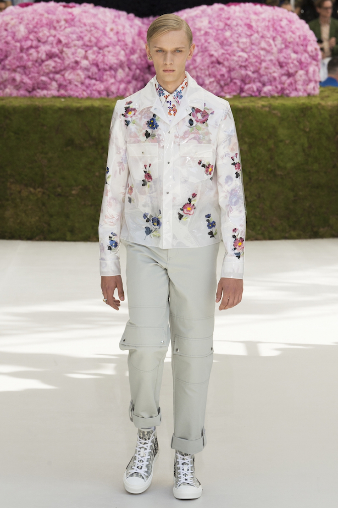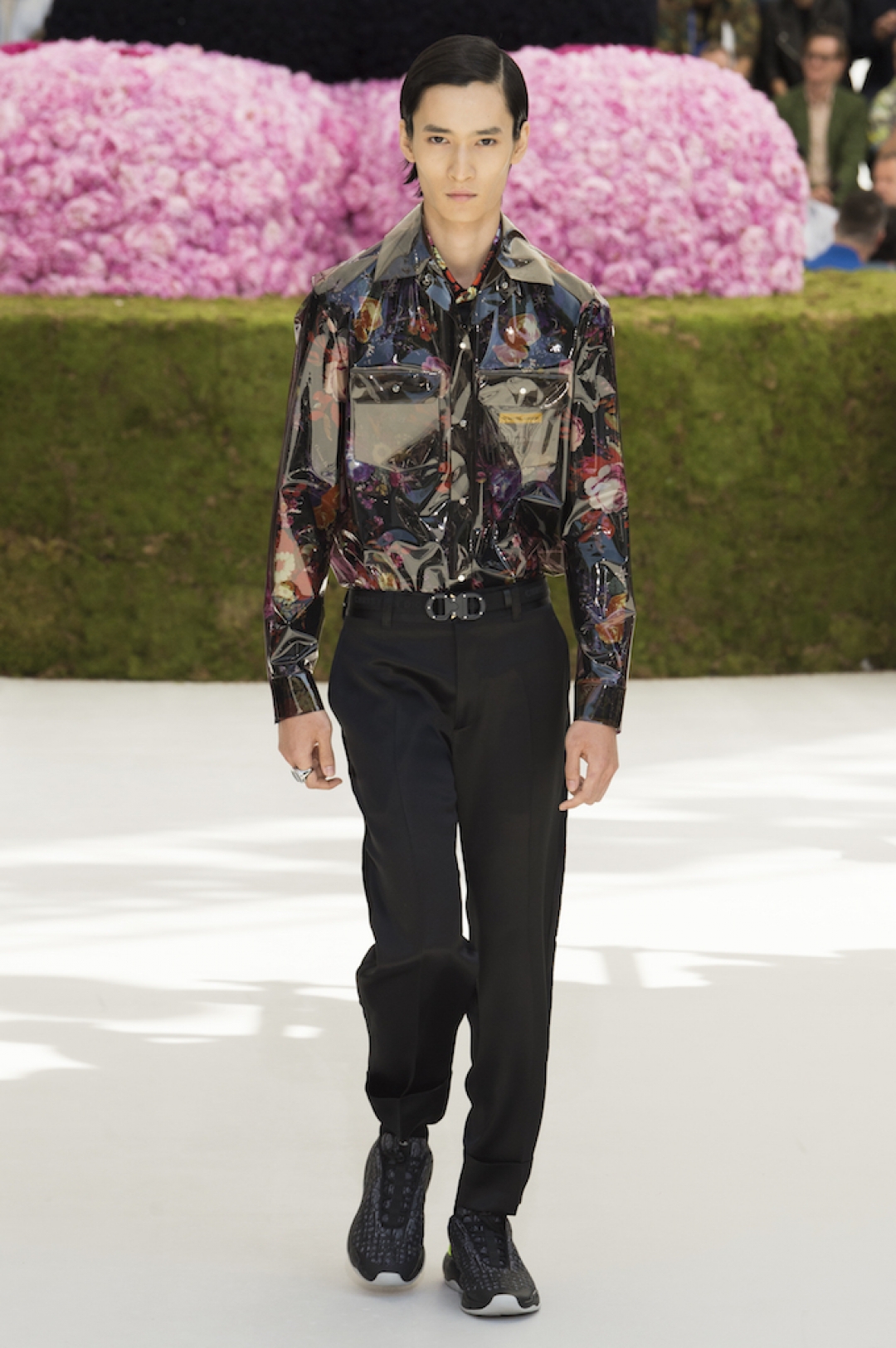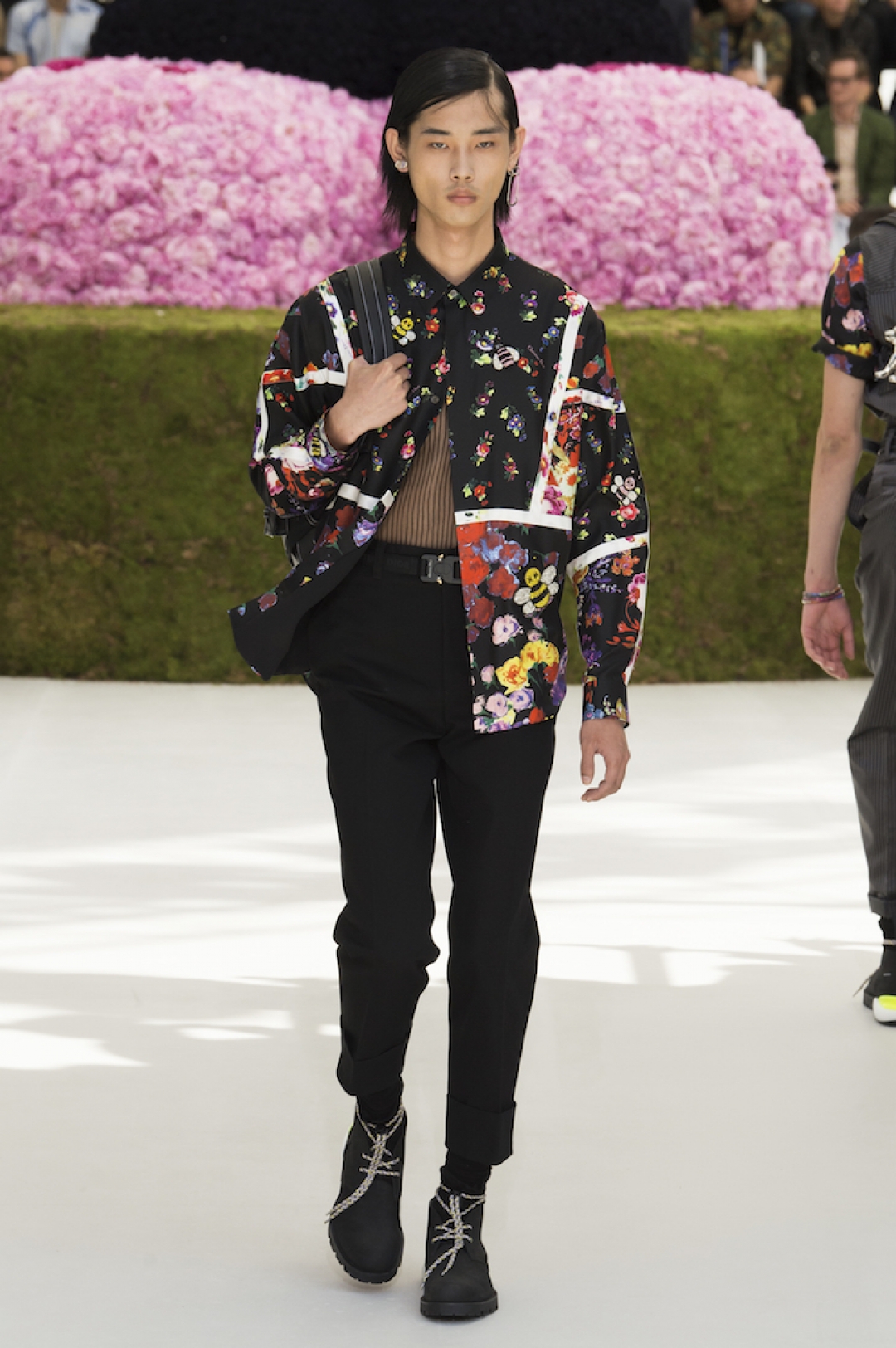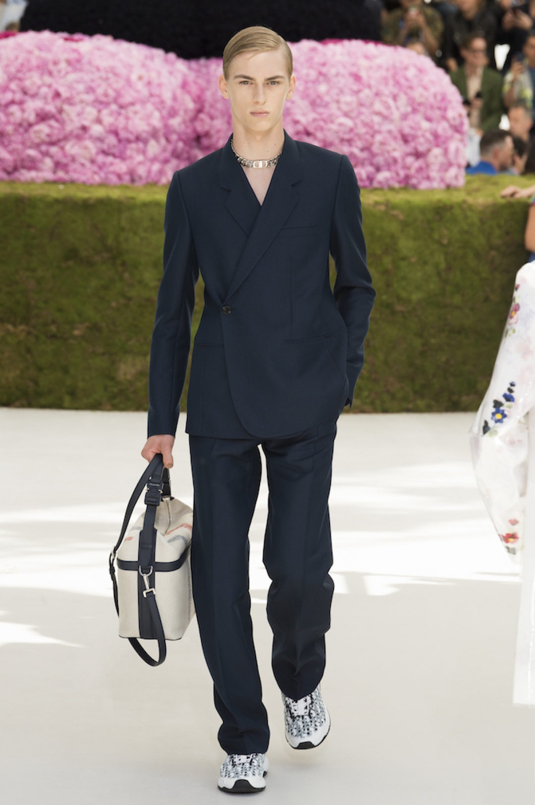 Бывший креативный директор Louis Vuitton Ким Джонс показал первую мужскую коллекцию для Dior — в исторических казармах Республиканской гвардии, украшенных 70 000 цветов и гигантской мультяшной скульптурой от KAWS. Этот ироничный элемент, о котором было известно еще за несколько часов до показа (с похожими на сет-дизайн игрушками в «инстаграме» Джонса позировали Ким Кардашьян и Белла Хадид), в коллекции проявился локально: например, в брелоках в руках моделей или в наполнении сетчатых сумок. В остальном же вещи базировались на двух аспектах: архивах женской кутюрной линии Christian Dior и личности человека, обожающего цветы, дизайн интерьера и домашних питомцев.