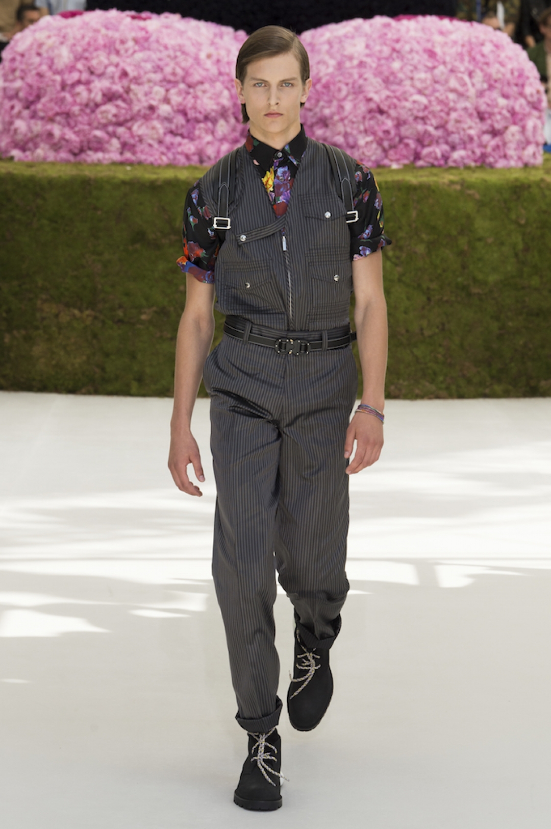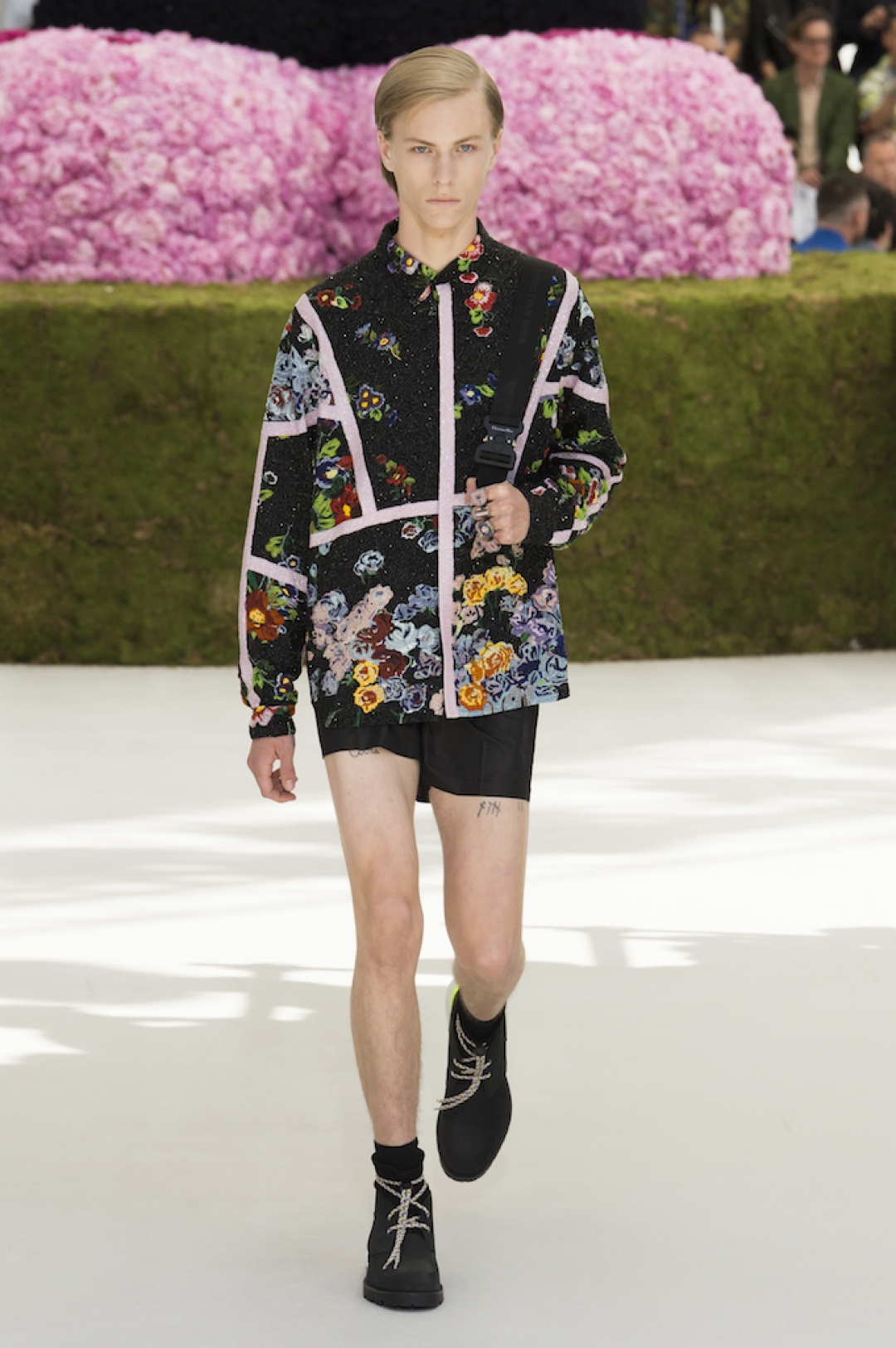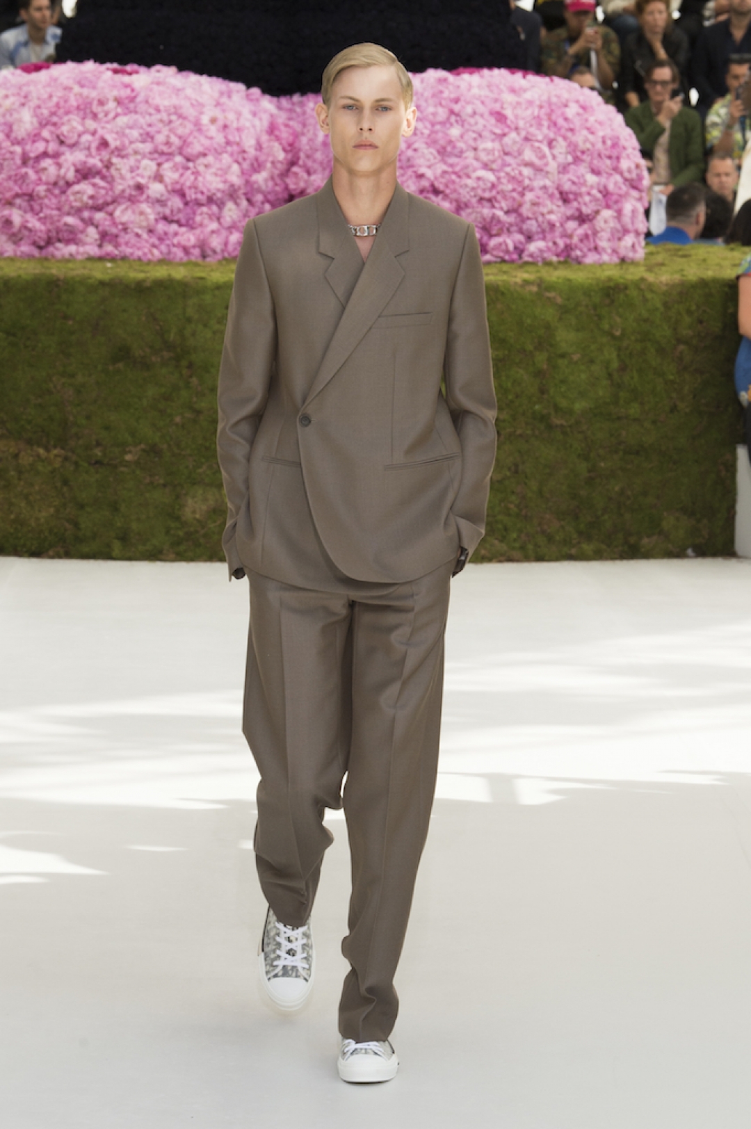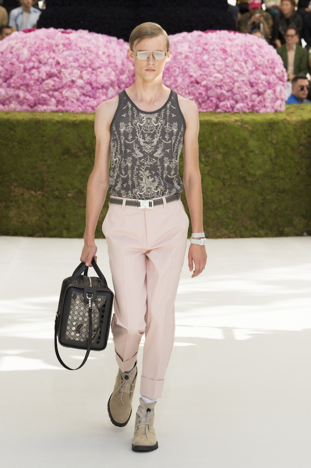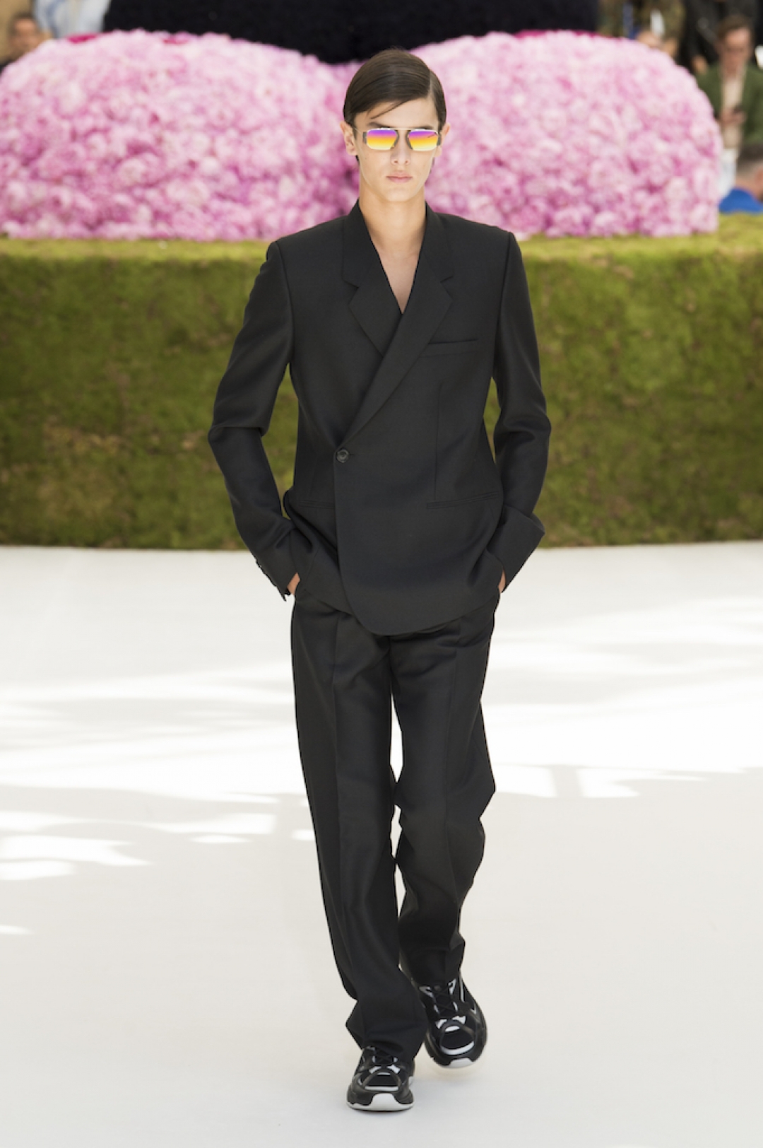 Бывший креативный директор Louis Vuitton Ким Джонс показал первую мужскую коллекцию для Dior — в исторических казармах Республиканской гвардии, украшенных 70 000 цветов и гигантской мультяшной скульптурой от KAWS. Этот ироничный элемент, о котором было известно еще за несколько часов до показа (с похожими на сет-дизайн игрушками в «инстаграме» Джонса позировали Ким Кардашьян и Белла Хадид), в коллекции проявился локально: например, в брелоках в руках моделей или в наполнении сетчатых сумок. В остальном же вещи базировались на двух аспектах: архивах женской кутюрной линии Christian Dior и личности человека, обожающего цветы, дизайн интерьера и домашних питомцев.