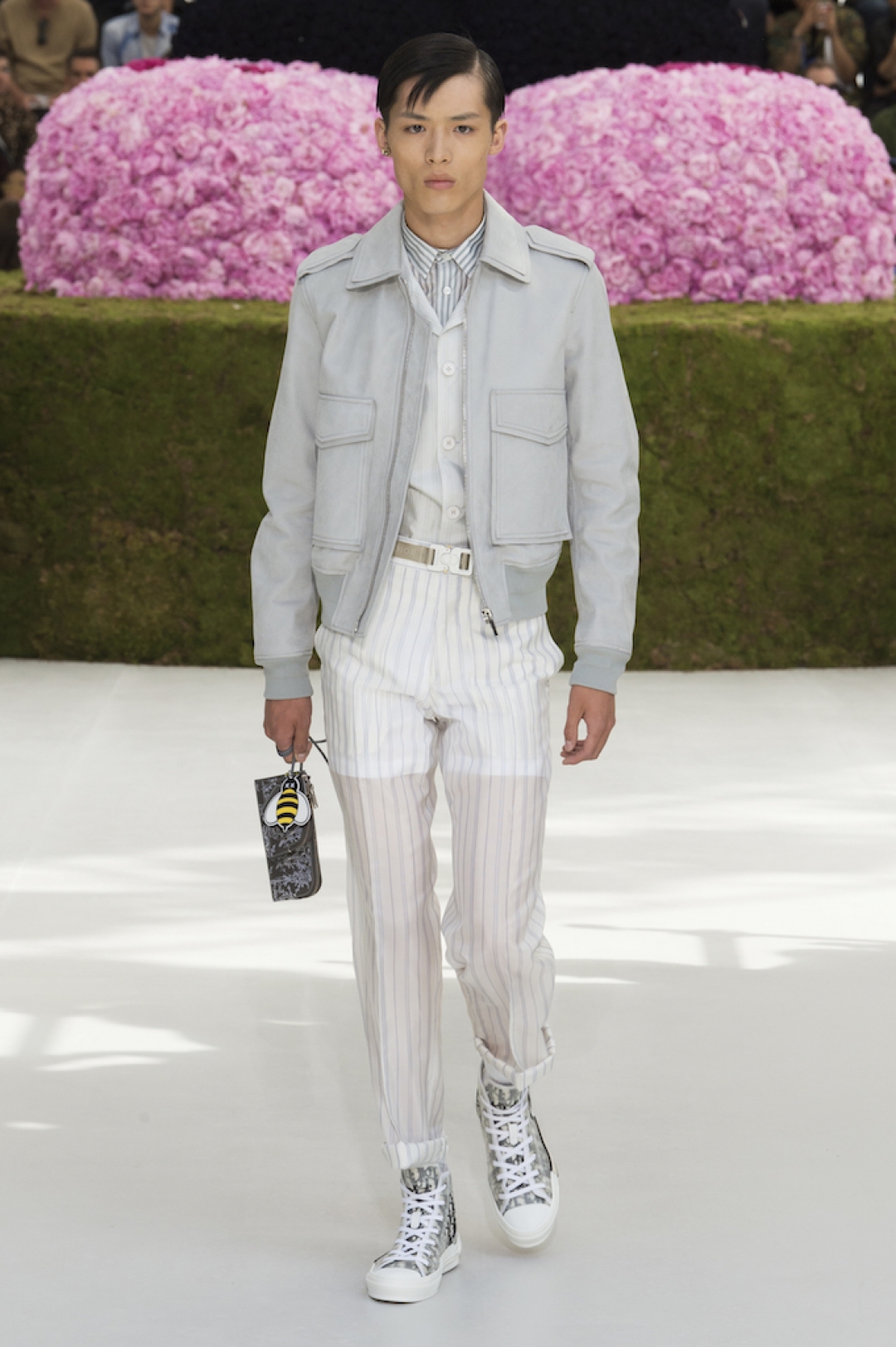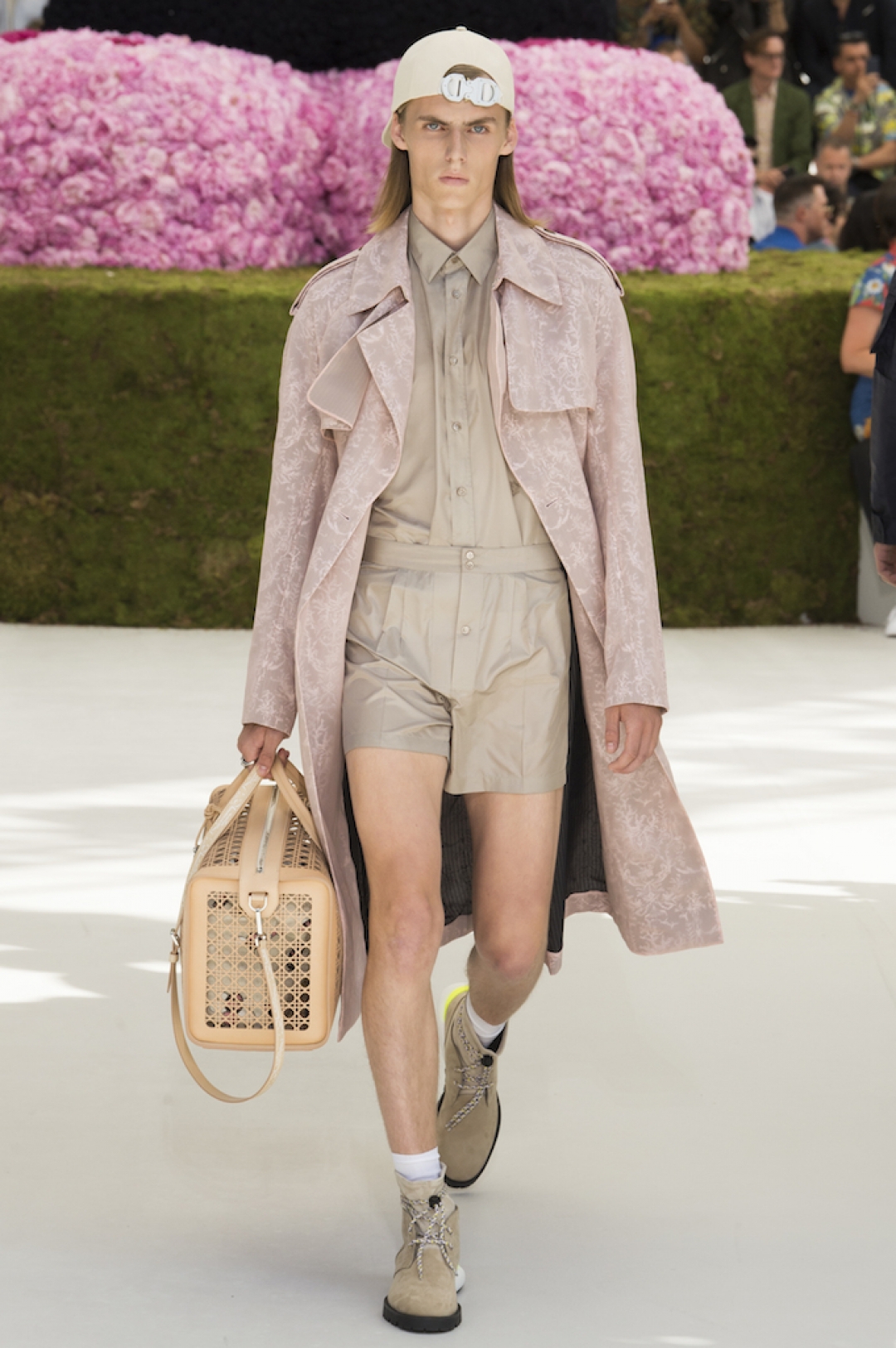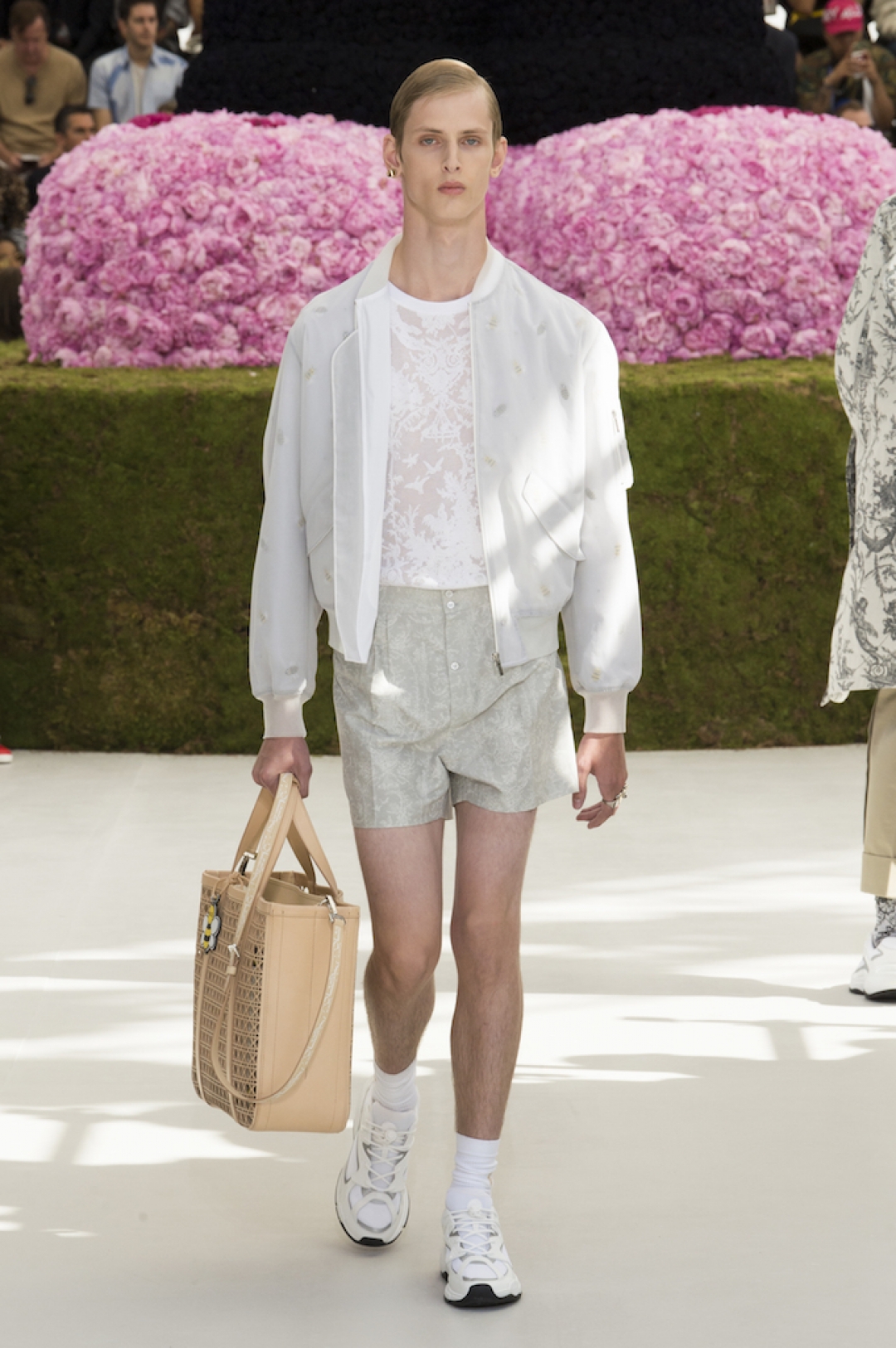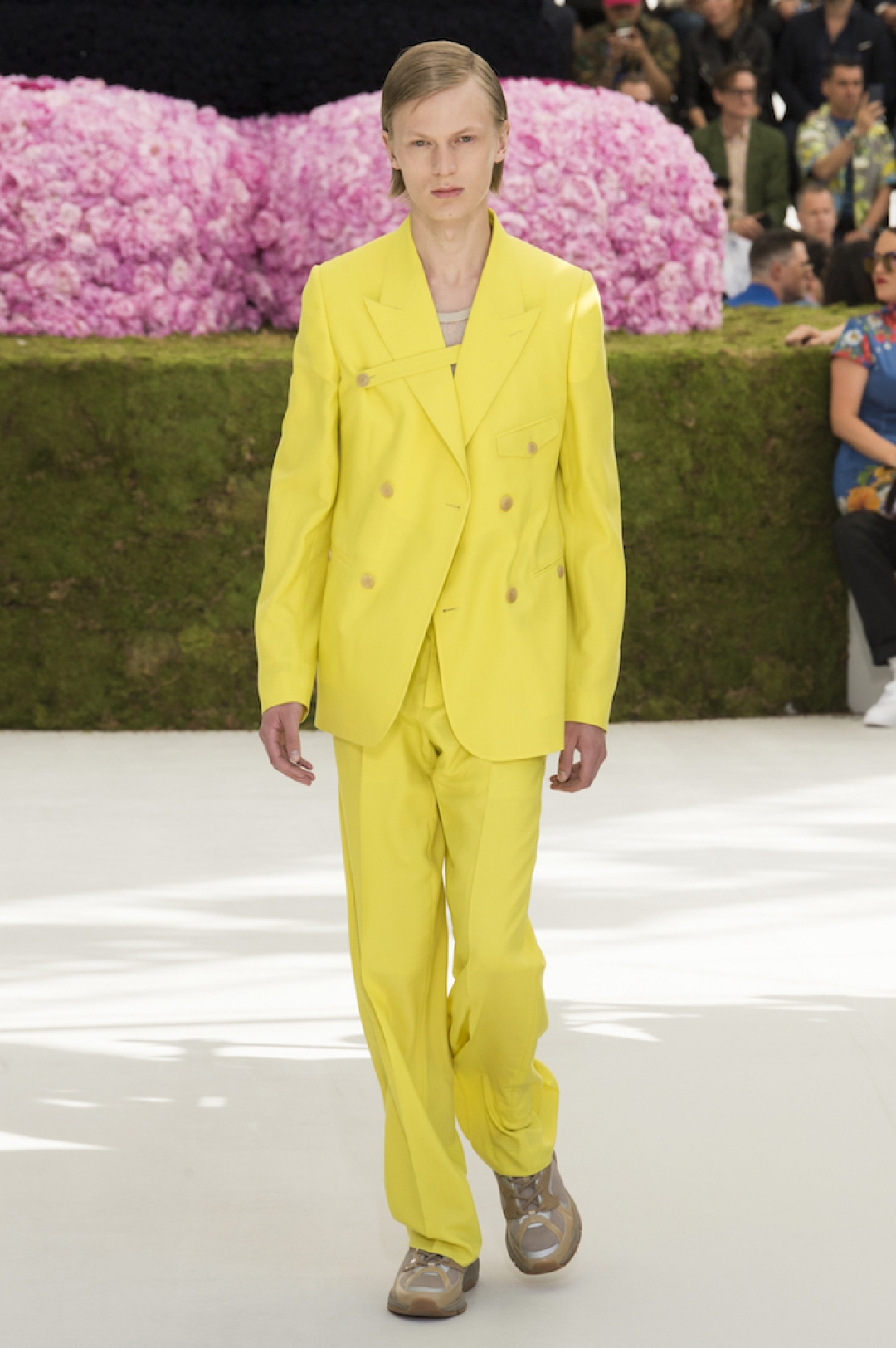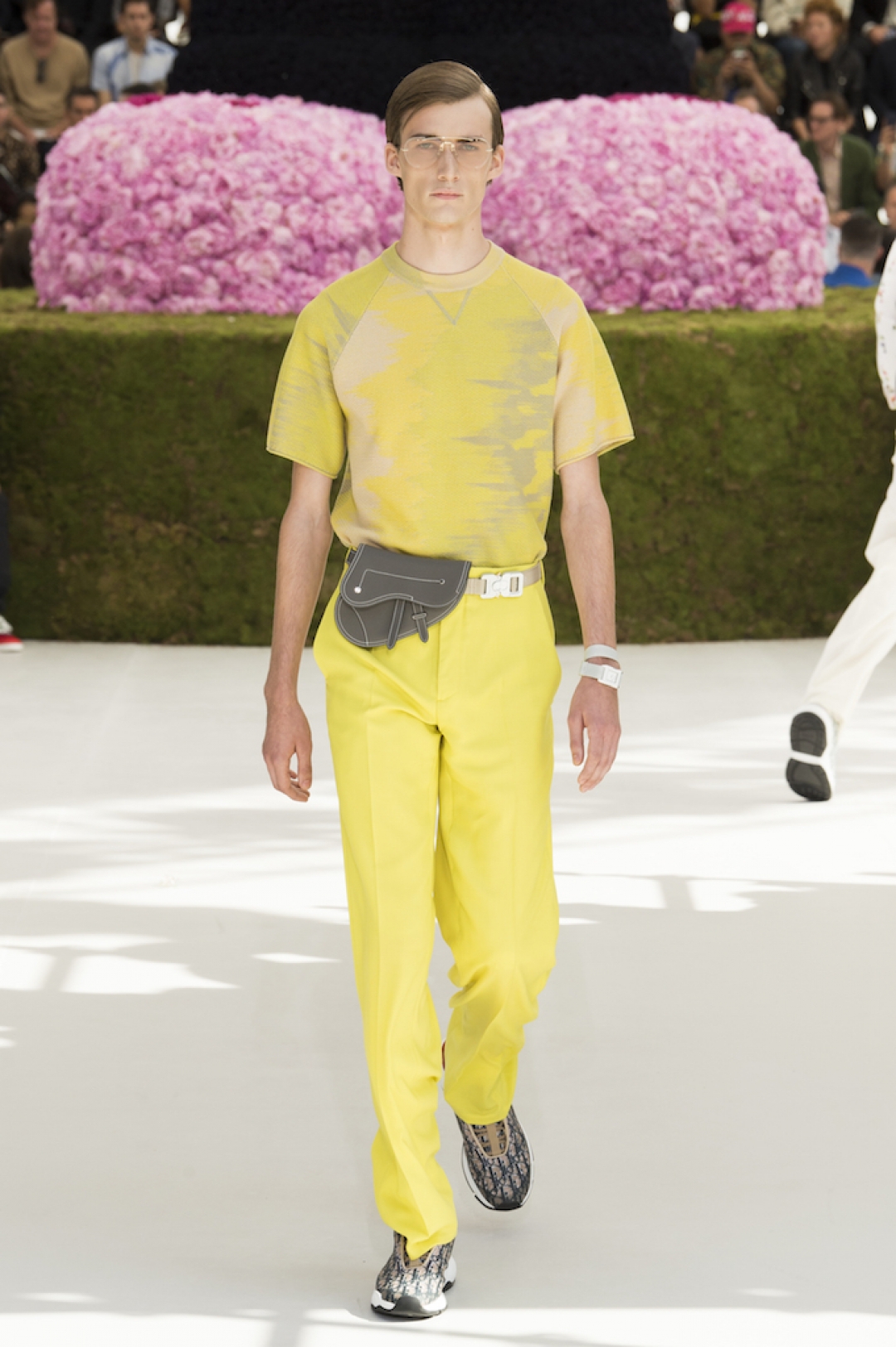 Бывший креативный директор Louis Vuitton Ким Джонс показал первую мужскую коллекцию для Dior — в исторических казармах Республиканской гвардии, украшенных 70 000 цветов и гигантской мультяшной скульптурой от KAWS. Этот ироничный элемент, о котором было известно еще за несколько часов до показа (с похожими на сет-дизайн игрушками в «инстаграме» Джонса позировали Ким Кардашьян и Белла Хадид), в коллекции проявился локально: например, в брелоках в руках моделей или в наполнении сетчатых сумок. В остальном же вещи базировались на двух аспектах: архивах женской кутюрной линии Christian Dior и личности человека, обожающего цветы, дизайн интерьера и домашних питомцев.