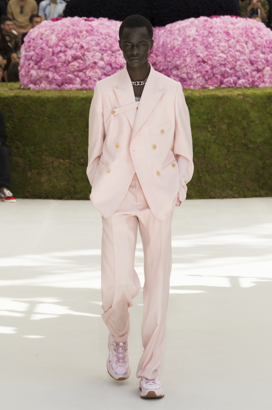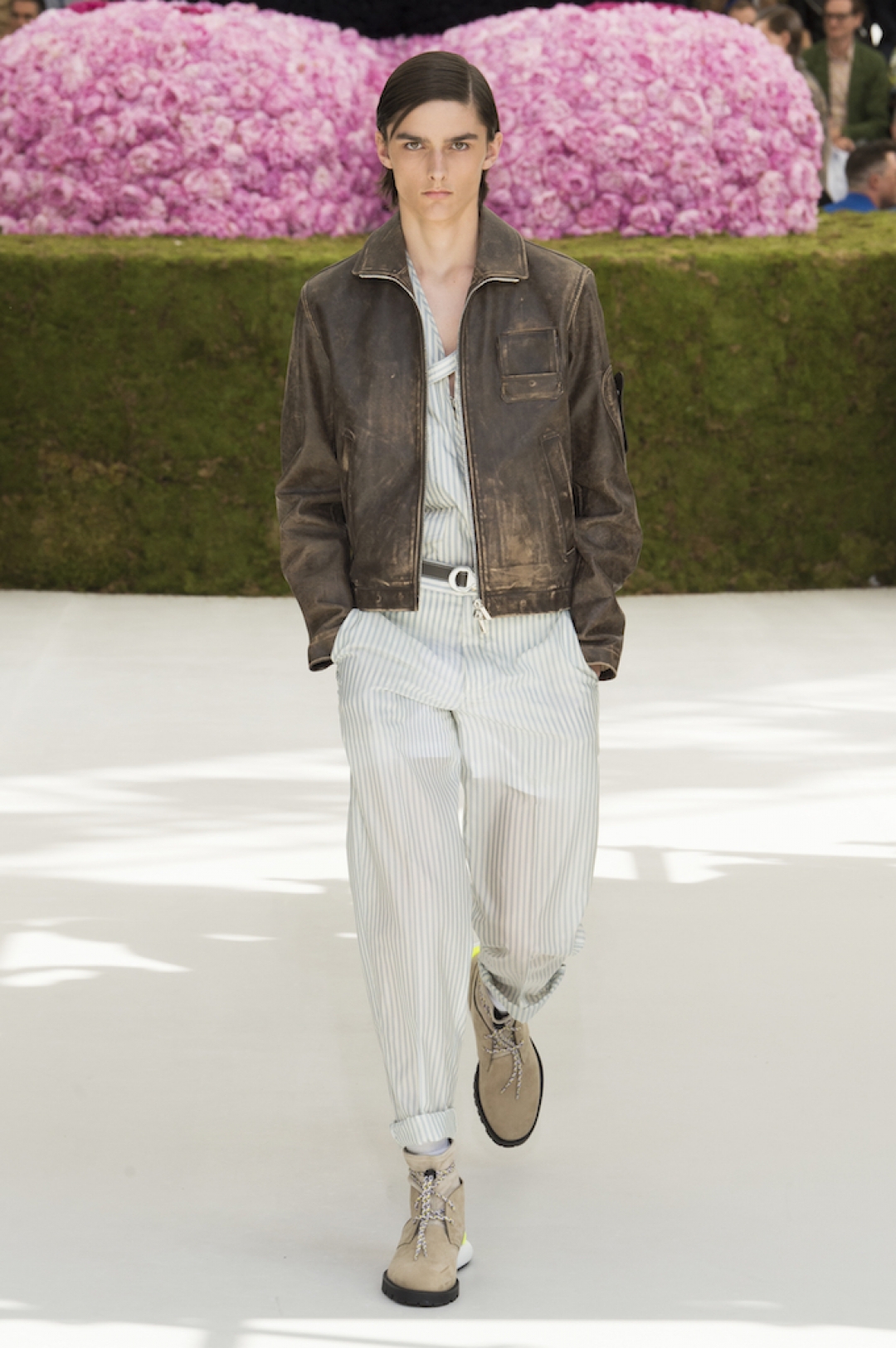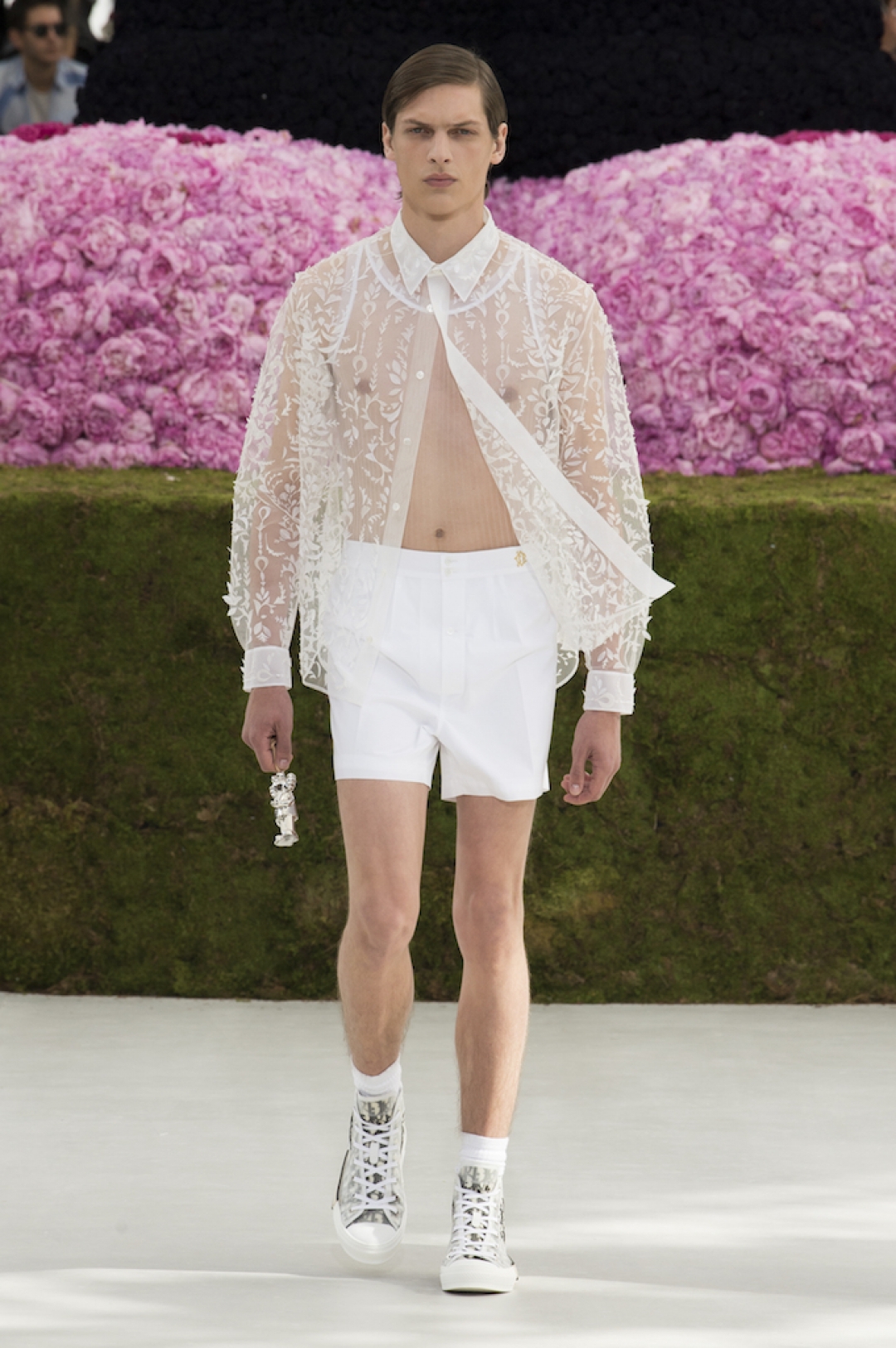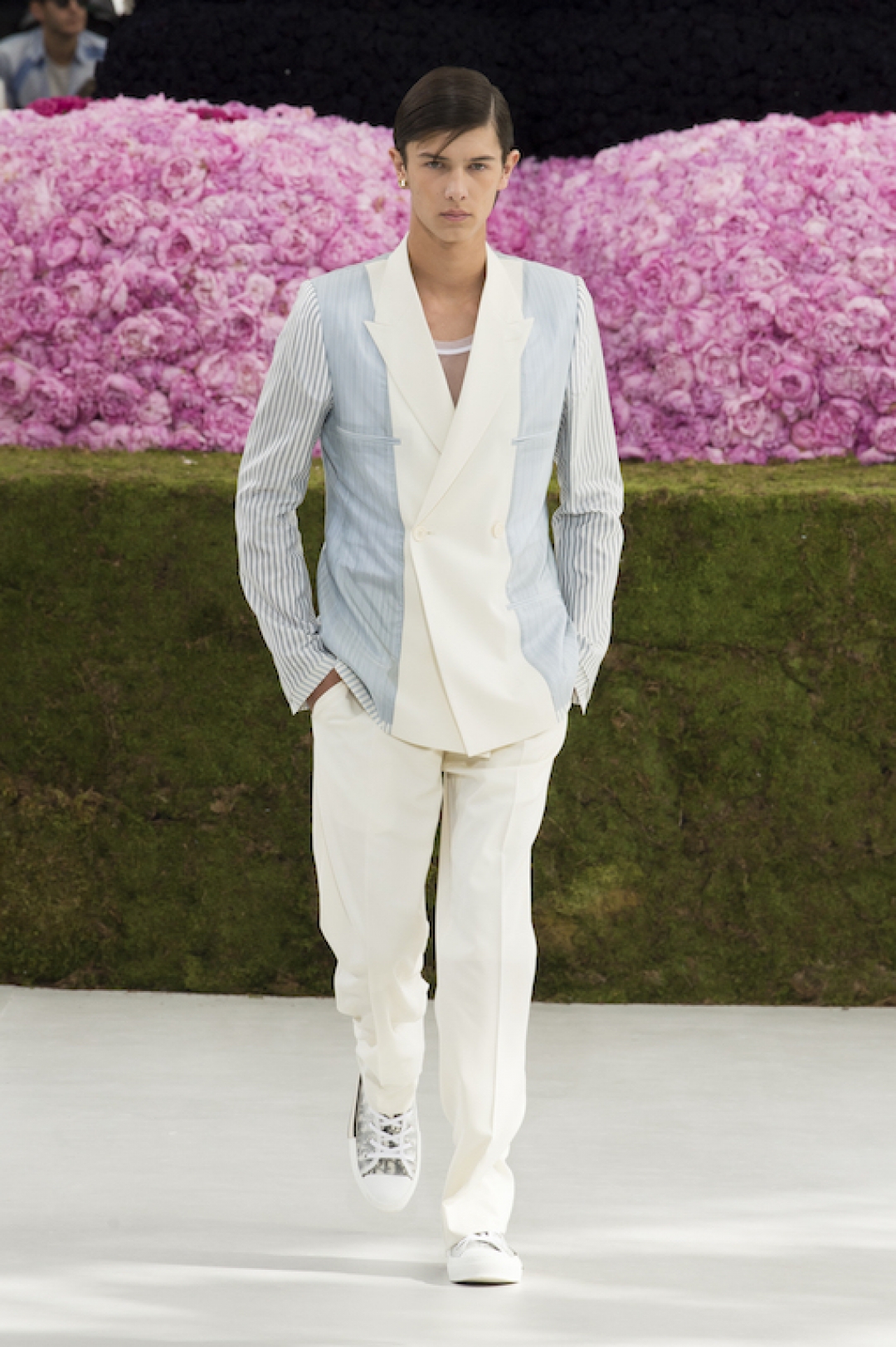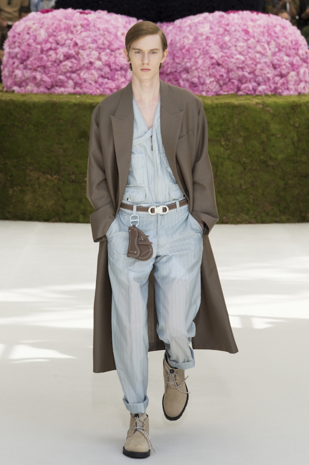 Бывший креативный директор Louis Vuitton Ким Джонс показал первую мужскую коллекцию для Dior — в исторических казармах Республиканской гвардии, украшенных 70 000 цветов и гигантской мультяшной скульптурой от KAWS. Этот ироничный элемент, о котором было известно еще за несколько часов до показа (с похожими на сет-дизайн игрушками в «инстаграме» Джонса позировали Ким Кардашьян и Белла Хадид), в коллекции проявился локально: например, в брелоках в руках моделей или в наполнении сетчатых сумок. В остальном же вещи базировались на двух аспектах: архивах женской кутюрной линии Christian Dior и личности человека, обожающего цветы, дизайн интерьера и домашних питомцев.