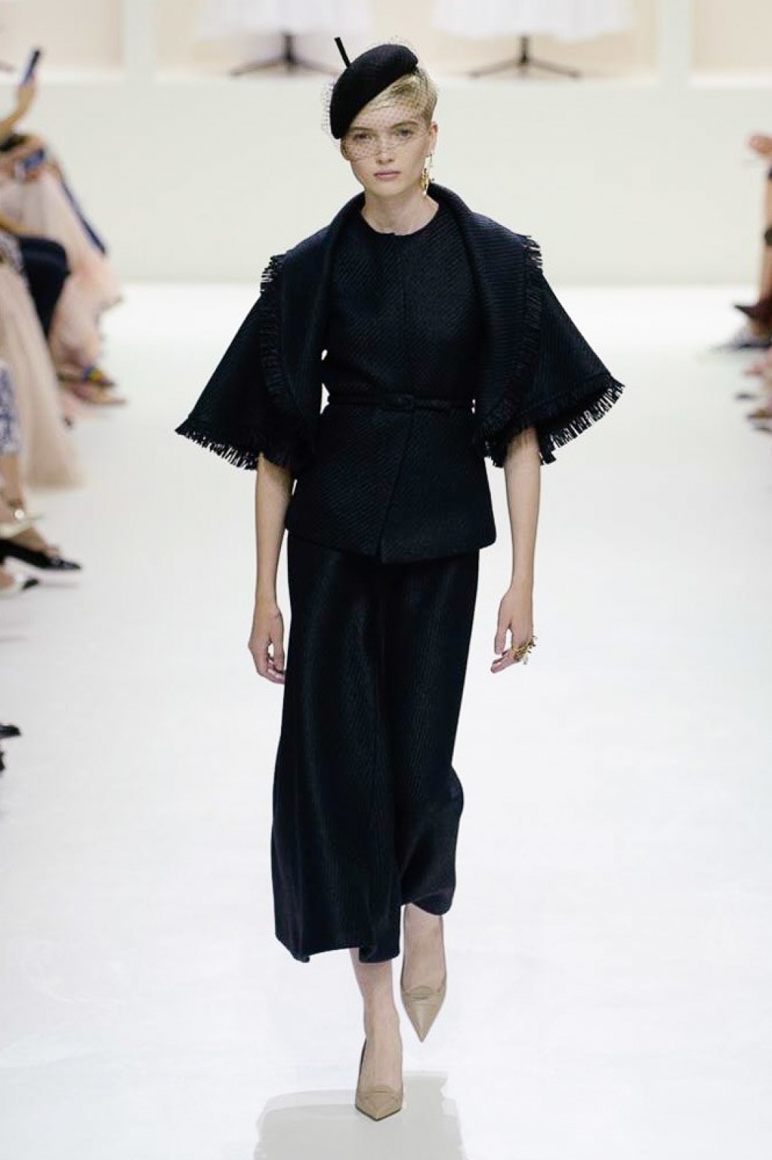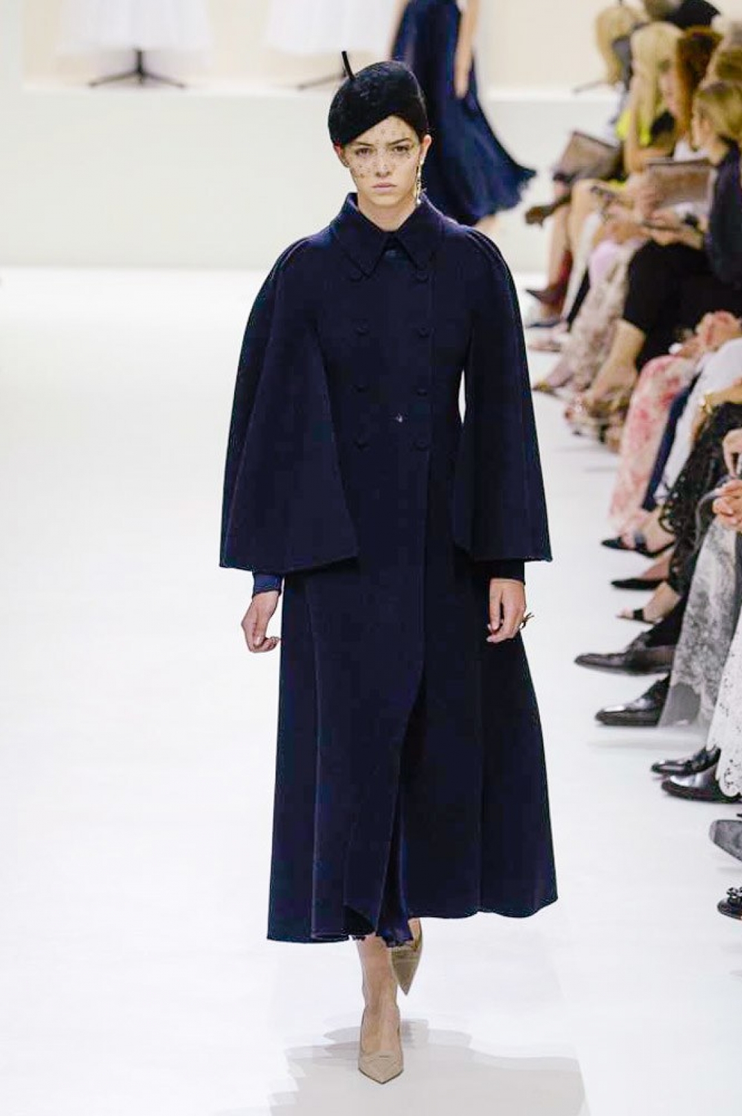 После бежевых тотал-луков начался калейдоскоп цвета, шелка и богатой вышивки: красные «обнимающие» платья на красивейших африканках, оливковые наряды А-силуэта, оттеняющие бледную кожу, а еще темно-синие костюмы с расклешенными рукавами — точь-в-точь как в картинах мастодонтов французской режиссуры. Закрыла показ модель с дредами, которые, кажется, ворвались в Высокую моду — чувствуем влияние Рианны, появившейся в вечернем платье и с такой же прической на Met Gala в фильме «8 подруг Оушена».