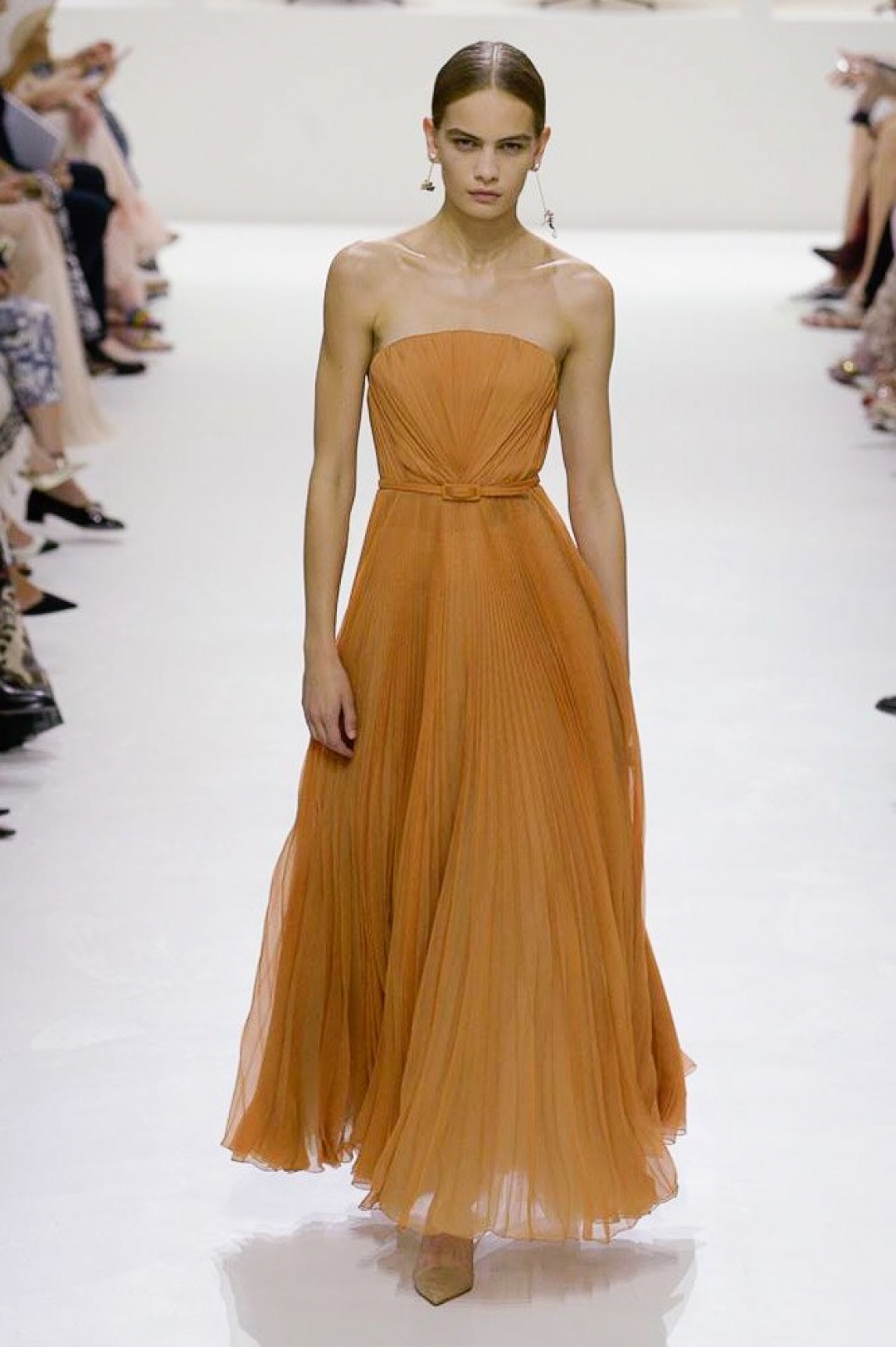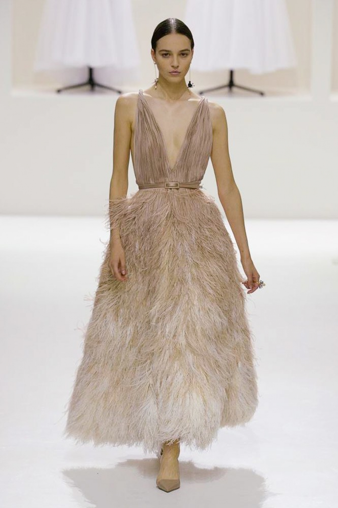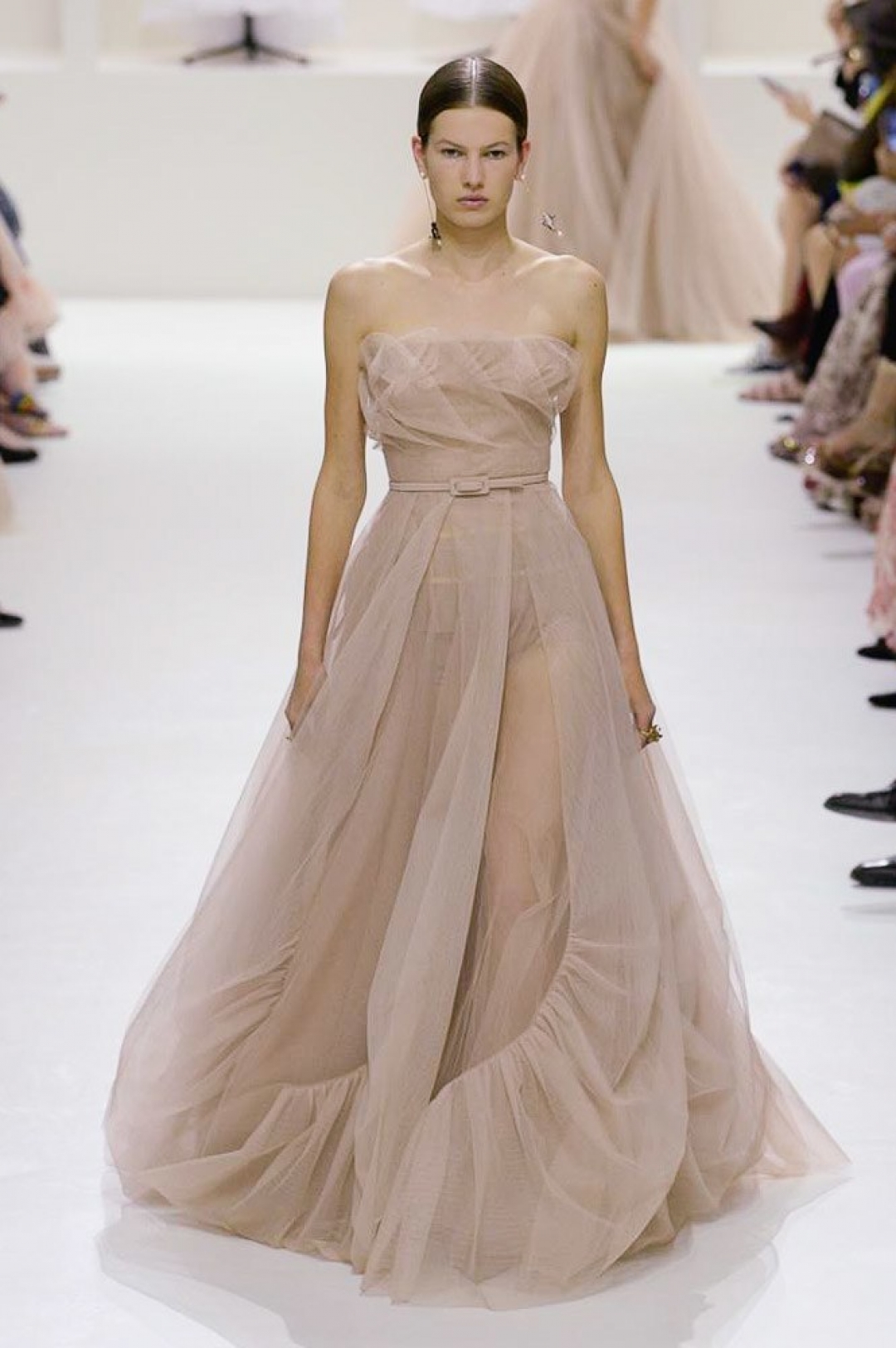 Большинство платьев с показа были такими же минималистичными: с нюдовой тканью, игривой плиссировкой, многослойным фатином и нескромным декольте. Дизайнер Dior Мария Грация Кьюри, наконец, выпустила наряды для девушек с большой грудью, поэтому теперь пул клиенток французского бренда наверняка расширится.