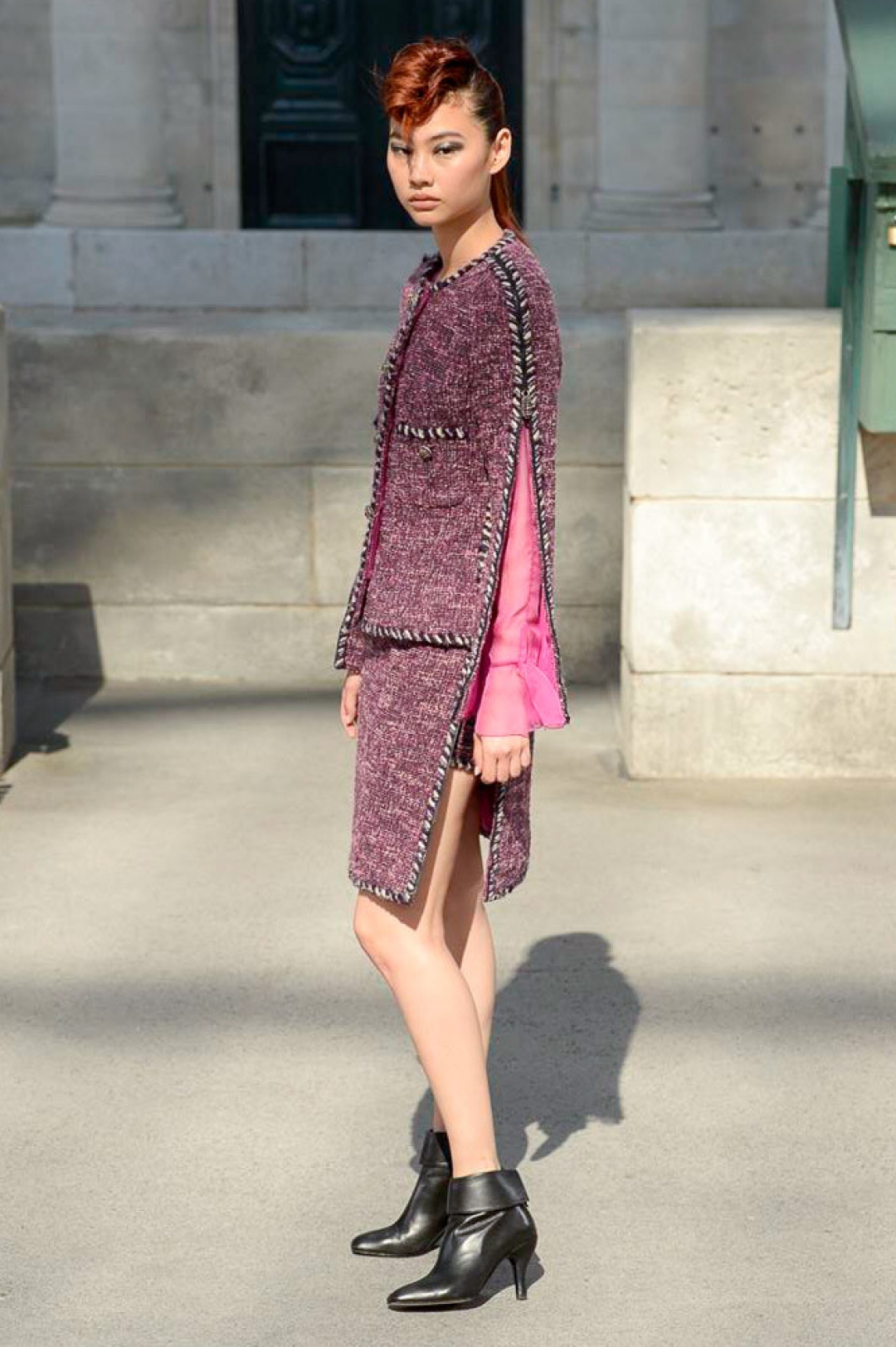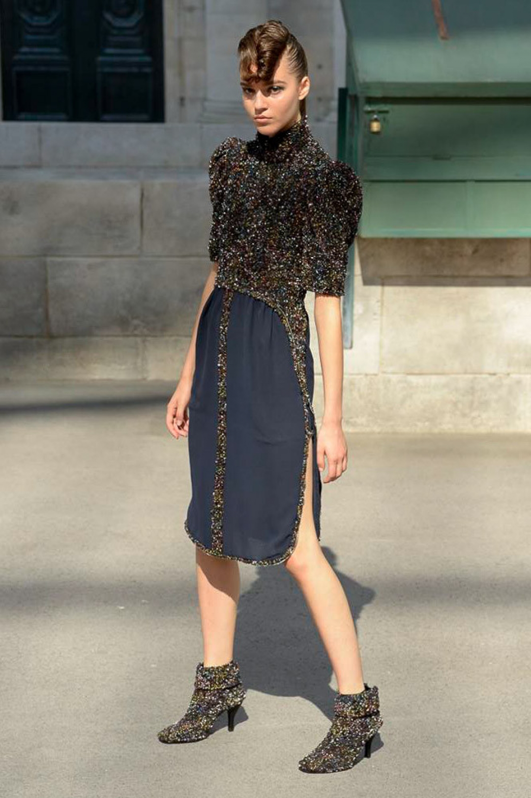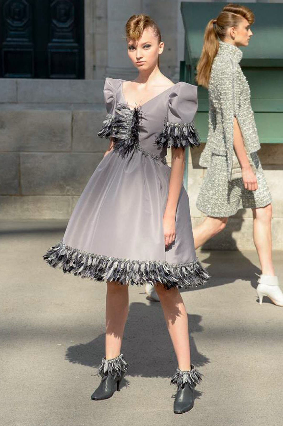 По французской улочке прогуливались девушки в серых твидовых сарафанах, жакетах с расклешенными рукавами, пышных вечерних платьях (очень похожих на выпускные), разноцветных кожаных перчатках и ботильонах с отворотами. Карл Лагеферльд доказывает, что такая обувь может не «резать» ногу, а украшать и тем более сочетаться с абсолютно любой одеждой.
