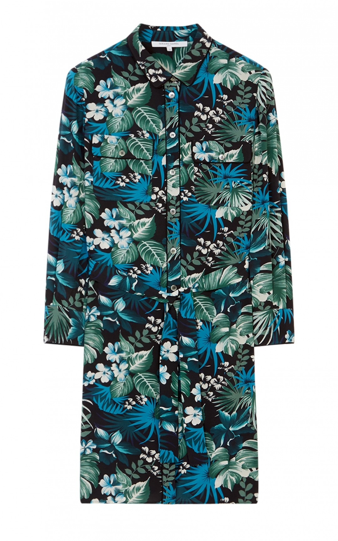 Пальмовые листья и редкие тропические цветы в соревновании летних принтов одерживают убедительную победу. Вообразить себя картиной любителя джунглей Анри Руссо проще всего в платье-рубашке Gerard Darel — французы всегда чувствуют меру и не превратят вас в клумбу. (Gerard Darel)