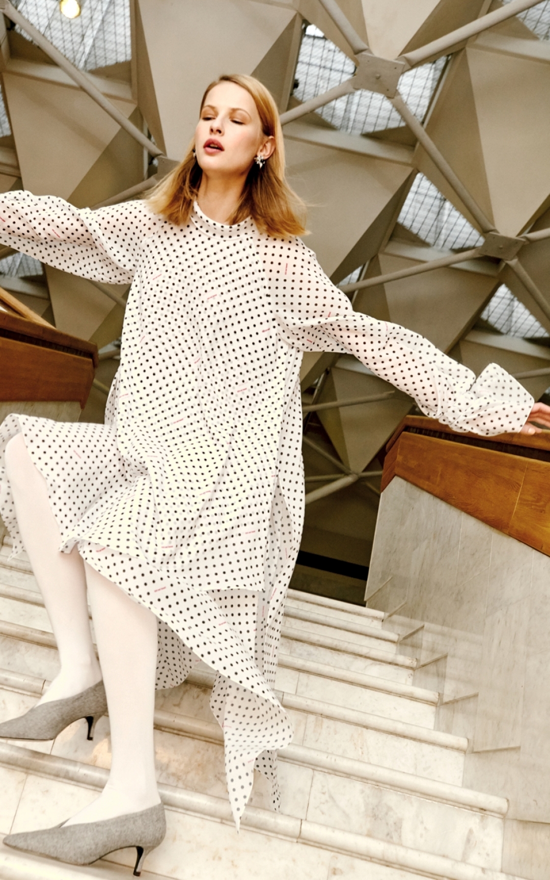 Бренд 404 Not Found превратил коды 1970-х в ультрамодные луки: шуба как у Сен-Лорана мутирует в неровно стриженный кокон, сорочка в горошек как у Брижит Бардо напоминает смирительную рубашку, а платье с запахом как у Фюрстенберг обретает диджитал-принт и немнущуюся ткань. (404 Not Found)
