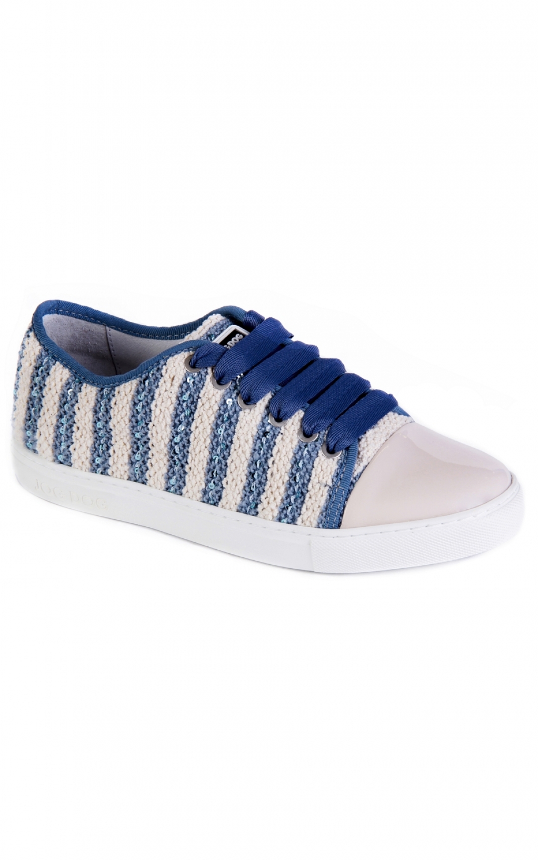 При виде полосатых летних твидовых кед Jog Dog на ум приходит поговорка: «Жизнь как зебра: то белая полоса, то черная». Только в случае с расцветками этой коллекции нам предлагают чередовать голубой, темно-синий и золотой цвета. Ну и правильно, какие черные полосы, когда такая погода! (jogdog.ru)