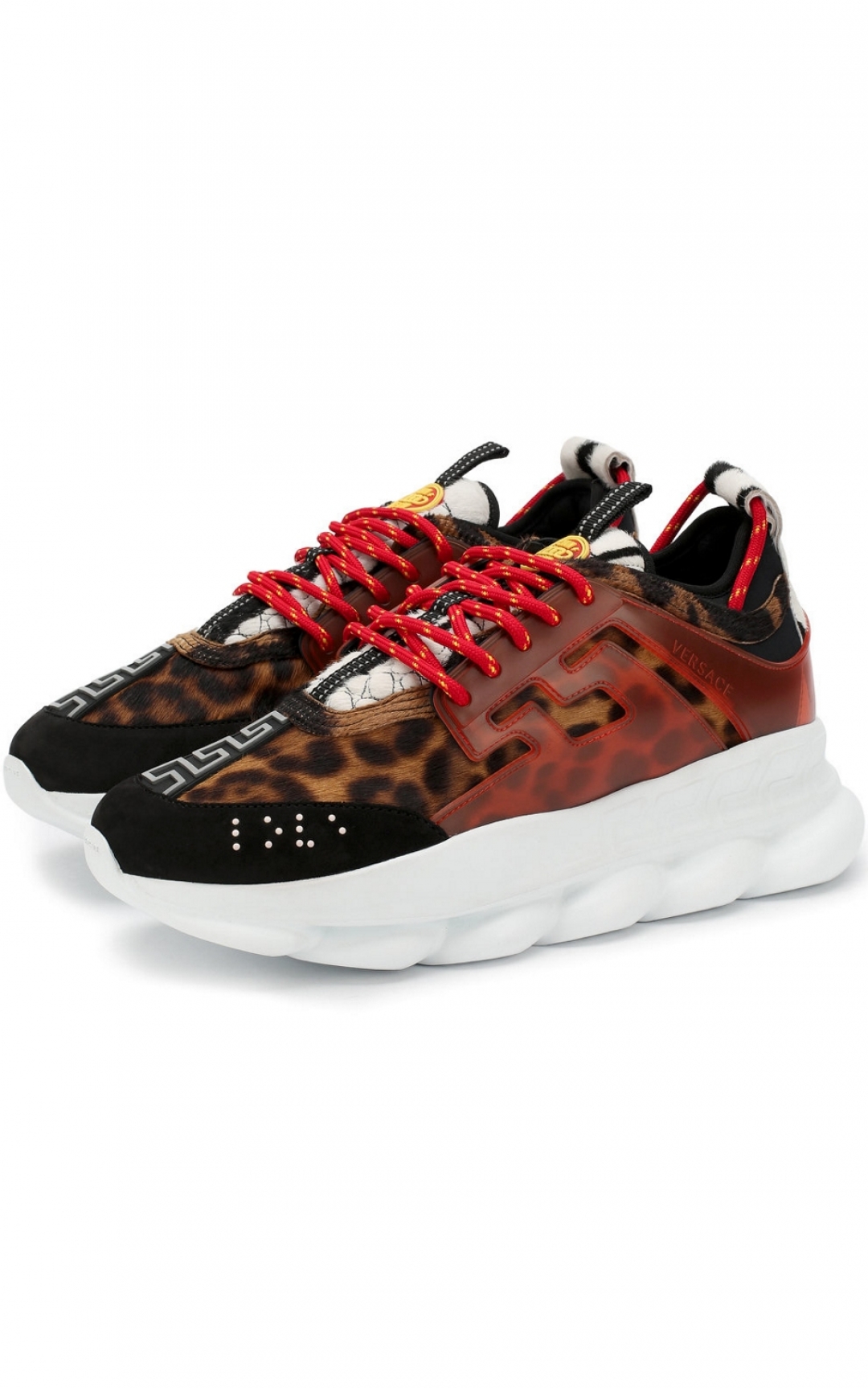 В кроссовках Versace на высокой платформе есть все, что дорого нашему сердцу: меандровый орнамент, леопардовый принт, шнурки, напоминающие об альпинистской страховке, и даже техно-задник. (ДЛТ)