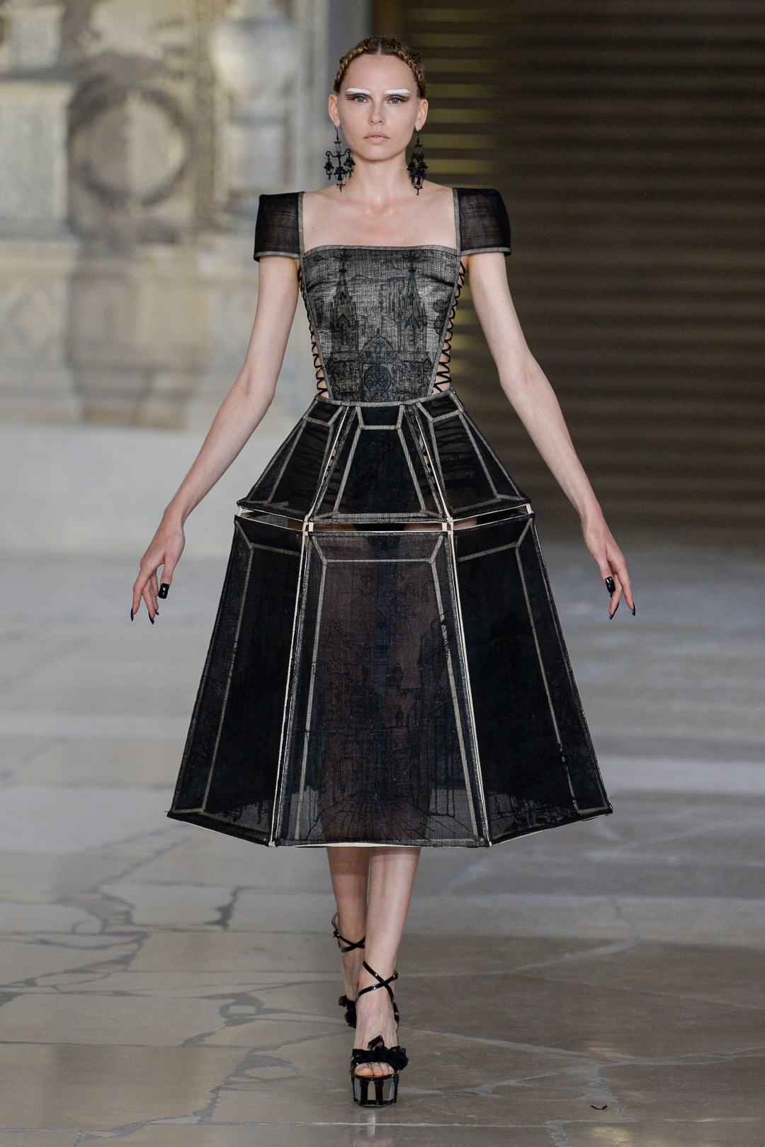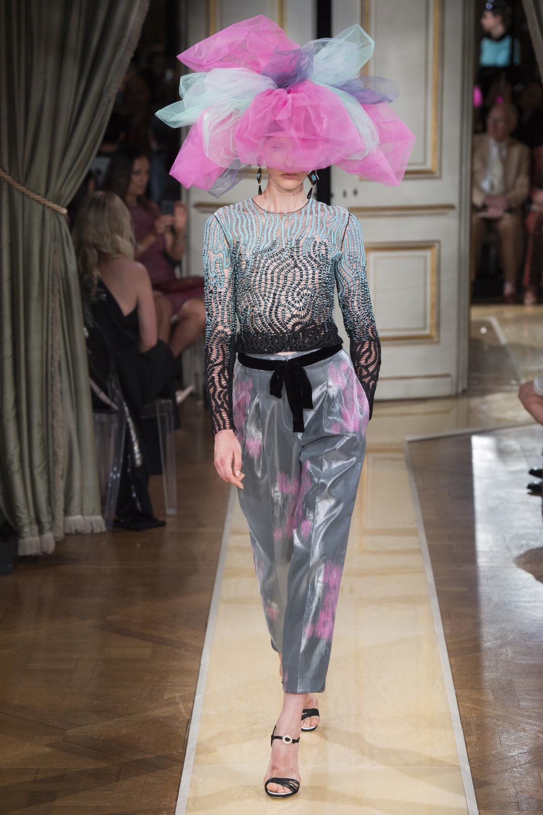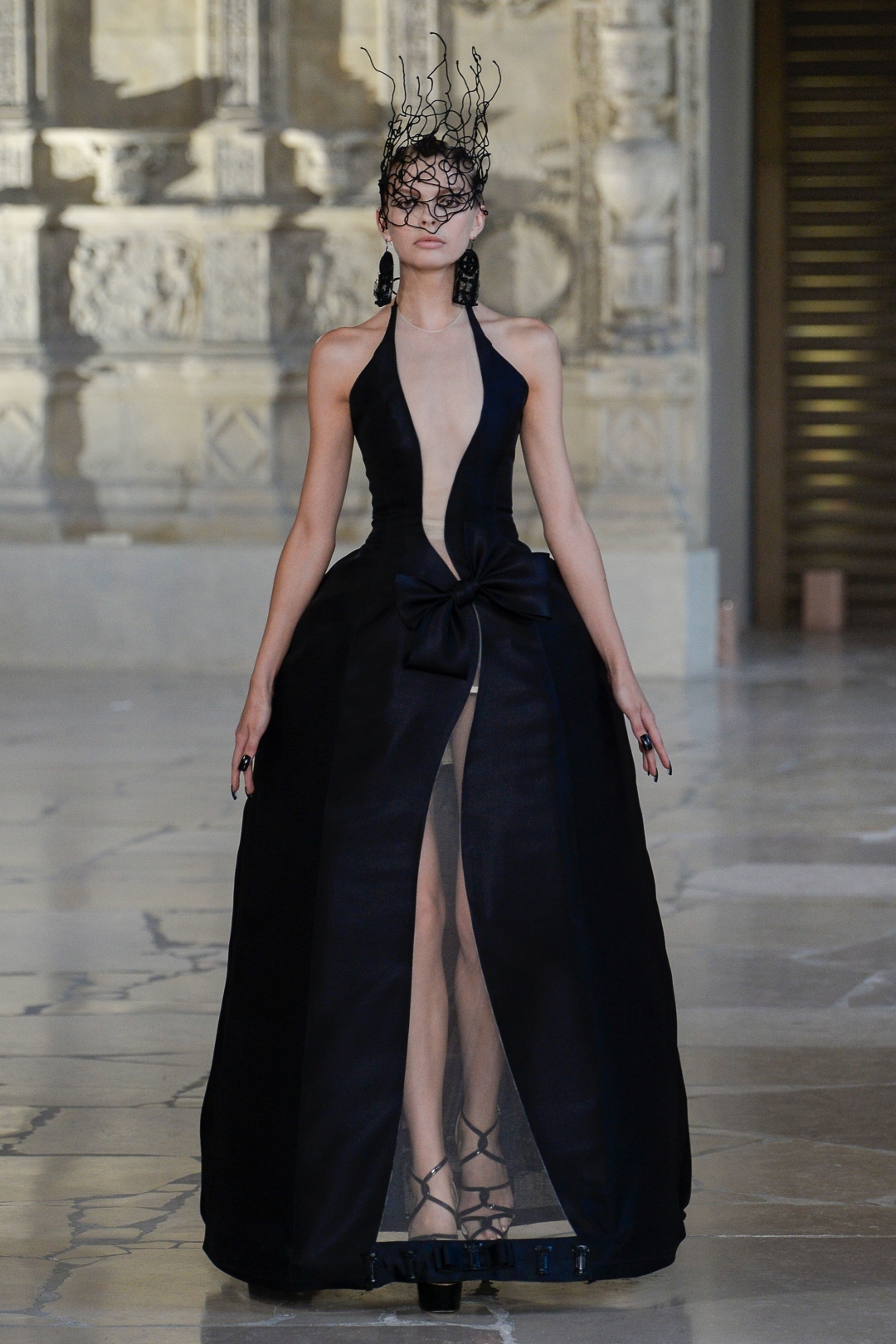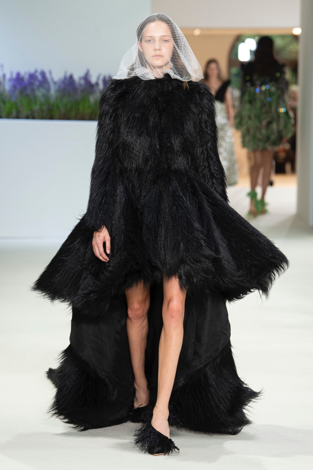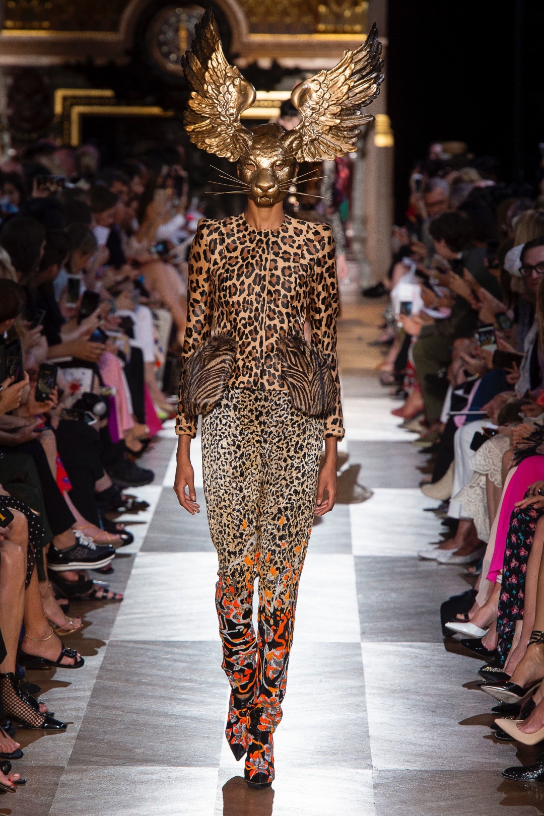 Бертран Гийон из Schiaparelli вдохновлялся не столько архивами, сколько стилем основательницы французского модного дома. Эльза Скиапарелли любила анималистичные принты и формы, а еще сумасшедшие маскарады, напоминающие булгаковский «Бал Сатаны». Отсюда сюрреалистичные головные уборы из перьев, сделанные для показа плюмасье Жюльеном Вермеленом, и имитация животных — прямо и косвенно.