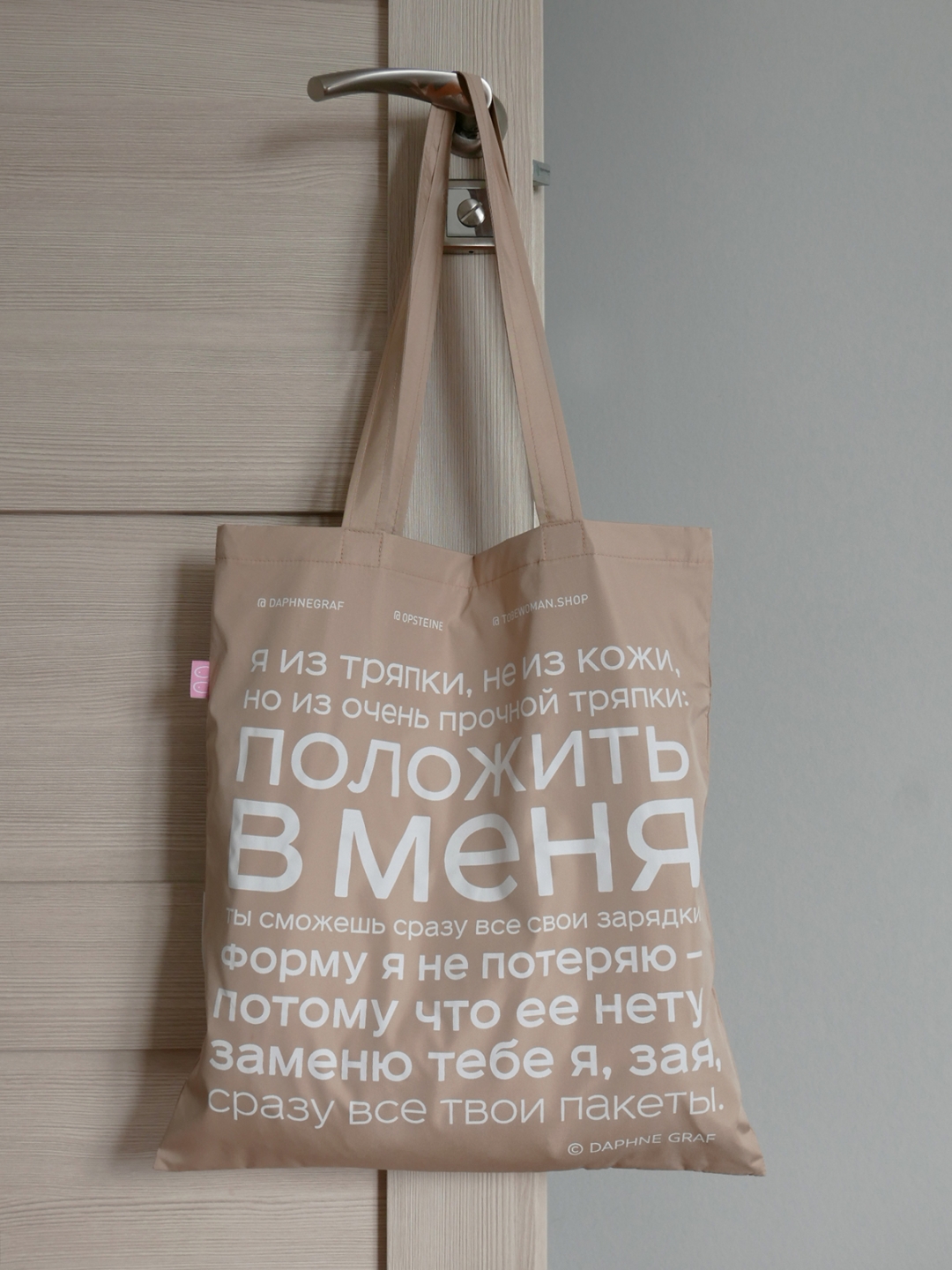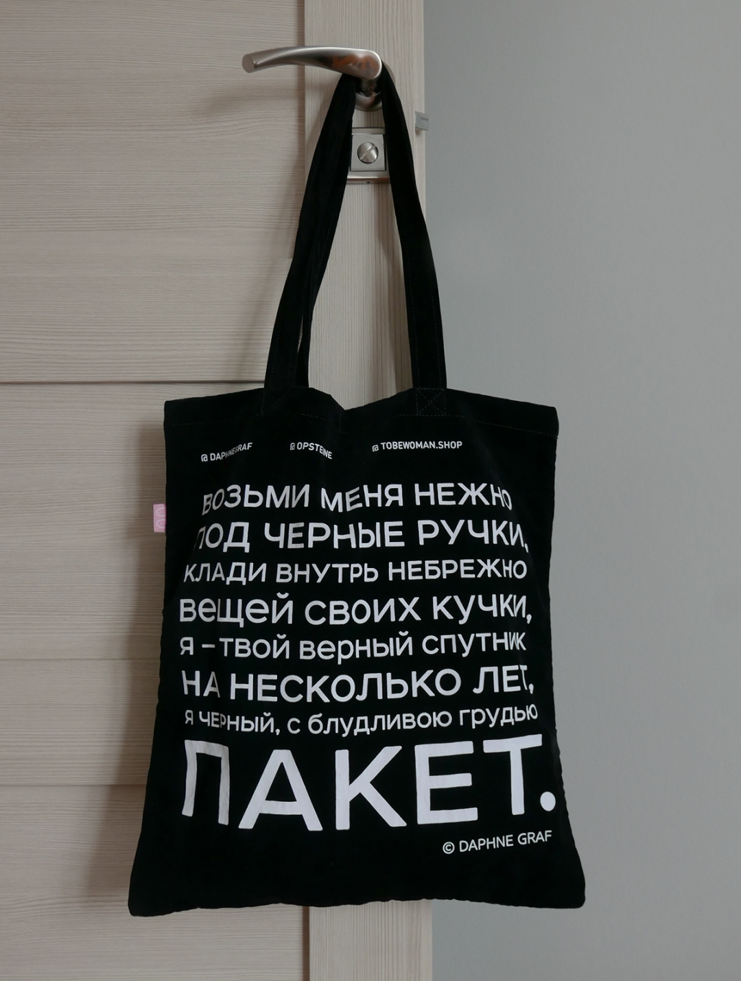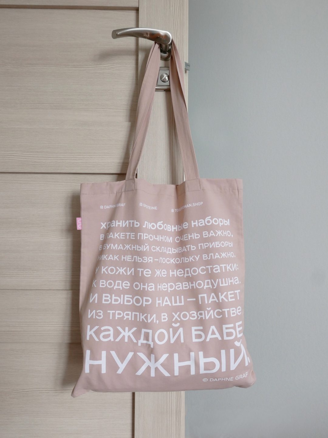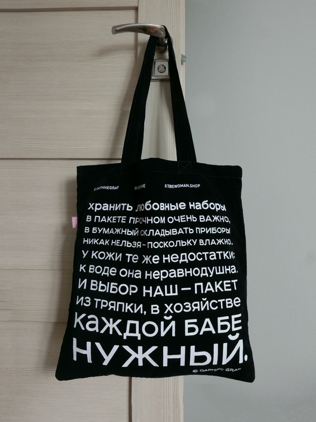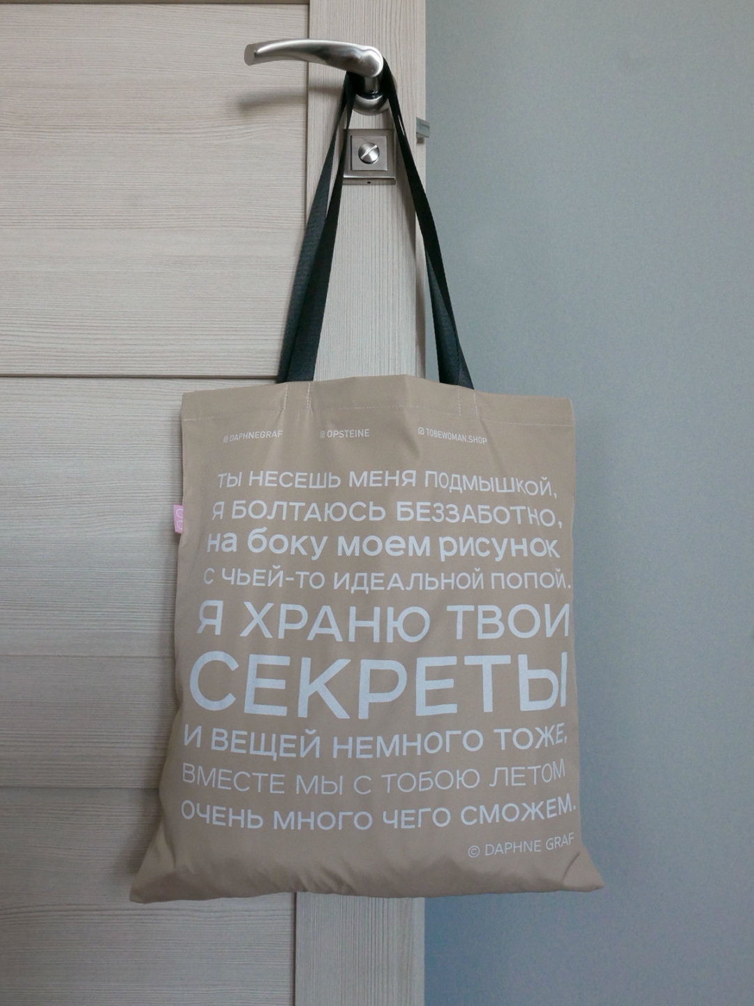 Дизайнер Ася Мальберштейн, запустившая в декабре прошлого года бренд To Be Woman, сделала «двойную коллаборацию» — с художницей Аней Општейне и поэтессой Дафной Граф. Пин-ап образы, ставшие неким символом новой «любвеобильной» марки, перебрались со значков, коробок и открыток из дебютной коллекции на шопперы — вместе с ироничными стихами, описывающими их предназначение.