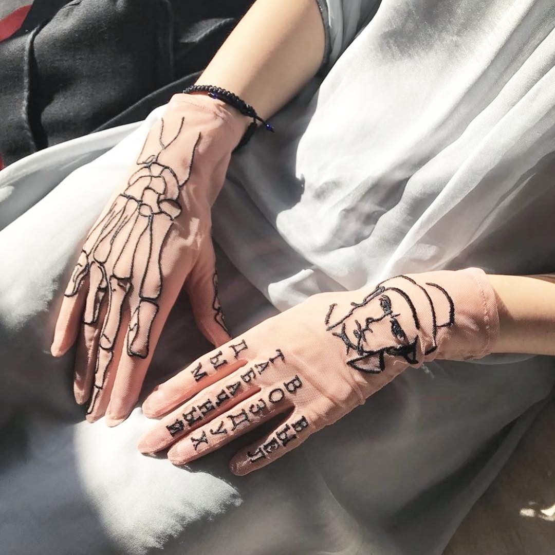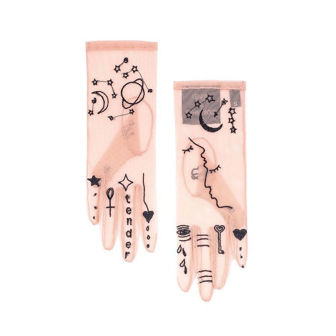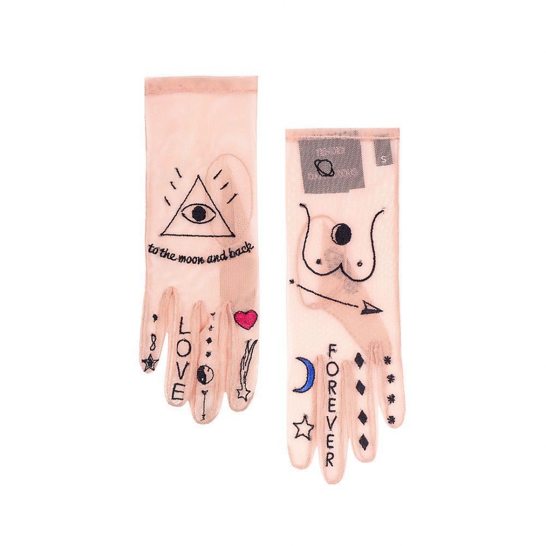Телесные перчатки, сливающиеся с цветом кожи, продаются в «инстаграме» киевского бренда и доставляются в любую точку мира. Пара стоит 110$, но можно купить и по одной перчатке за 62$ из каждого комплекта — например, замиксовать Люка Бессона и «Королеву дискотек» или созвездие и всевидящее око.