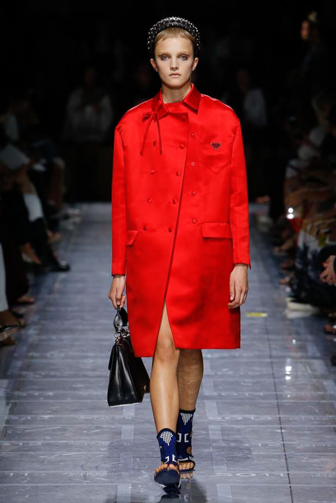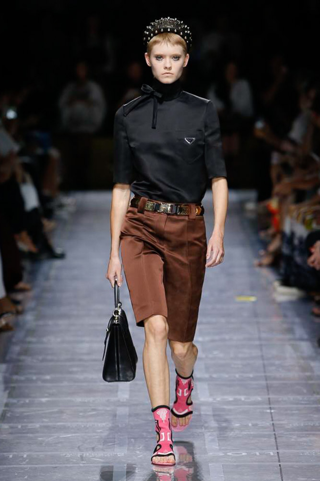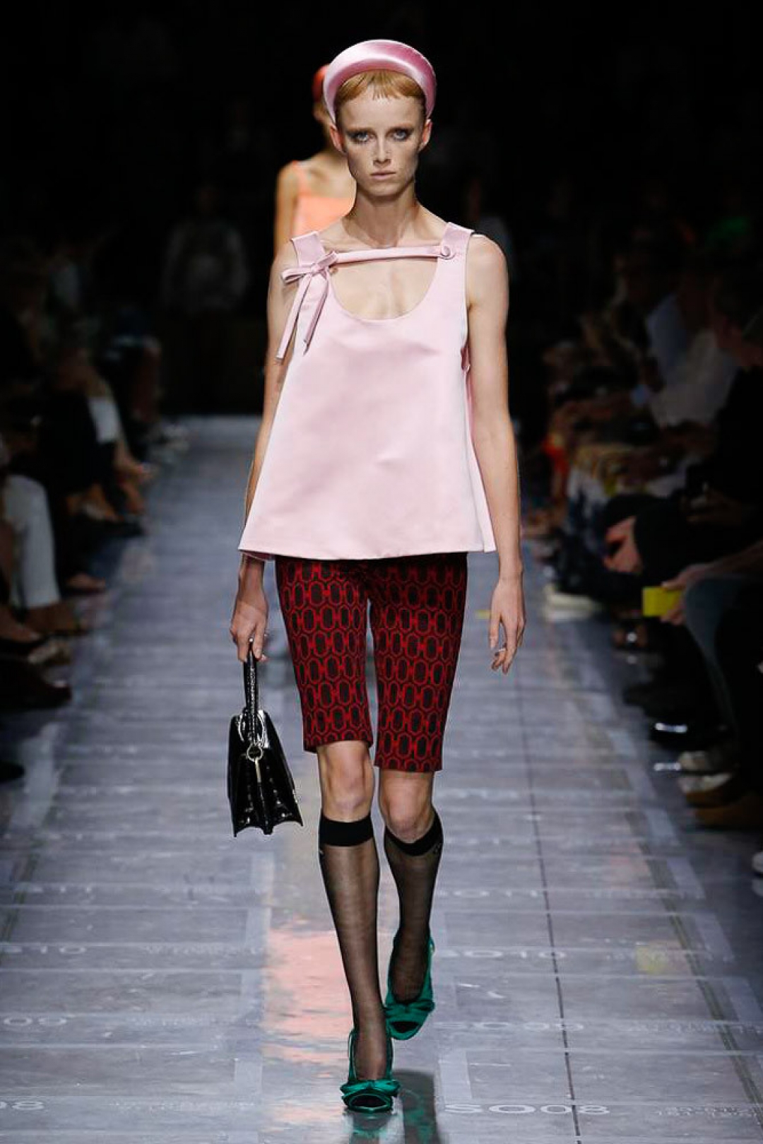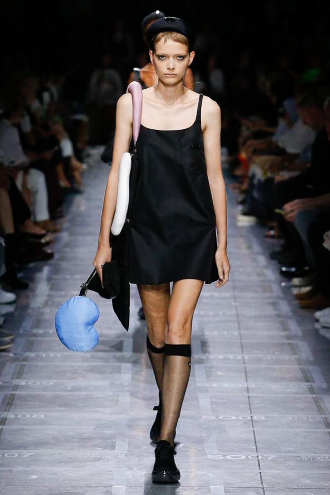 В миланском Fondazione Prada, переделанном под современный театр с партером и балконом, прошел показ весенне-летней коллекции итальянской марки. В главных ролях очередного спектакля авторства Миуччи Прады — герлскауты в шляпах-таблетках, оливковых бадлонах и атласных юбках-карандашах. Только вместо рюкзаков с печеньями в их руках были сюрреалистичные «вздутые» сумки, а вместо классических kitten heels — вязаные носки-сандалии. Если вы думали, что ботфорты-колготки и ботинки-чулки — верх фантазии современных дизайнеров, то ошибались.