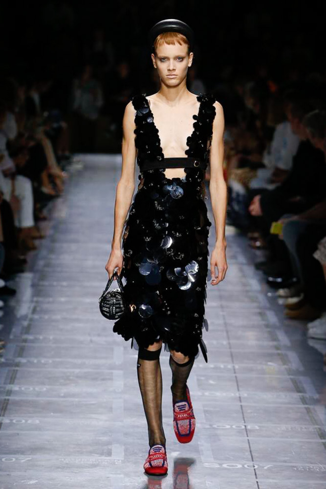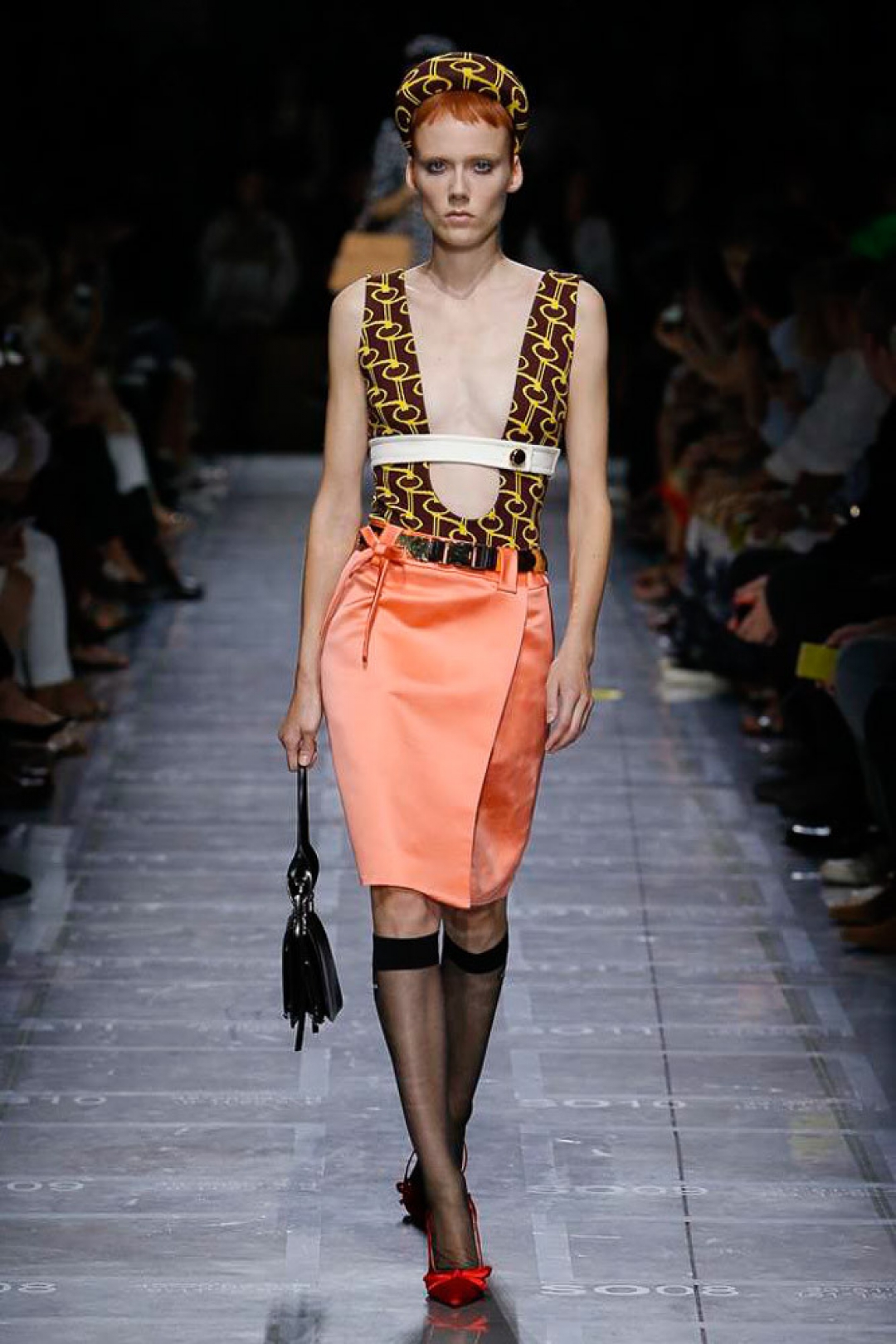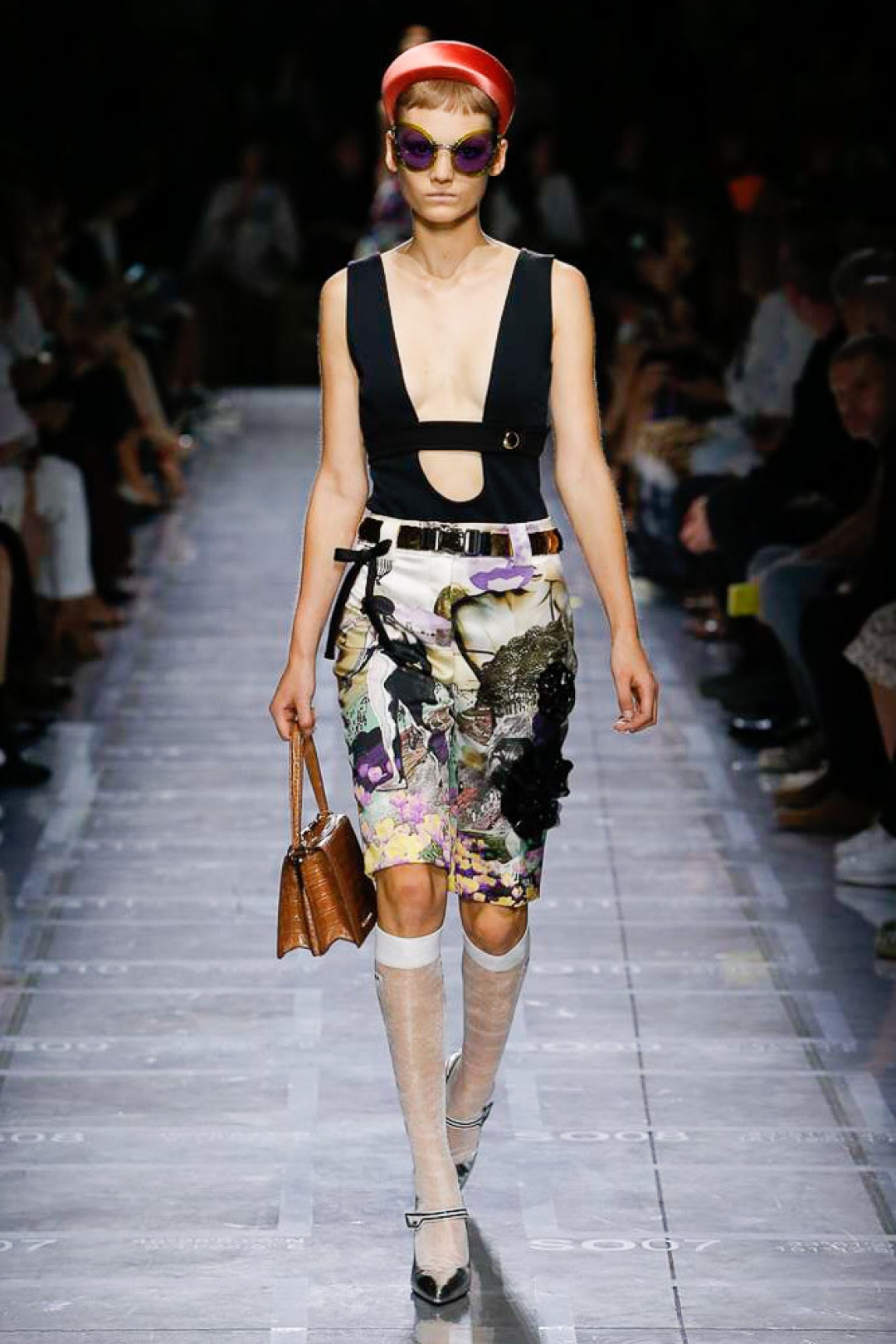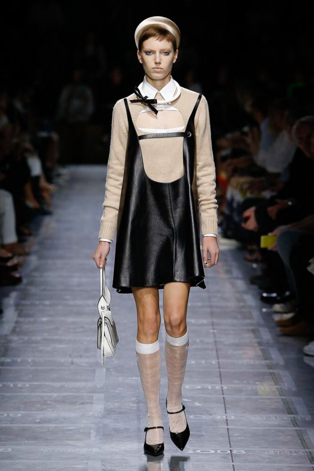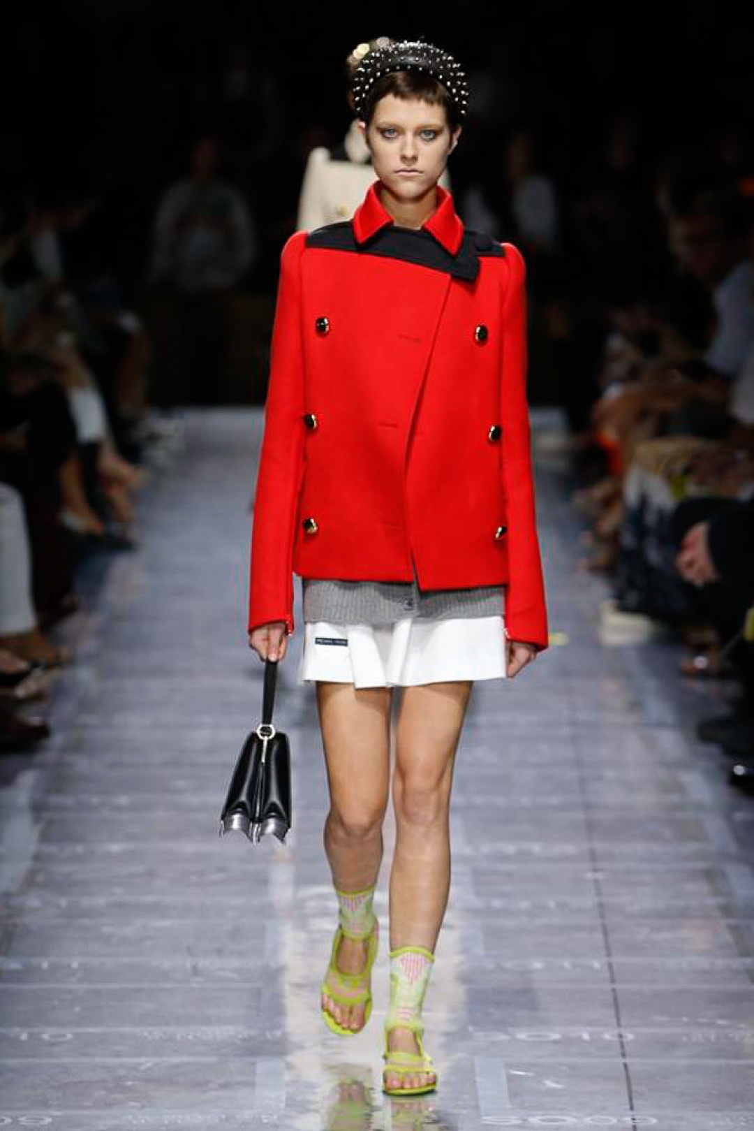 В миланском Fondazione Prada, переделанном под современный театр с партером и балконом, прошел показ весенне-летней коллекции итальянской марки. В главных ролях очередного спектакля авторства Миуччи Прады — герлскауты в шляпах-таблетках, оливковых бадлонах и атласных юбках-карандашах. Только вместо рюкзаков с печеньями в их руках были сюрреалистичные «вздутые» сумки, а вместо классических kitten heels — вязаные носки-сандалии. Если вы думали, что ботфорты-колготки и ботинки-чулки — верх фантазии современных дизайнеров, то ошибались.