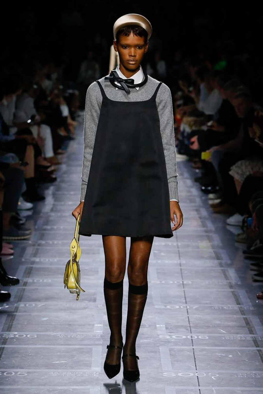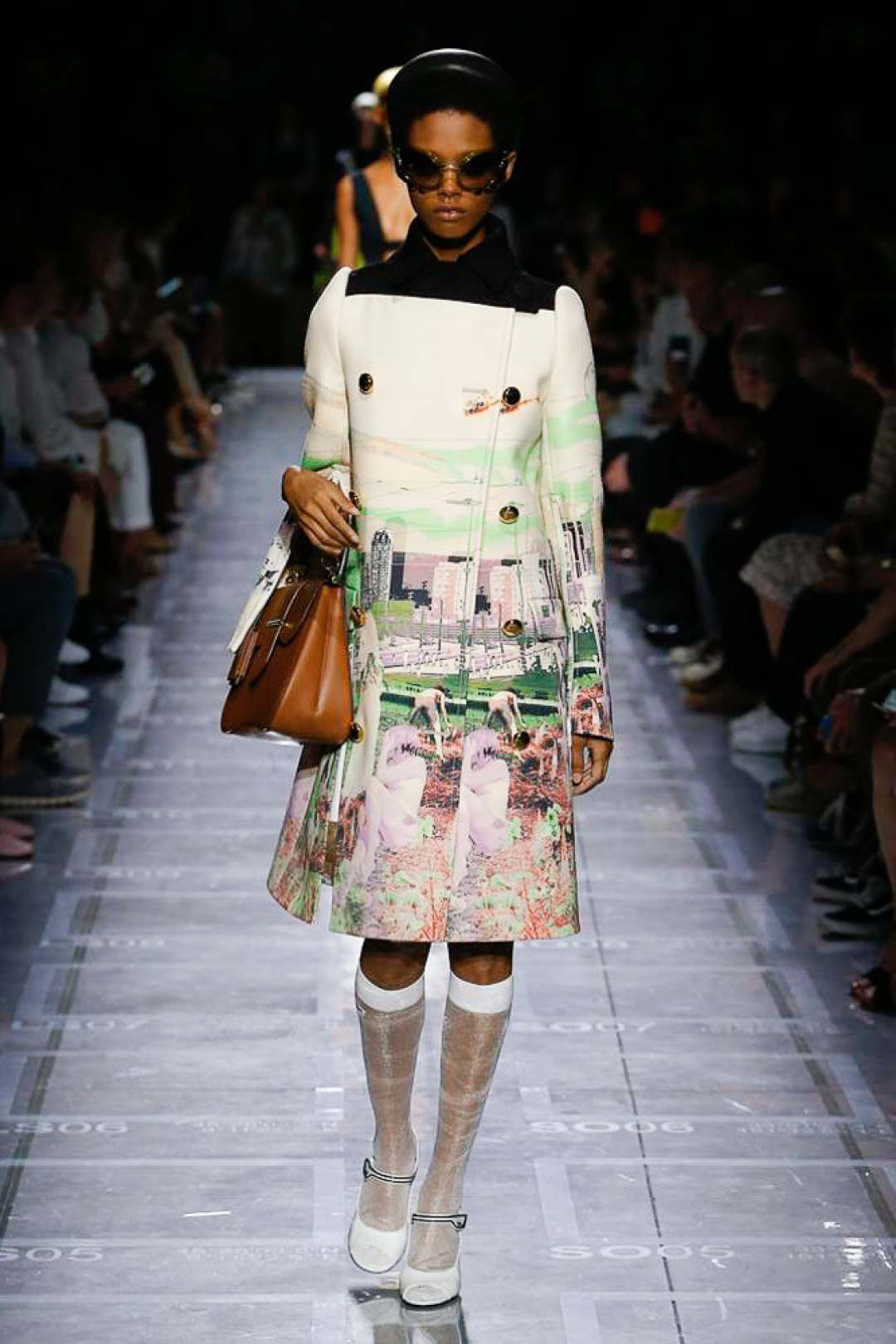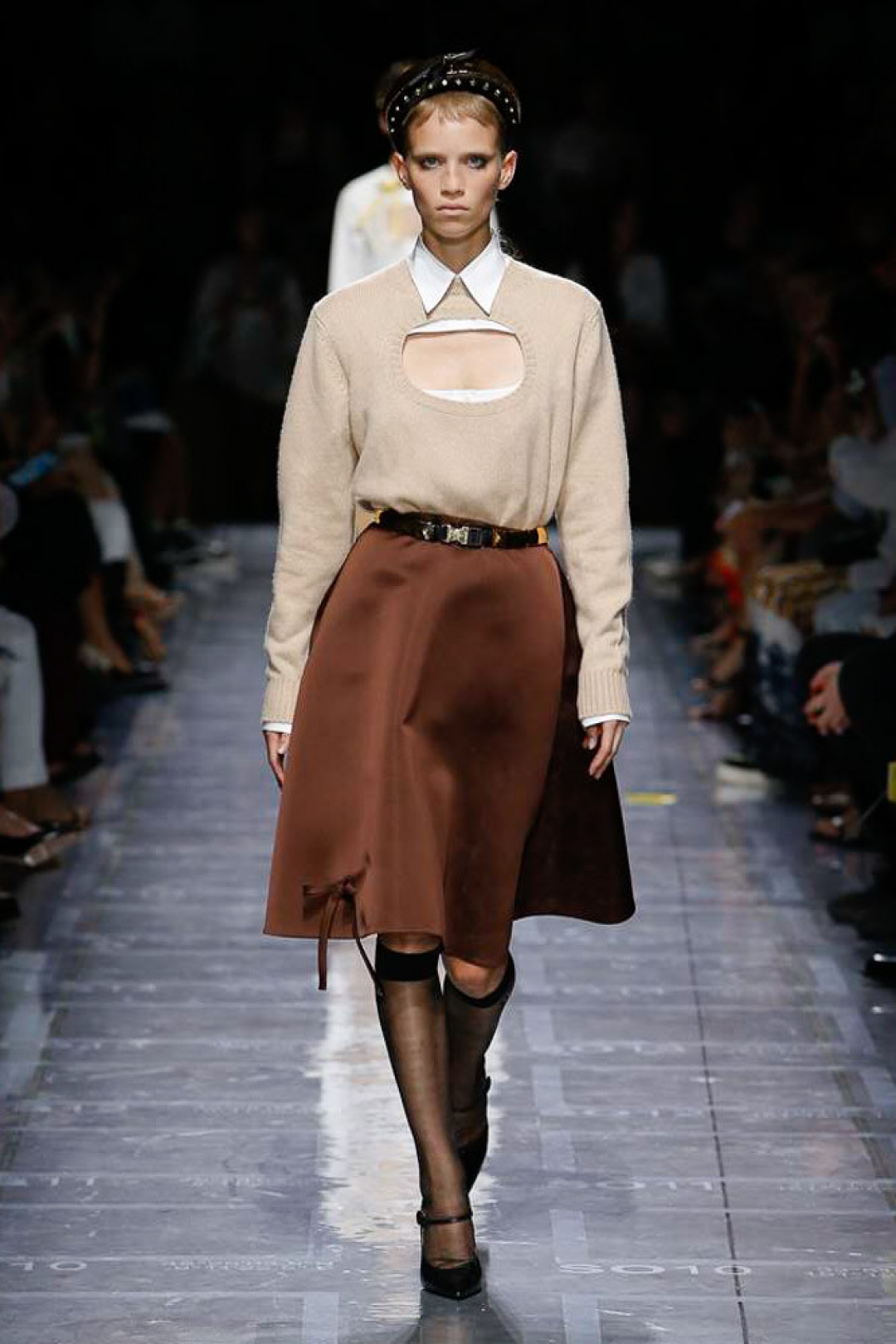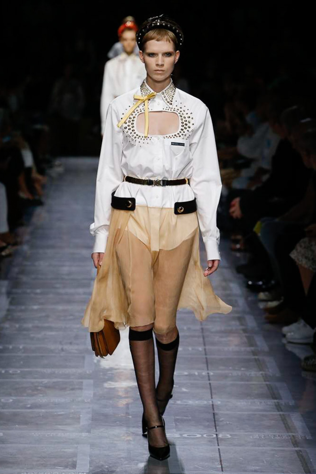 В миланском Fondazione Prada, переделанном под современный театр с партером и балконом, прошел показ весенне-летней коллекции итальянской марки. В главных ролях очередного спектакля авторства Миуччи Прады — герлскауты в шляпах-таблетках, оливковых бадлонах и атласных юбках-карандашах. Только вместо рюкзаков с печеньями в их руках были сюрреалистичные «вздутые» сумки, а вместо классических kitten heels — вязаные носки-сандалии. Если вы думали, что ботфорты-колготки и ботинки-чулки — верх фантазии современных дизайнеров, то ошибались.
