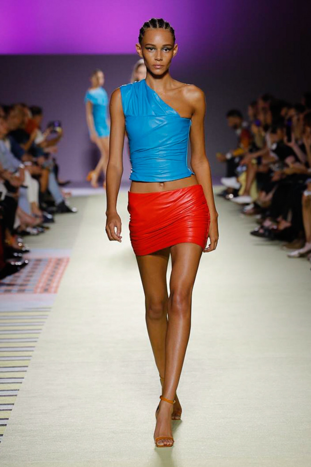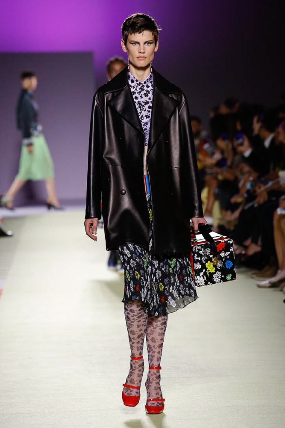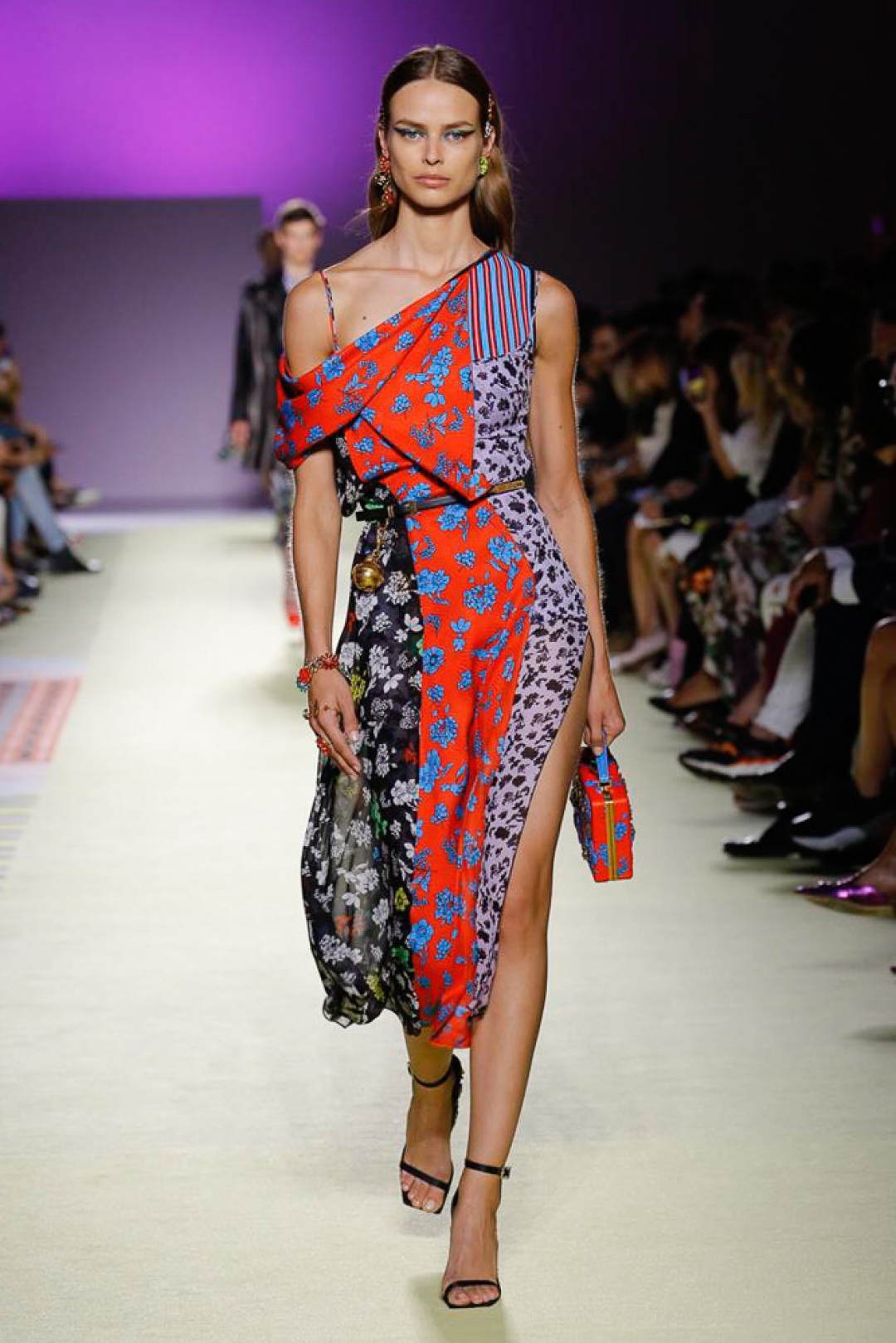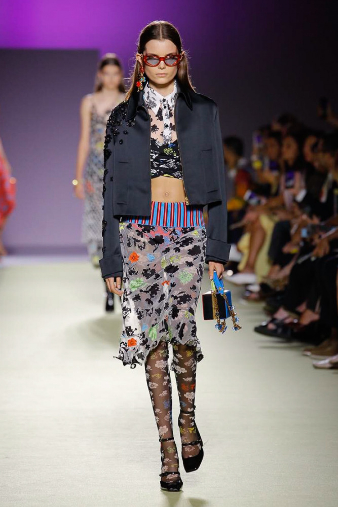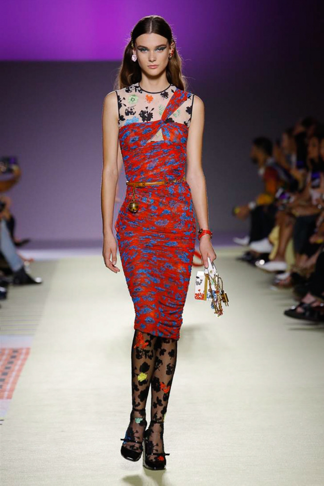 Кстати, теперь их можно носить, не прикрывая юбкой, — колготки превращаются из вспомогательного предмета гардероба в полноценный. Versace мешает их с ярко-красным пальто, полосатым бадлоном, лакированными босоножками и микро-шортами такой же текстуры, намекая, что без последнего можно было и вовсе обойтись. Кроме этой фишки нового показа, нам нравятся «обтянутые» асимметричные платья, десять юбок, соединенные в одну, и пальто кислотно-хромакейного оттенка. Если уж и отмечать юбилей Versace, то по-миланскому ярко и празднично!