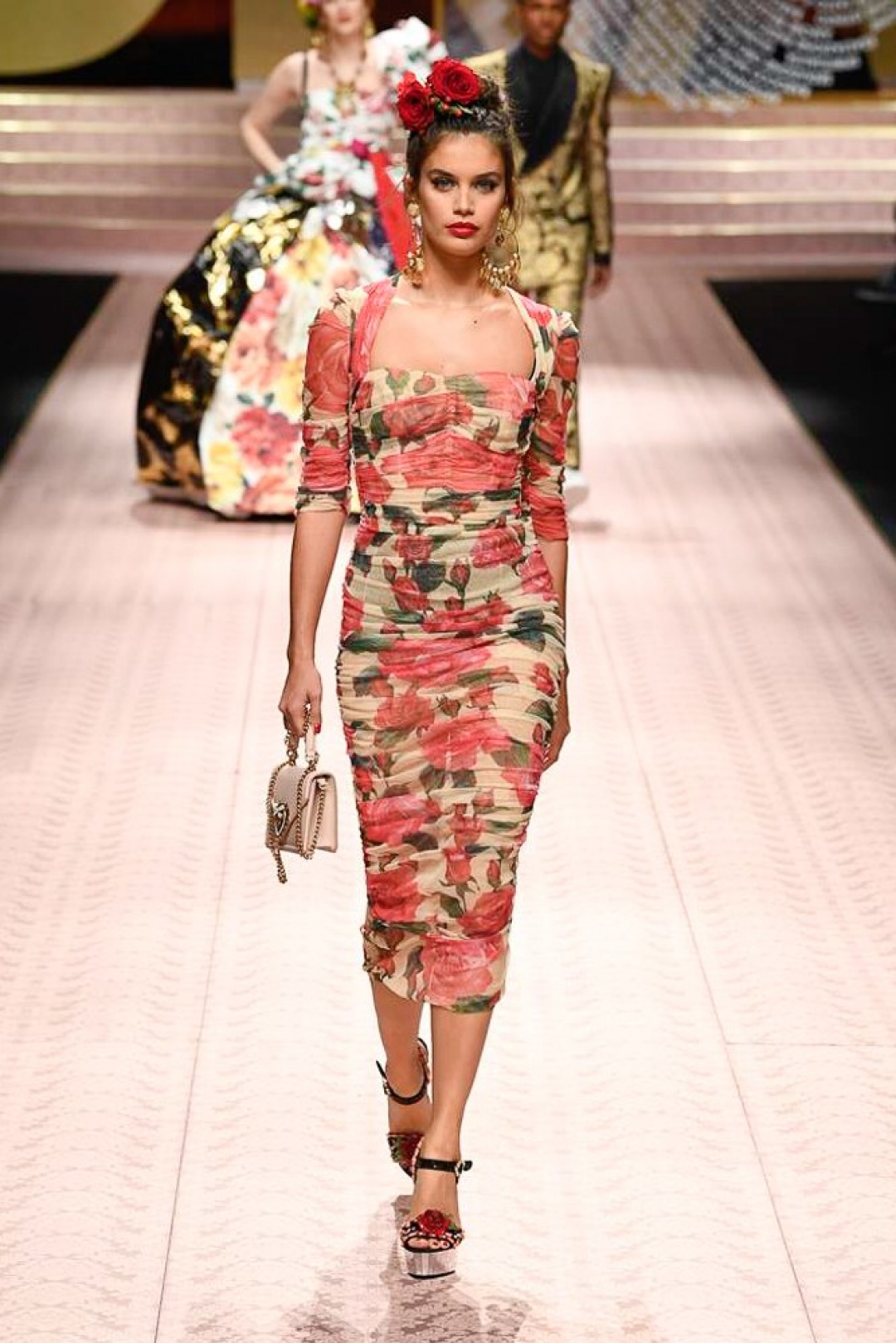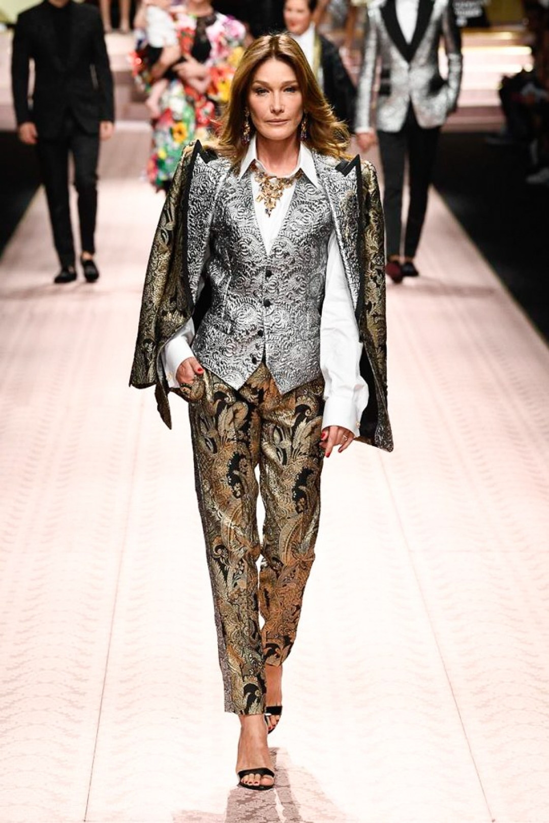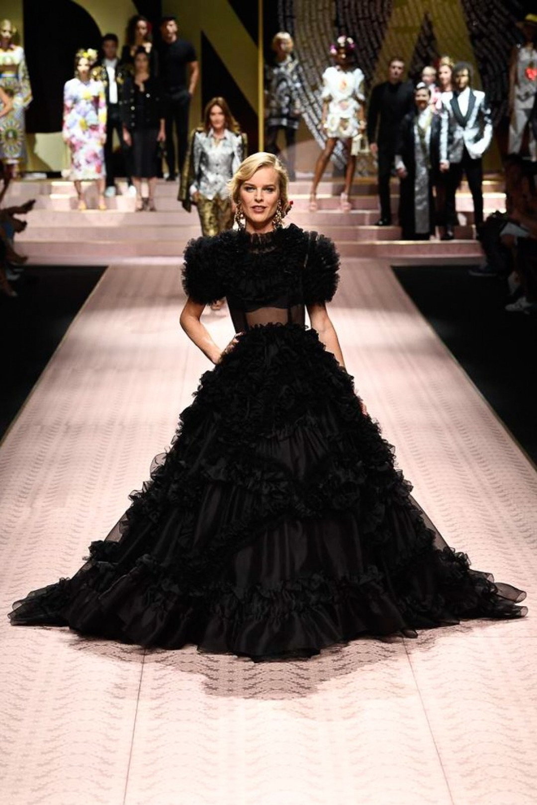 Прошедший показ Dolce & Gabbana напоминает прошлогоднее шоу Versace: в честь двадцатилетия карьеры Донателлы Версаче на подиум вышли пять супермоделей 90-х годов — Синди Кроуфорд, Наоми Кэмпбелл, Клаудиа Шиффер, Хелена Кристенсен и Карла Бруни. Теперь Хелена и Карла приняли участие в перфомансе Dolce & Gabbana, но уже в сопровождении других любимиц итальянской марки: Моники Беллуччи и Евы Герциговой, а также менее опытных моделей — Эмили Ратаковски, Леди Китти Спенсер и мамы Илона Маска, Майи.