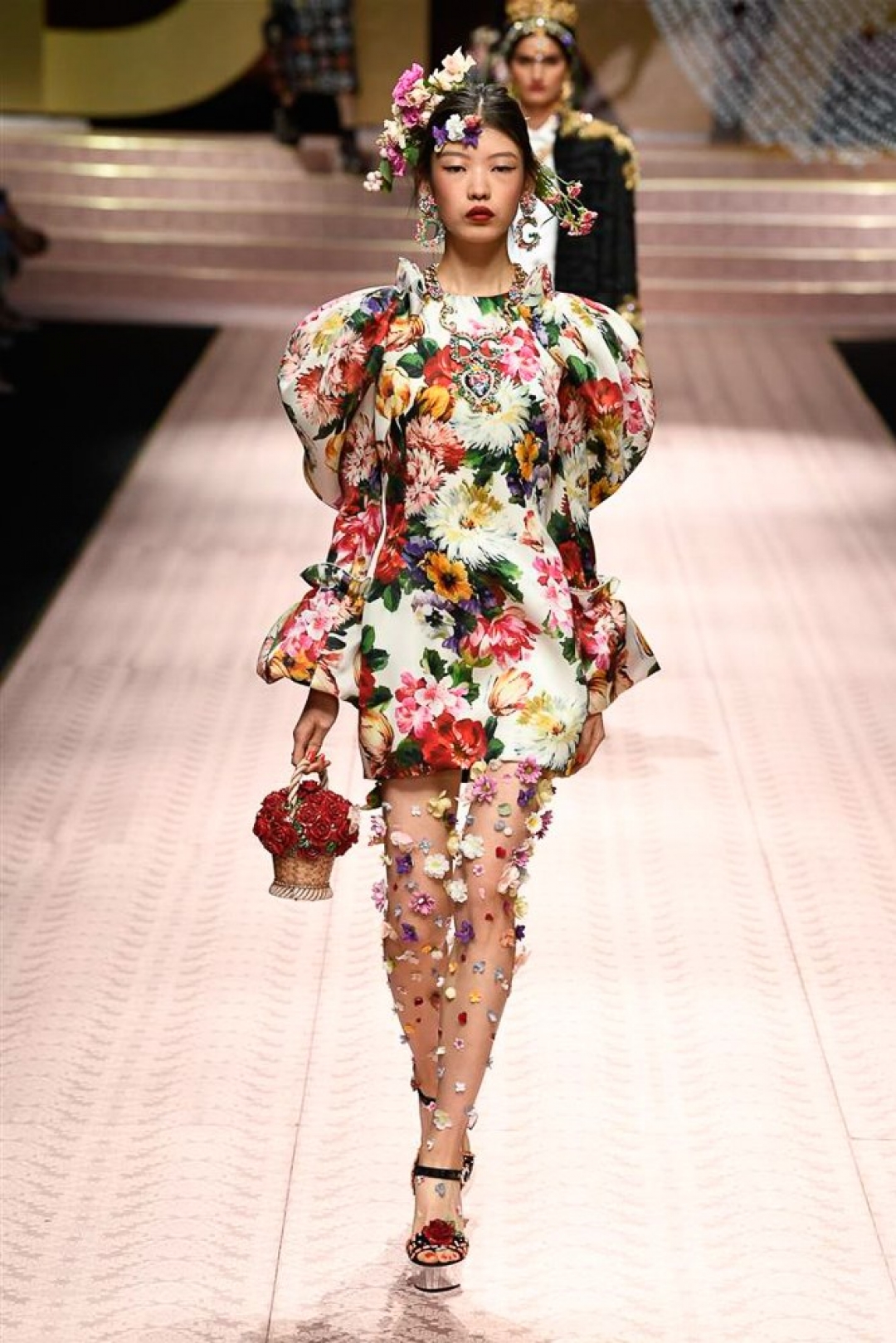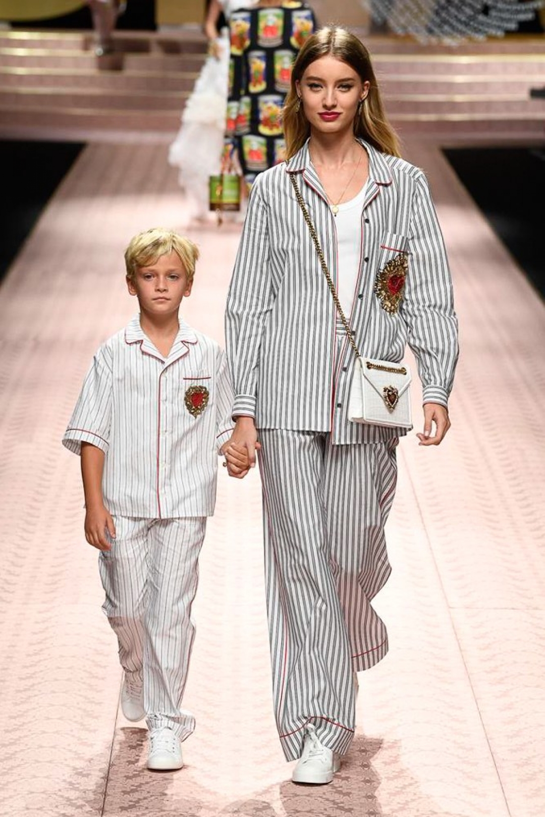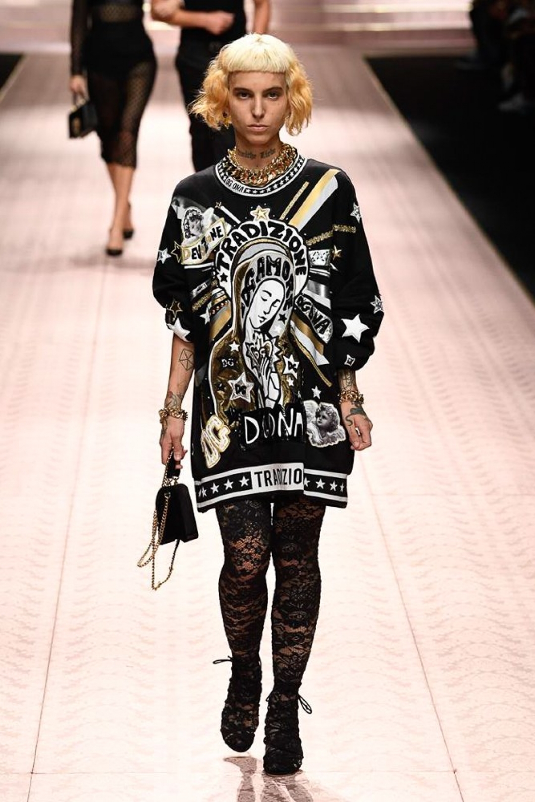 Все они — члены #DolceGabbanaFamily, хранительницы итальянских ценностей и национального стиля. Доменико и Стефано нарядили их в ключевые для бренда экземпляры — корсетированные платья, сарафаны с «религиозными» принтами, туфли на черные чулки и жаккардовые костюмы-тройки. Другую концепцию марки — «наши платья подходят всем» — воплощают плюс-сайз модель Эшли Грэхем, 54-летняя Марпесса Хенник, а также приглашенные инфлюэнсеры, корейские блогеры и звезды андеграунда.