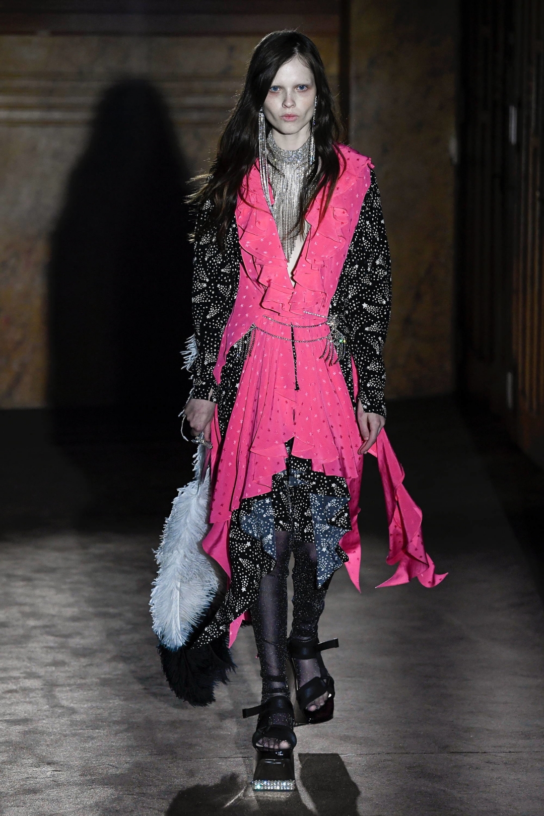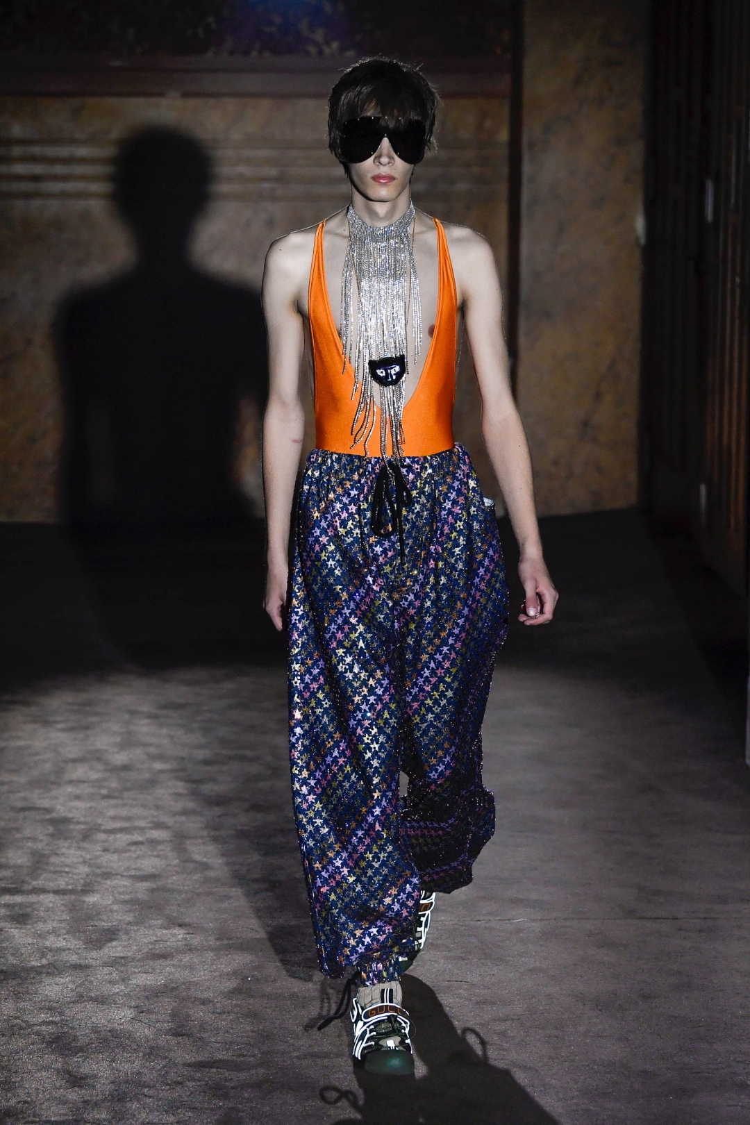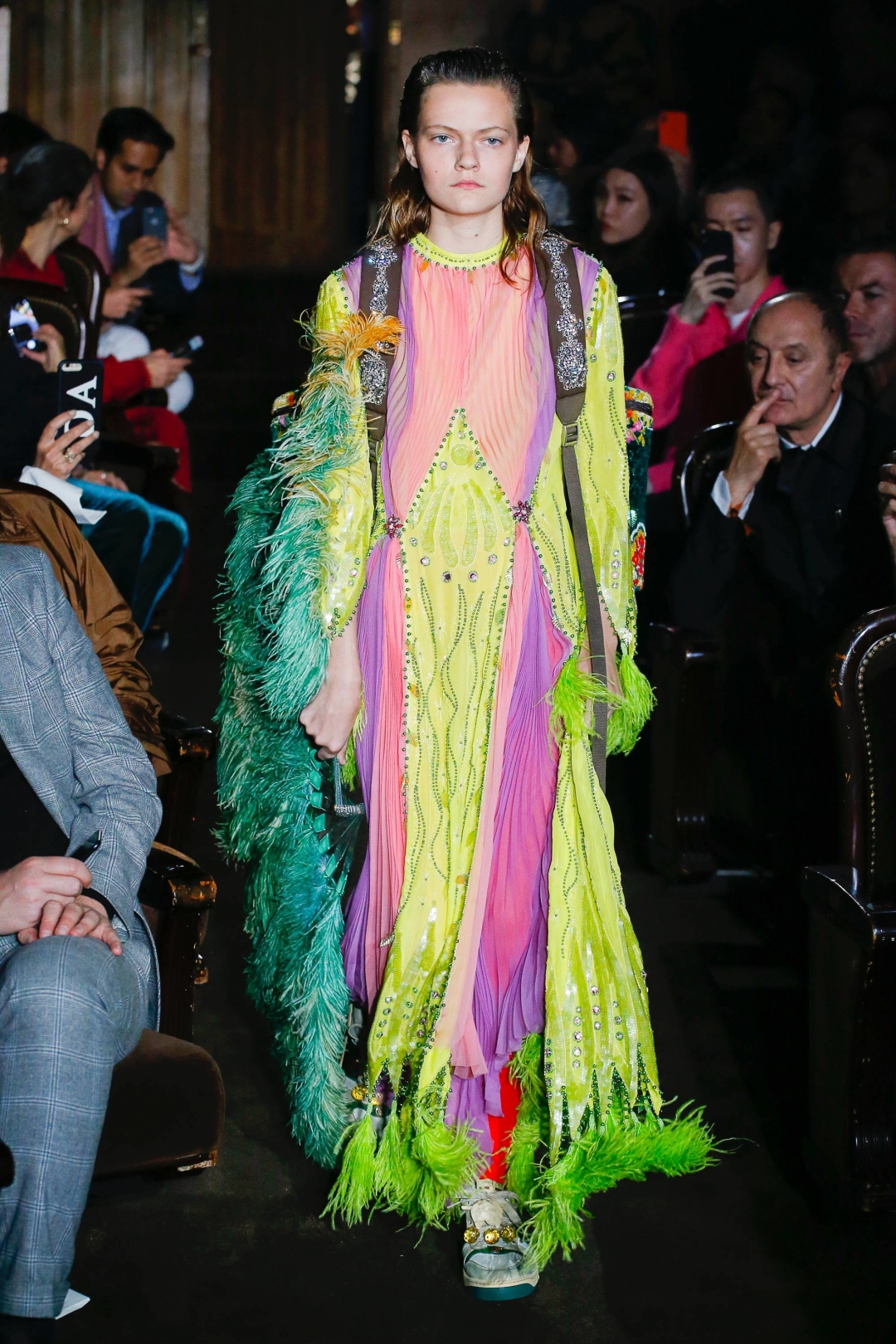 Уже второй сезон Gucci устраивают шоу за пределами Милана: круизную коллекцию Алессандро Микеле показывал на кладбище города Арль, где жил и работал Винсент Ван Гог, а весенне-летнюю — в парижском театре Le Palace, расположенном на улице Рю-дю-Фобур-Монмартр и ранее служившем ночным клубом. Несмотря на противоречивый выбор локации, в мудборде нового релиза — главные экспериментаторы итальянского театра 1970-80-х годов Лео де Берардинису и Перле Парагалло. Отсылки к их философии «театр как искусство коллективного сознания, ужаса и радости бытия» есть во взбалмошных платьях из мишуры, синтезе офисных брюк и блестящих жакетов, оранжевых боди в сочетании со «звездными» брюками и асимметричных театральных нарядах с боа.