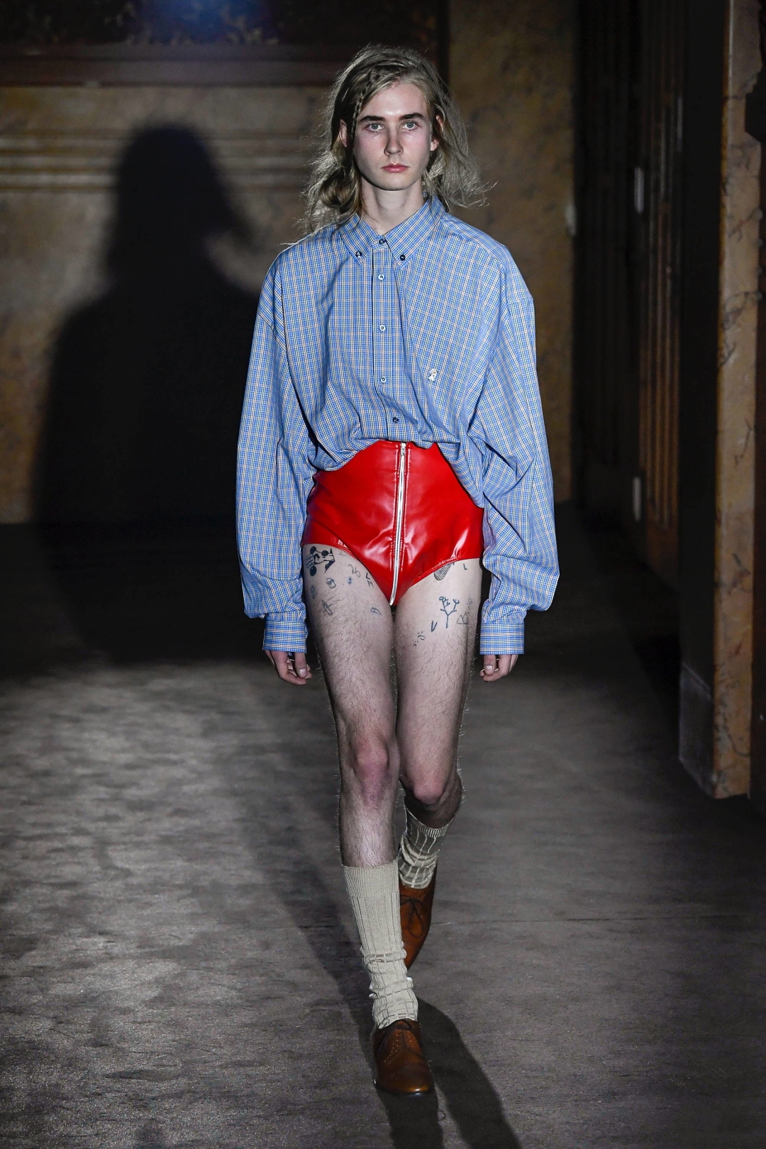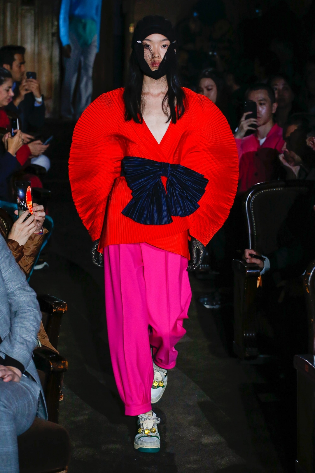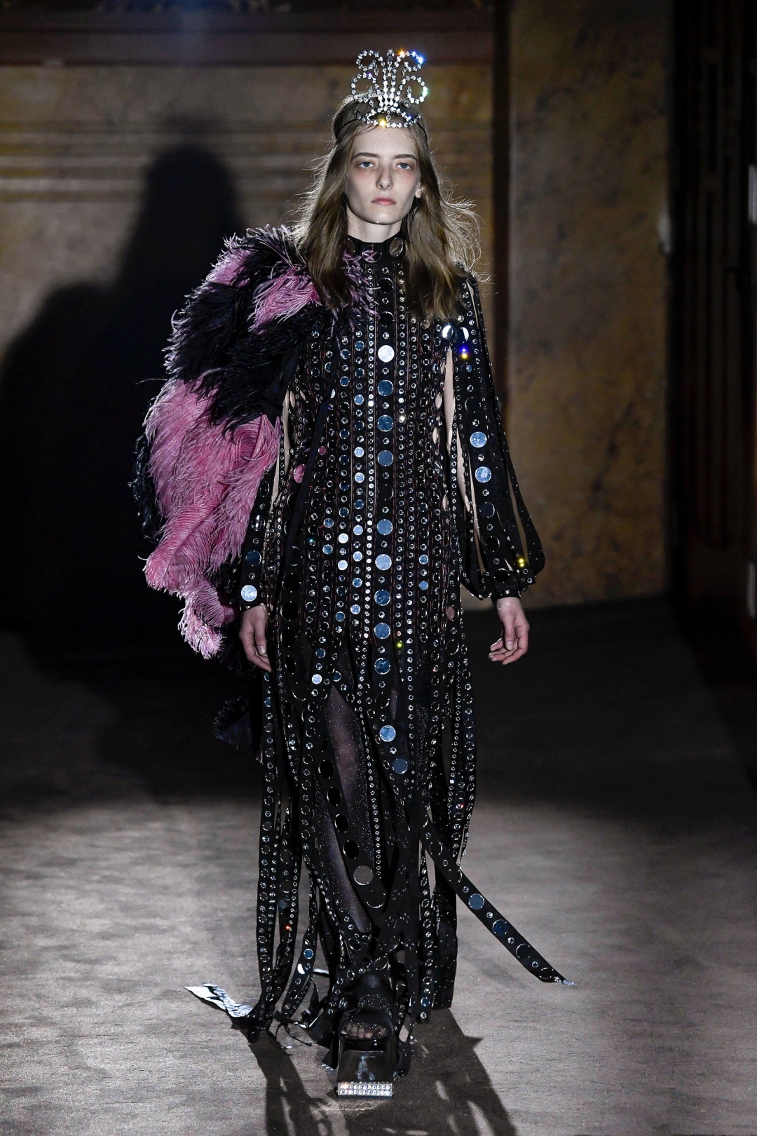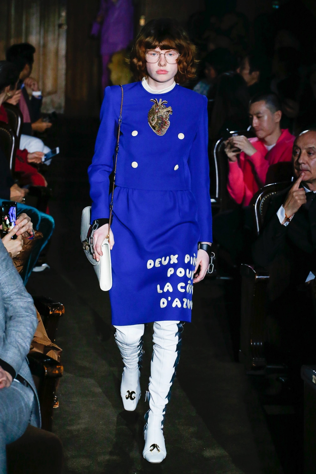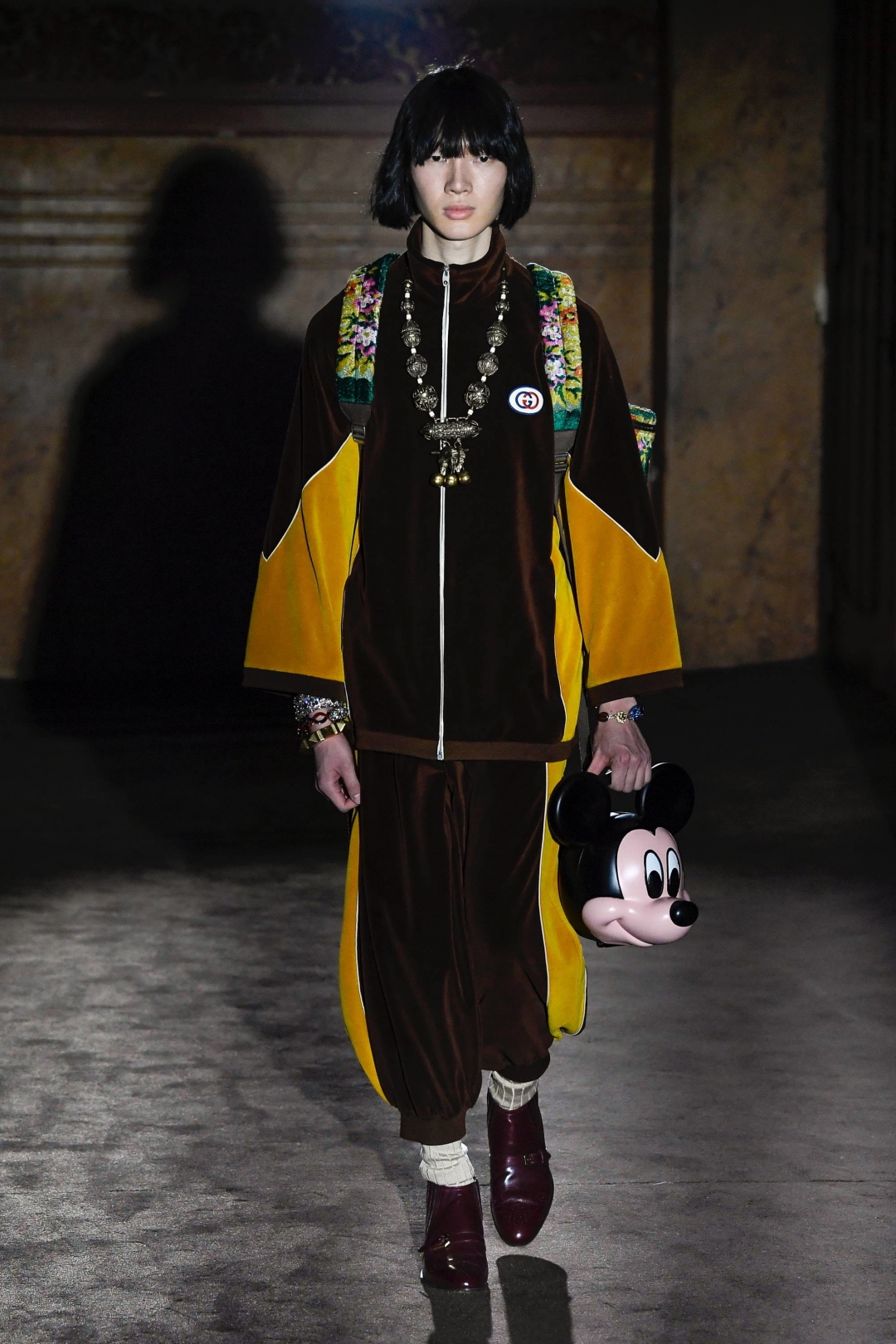 Ну и какой показ Gucci без поп-элементов? На мужских рубашках были вышиты летающие свиньи, на платьях изображены анатомические сердца, громоздкие кроссовки сменялись босоножками на гигантской платформе, а в руках моделей красовалась «отрубленная» голова юбиляра 2018-го — Микки Мауса. В общем и целом Микеле продвигает идею носить все самое лучшее сразу: розовые шубы из эко-меха, плиссированные платья с кружевными вставками, очки, закрывающие пол лица и две (а может и три!) сумки в одной руке. Ведь где еще наряжаться, если не в культовом Le Palace, любимом клубе Ива Сен-Лорана, Карла Лагерфельда и иллюстратора Антонио Лопеса?
