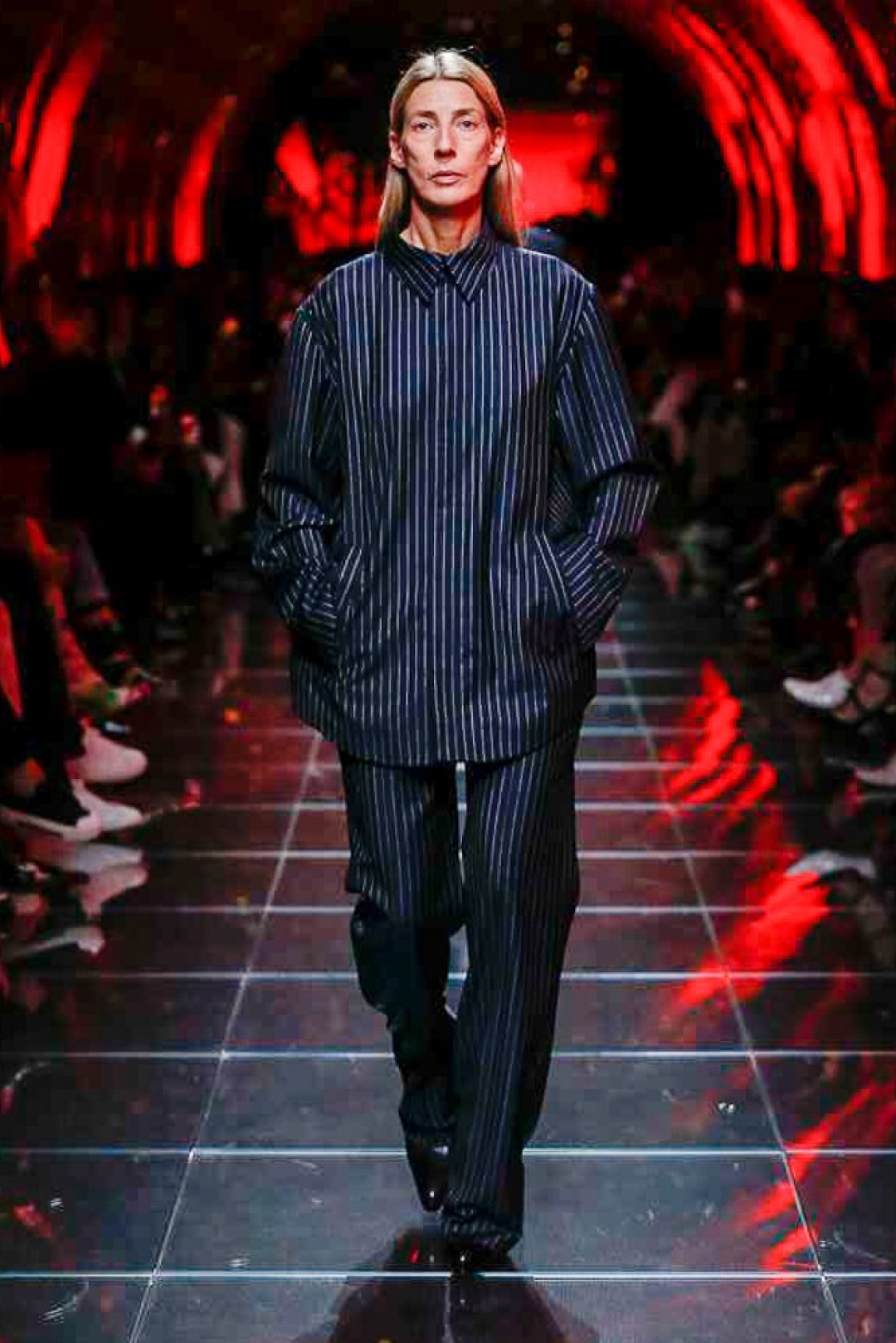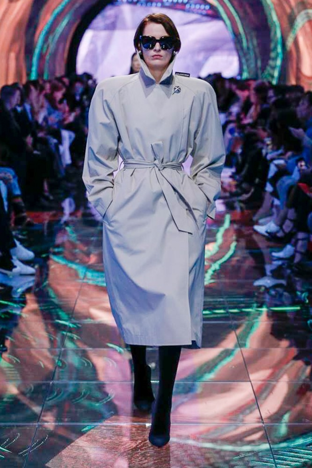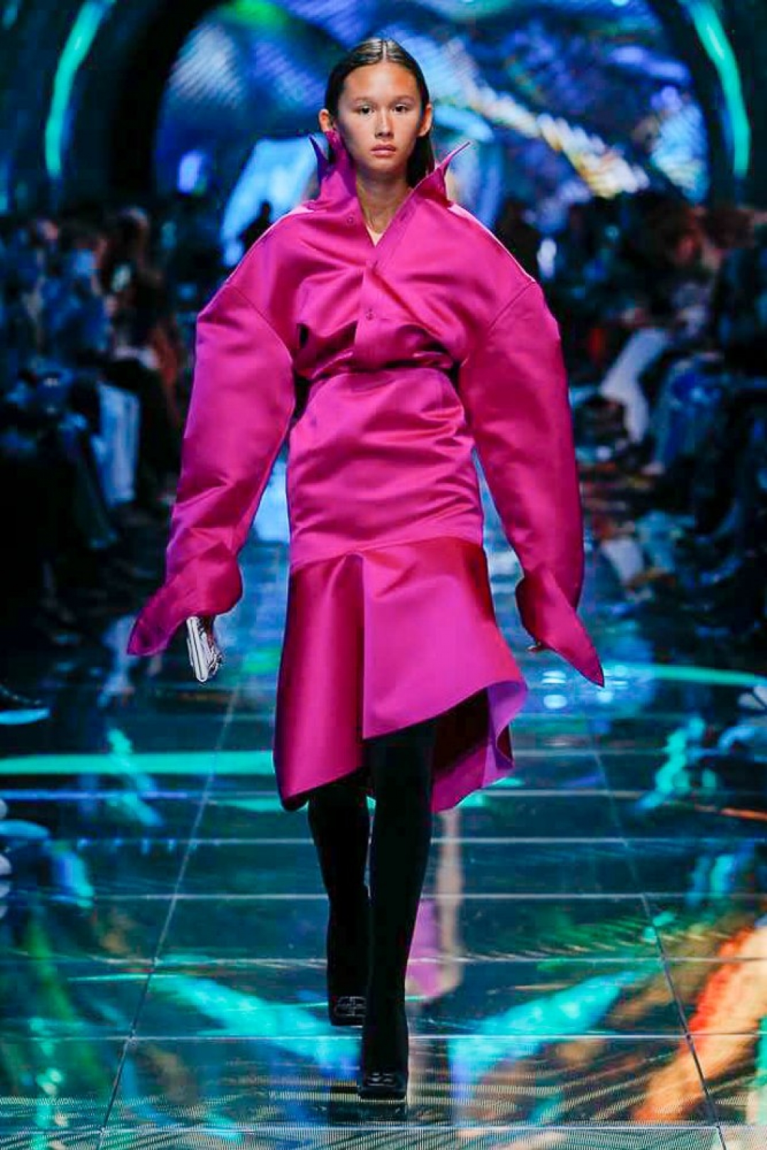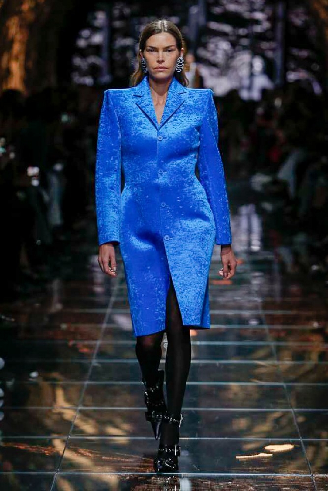 Хотя некоторые свои фишки Демна Гвасалия переносит из сезона в сезон — так, он продолжает делать «сувенирную» продукцию. В прошлых сезонах это были сумки с геолокацией и пейзажами Парижа, в следующем будут черные костюмы с вышитыми Эйфелевыми башнями. Все образы по-прежнему стилизованы крупными украшениями: «цепными» ожерельями или гигантскими серьгами-клипсами. А еще в большинстве выходов есть визуально деформирующие фигуру вещи — пальто с «феминистскими» плечами, рубашки с объемными рукавами, блузы с воротниками-стойками и драпированные платья.