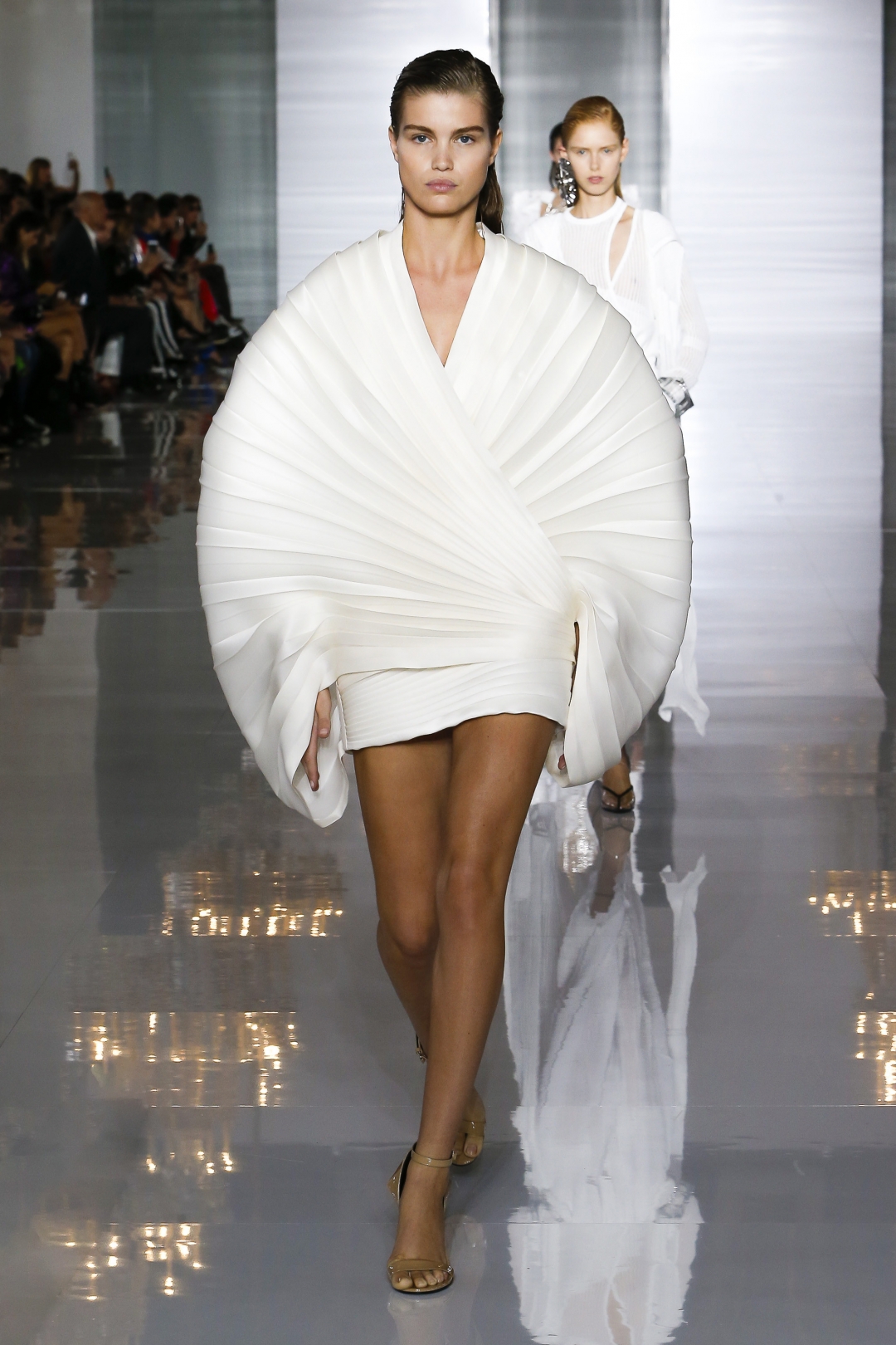 А еще жакеты, блузы и футуристичные бомберы. Все они напоминают пальто Seashell, сделанное японским концептуалистом Issey Miyake в 1980-х годах: плиссировка придает рукавам форму ракушки — и это лучшая интерпретация морской тематики!