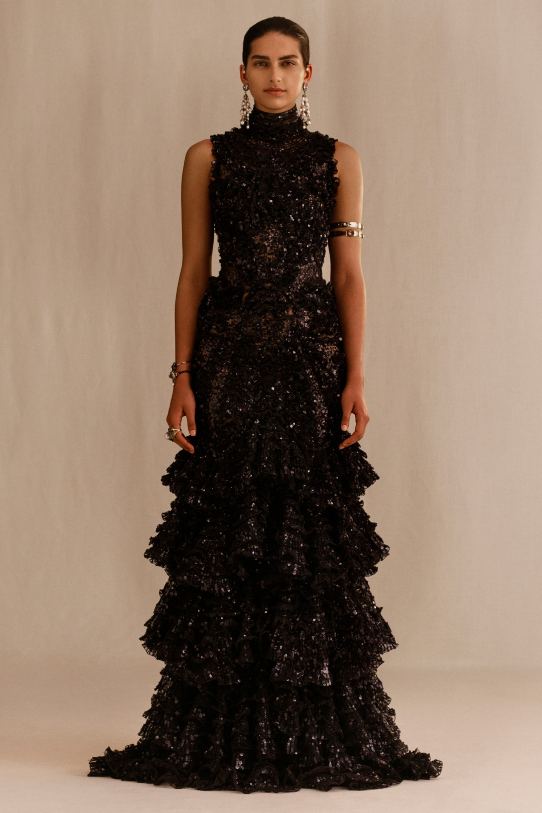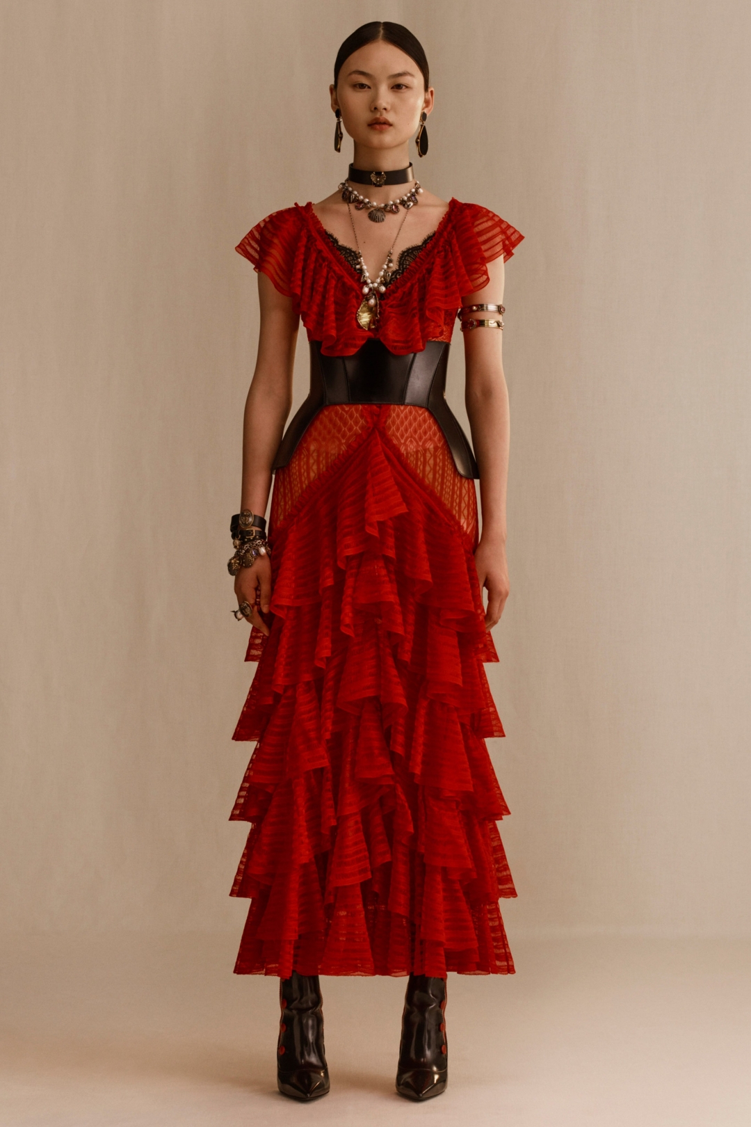 Отсюда — морские принты в виде различных ракушек, кроп-топы, больше напоминающие твердые панцири, бюстье, дополненные драпированным шлейфом-хвостом, и многоярусные платья в чешуе-пайетках. От предыдущих коллекций — осенне-зимней и pre-fall — новая одежда Alexander McQueen практически не отличается, но атмосфера, которую воссоздает вокруг нее дизайнер, делает ее новой, особенной и еще более желанной.