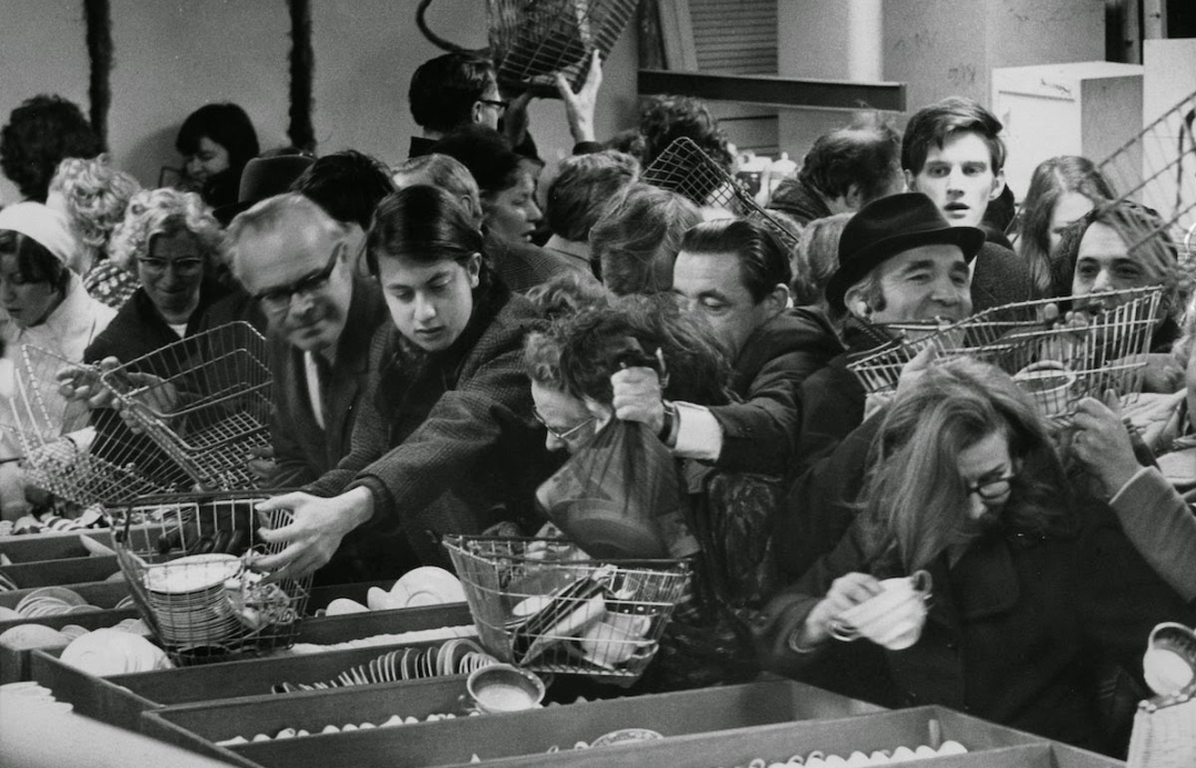 Эти же универмаги ввели и сезонные распродажи, чтобы избавиться от залежалого товара и освободить место на складе. Ранняя реклама распродаж упирала на одну из основных добродетелей протестантской этики — бережливость. Ситуация изменилась в 20 веке, когда маркетинг стал концентрироваться на эмоциях и волнующих ощущениях, а система торговли и демократизация моды дали возможность бессмысленной траты денег людям любого достатка. По данным американских исследователей, от 40 до 70% покупок в торговых центрах — компульсивные. Пожалуй, в дни распродаж и до 90%.