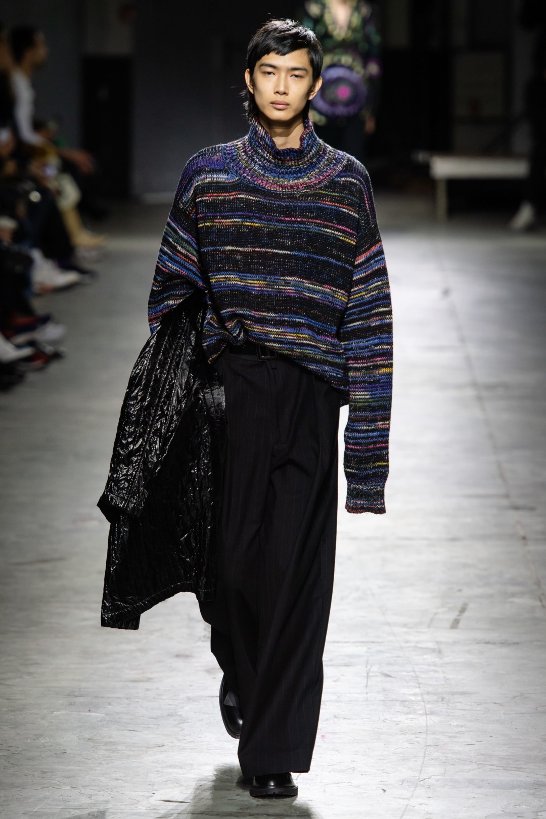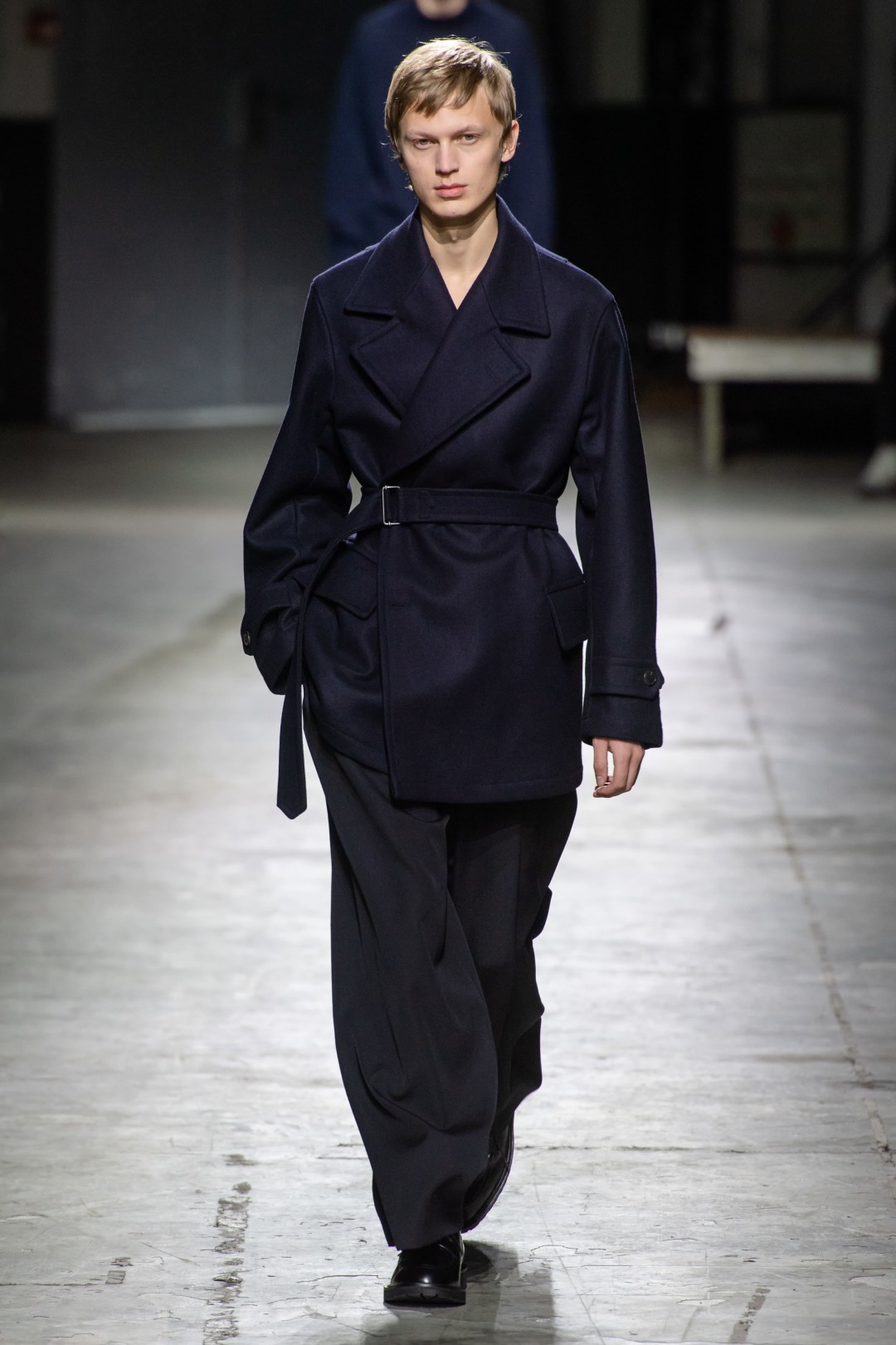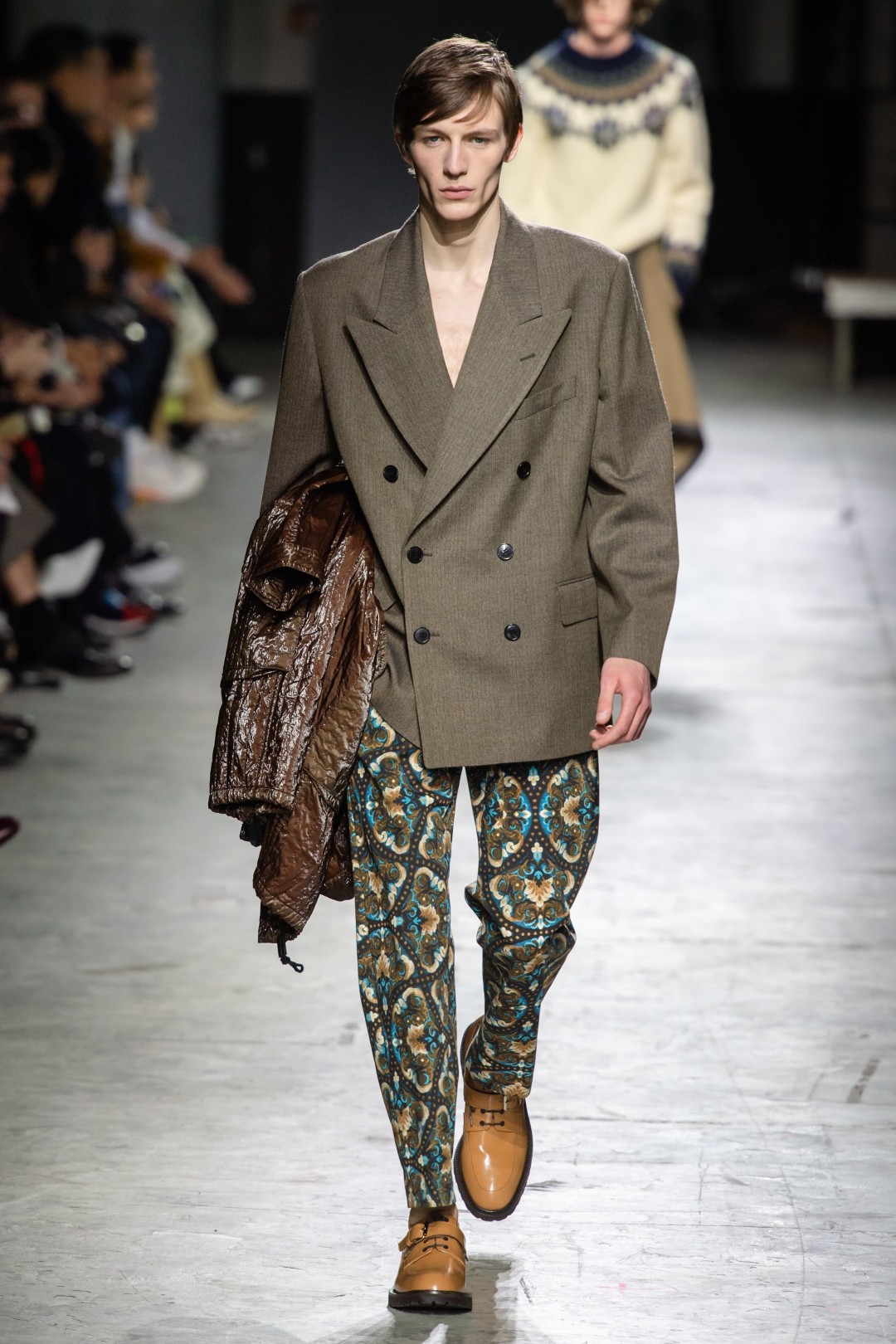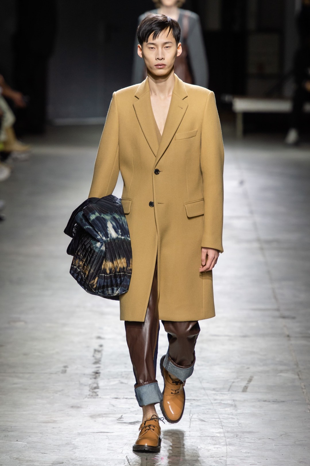 Бельгийский дизайнер Дрис ван Нотен показал мужскую коллекцию сезона осень-зима 2019/20 — со строгими костюмами, разбавленными дутыми шарфами, бланковыми джемперами, заправленными в брюки с тай-дай эффектом, драповыми пальто, перетянутыми поясными сумками, и «рабочими» комбинезонами, сделанными из эко-кожи.