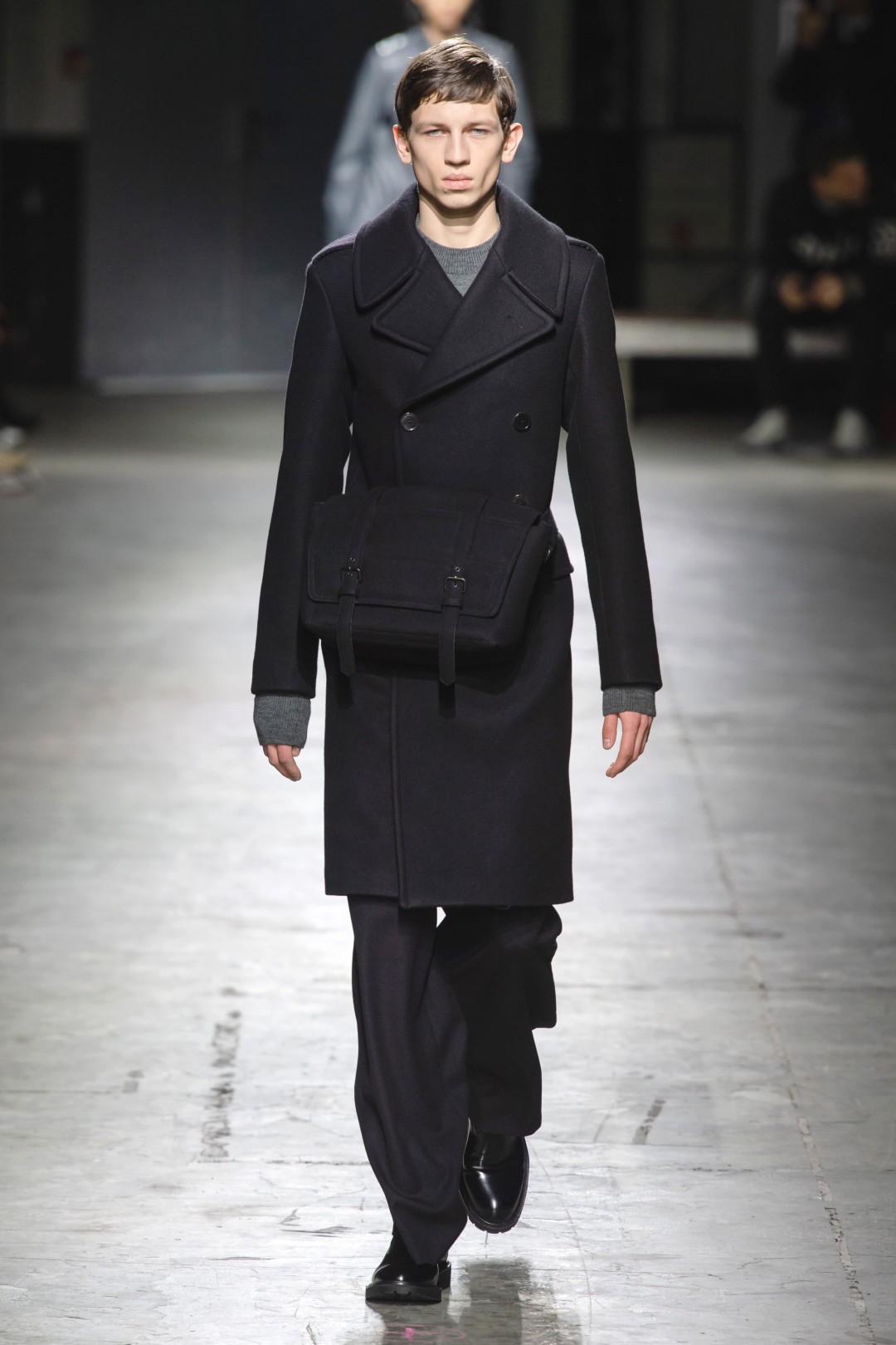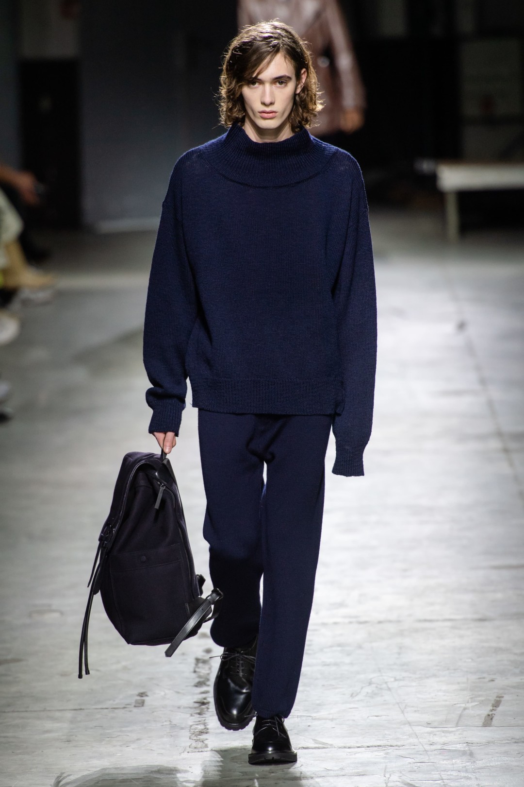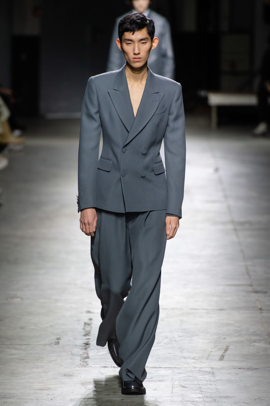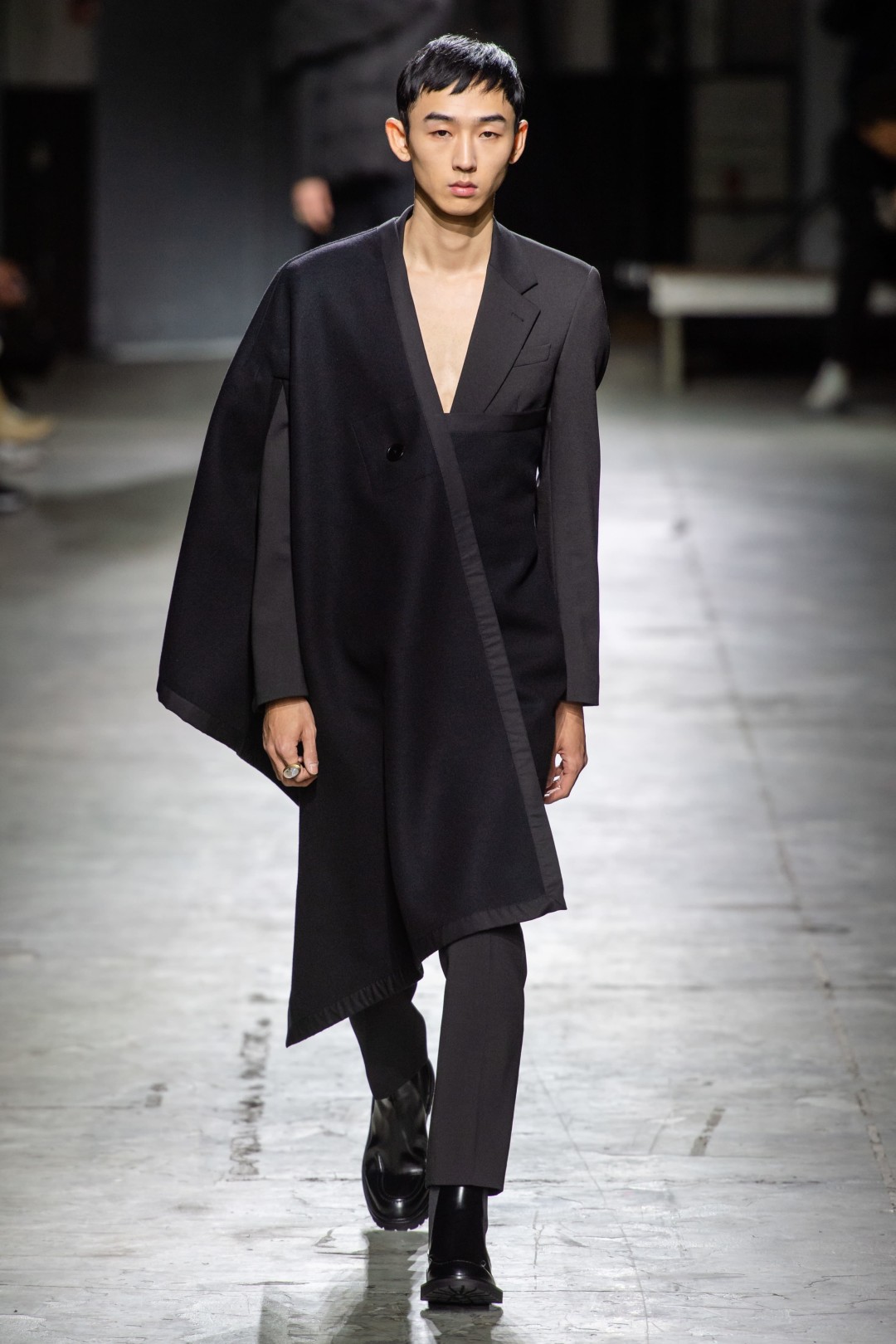 Бельгийский дизайнер Дрис ван Нотен показал мужскую коллекцию сезона осень-зима 2019/20 — со строгими костюмами, разбавленными дутыми шарфами, бланковыми джемперами, заправленными в брюки с тай-дай эффектом, драповыми пальто, перетянутыми поясными сумками, и «рабочими» комбинезонами, сделанными из эко-кожи.