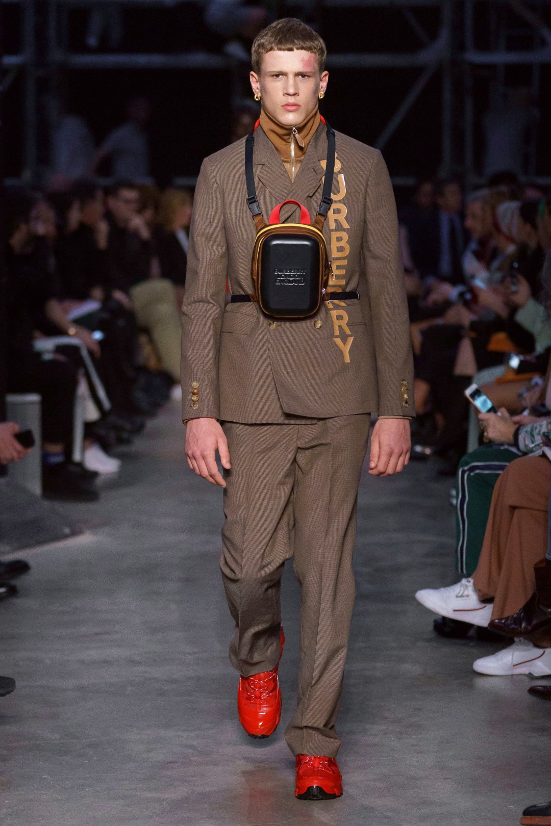 Одним из новых кодов Burberry стали элементы стайлинга: кроссовки с контрастной подошвой, напоминающей бахилы, «армейские» ботинки, дополненные неопреновыми носками, шнурки от толстовок, завязанные морским узлом, шелковые платки, украшенные фотопринтами, и сезонные версии сумок TB Bag и Title, прекращающие бесконечные споры о том, можно ли носить клатч мужчине.