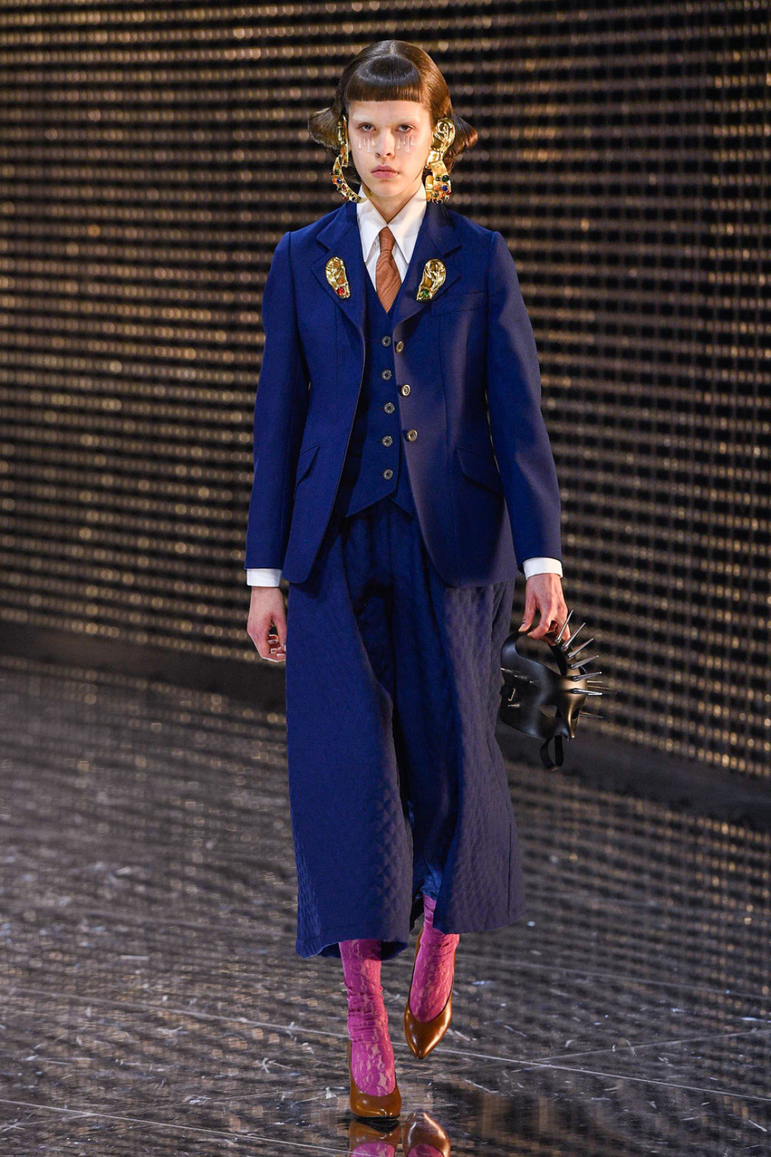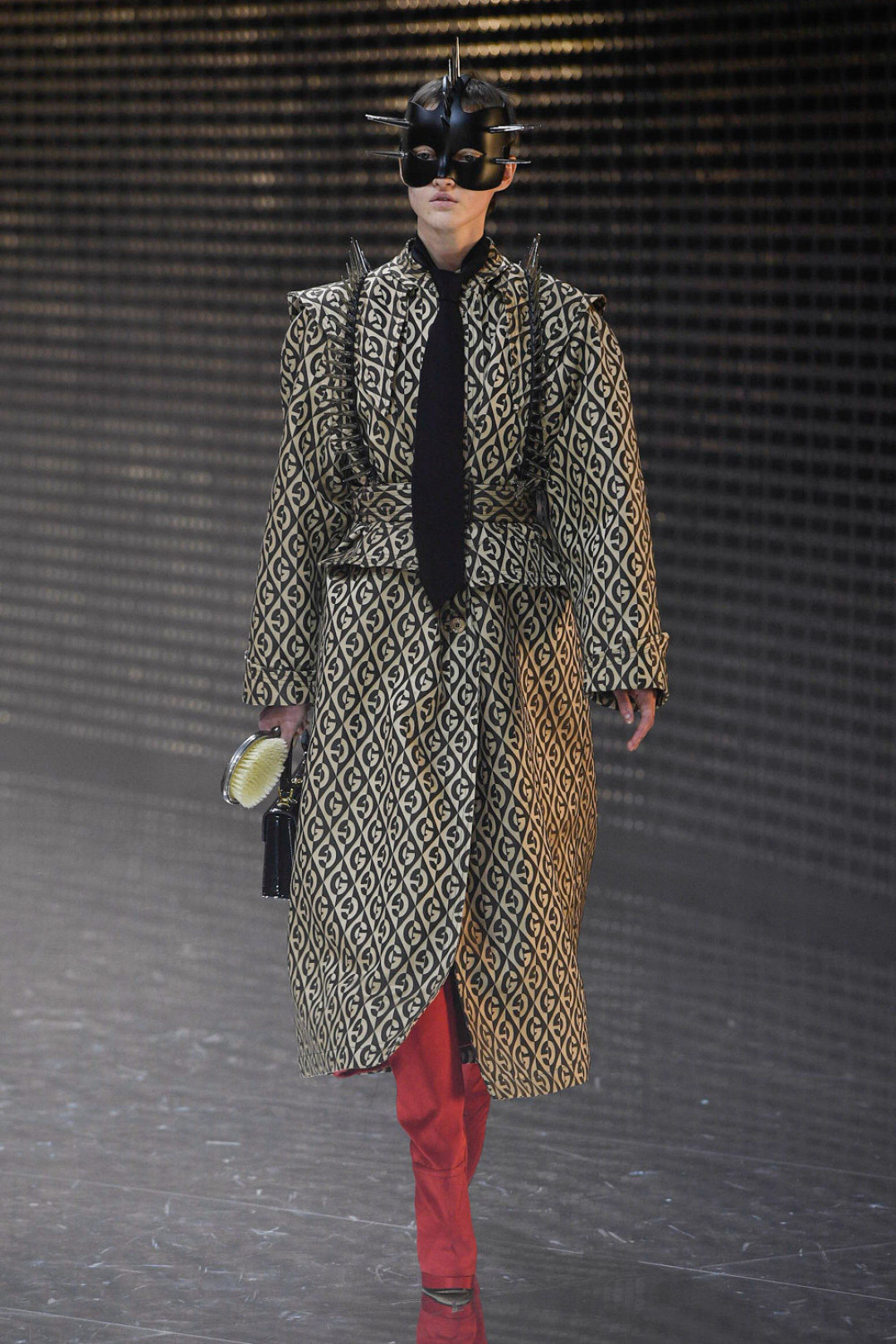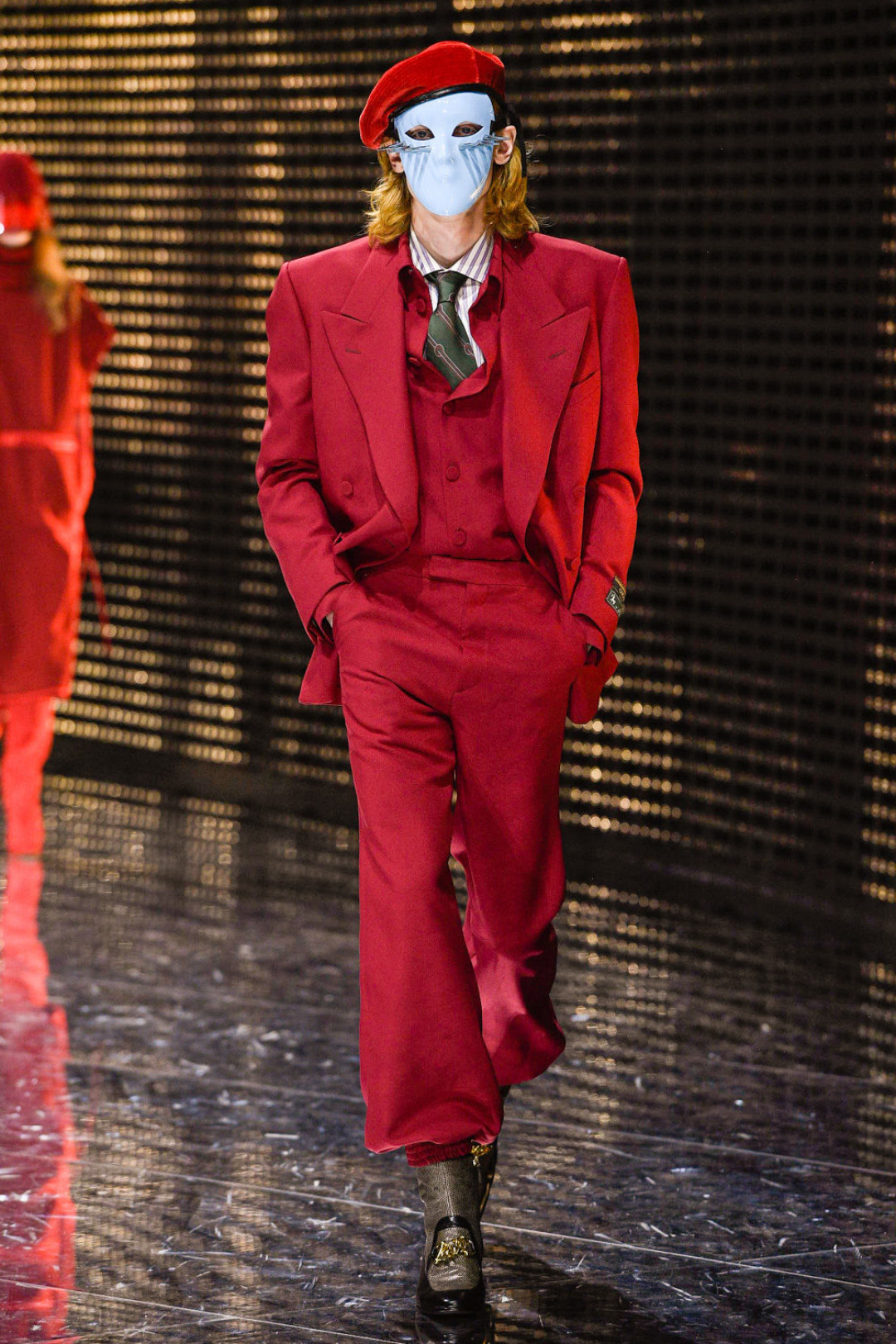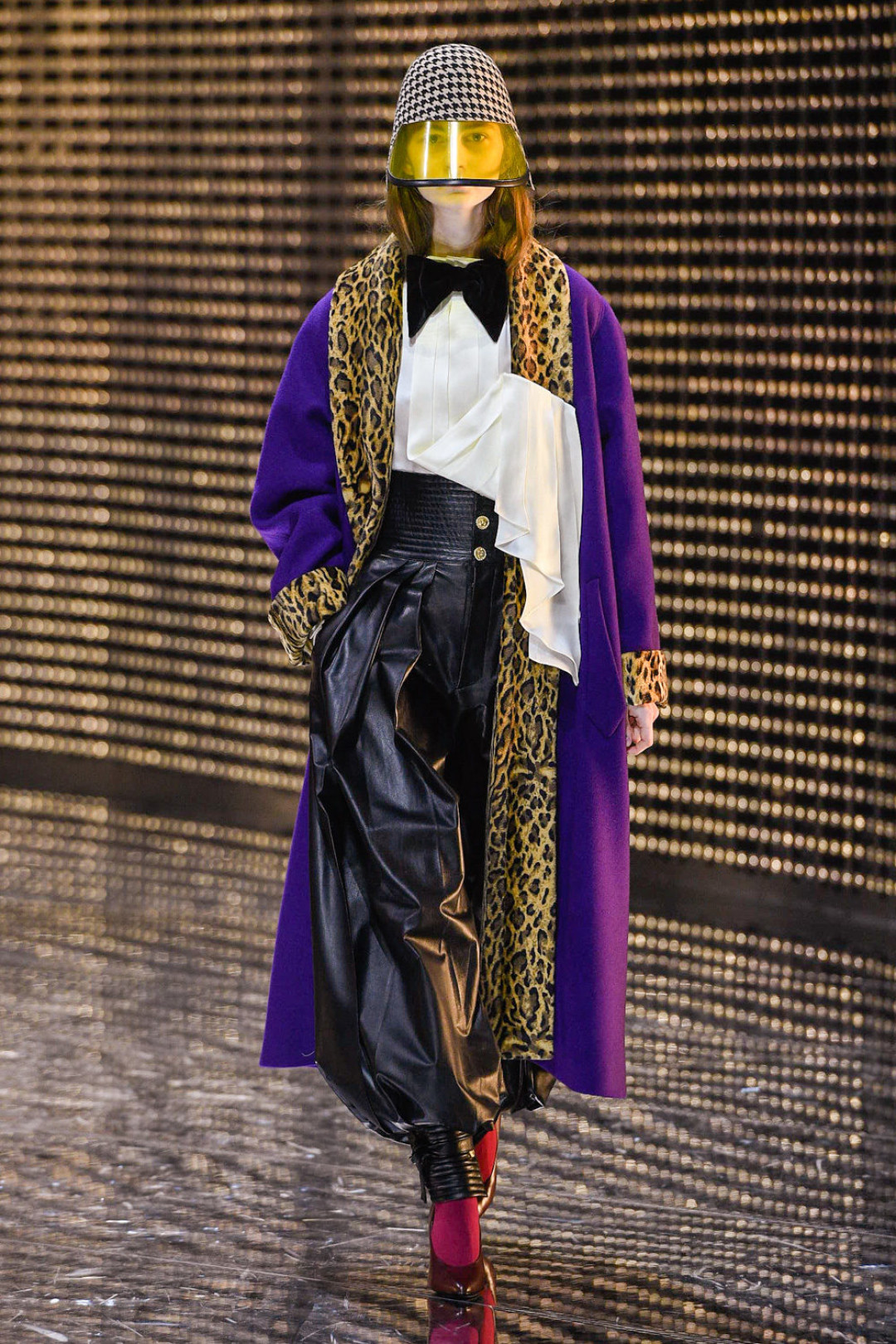 Если в прошлом сезоне Gucci ввели в моду балаклавы, то в следующем итальянский бренд настаивает на масках: фиолетовые, розовые, красные, дополненные шипами и прозрачными козырьками — лучший стайлинг для шерстяных костюмов, барочных платьев, твидовых жакетов и вязаных жилетов с изображением козленка. Еще один важнейший аксессуар с показа — массивный чокер, отсылающий к БДСМ-стилистике: его креативный директор Gucci мешает с брюками на подтяжках, нарядами с вензелями, многоярусными жакетами и кружевными колготками разных цветов.