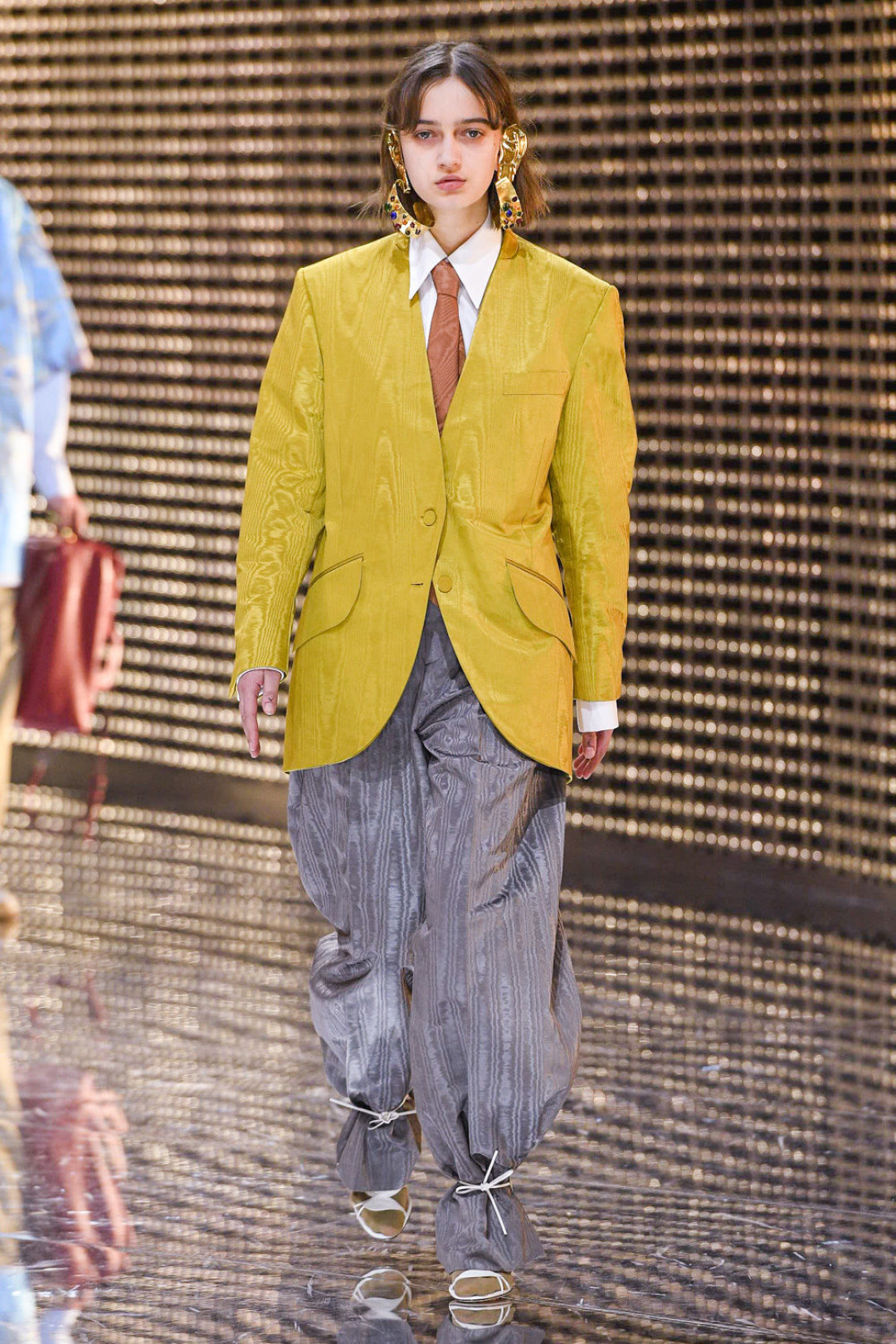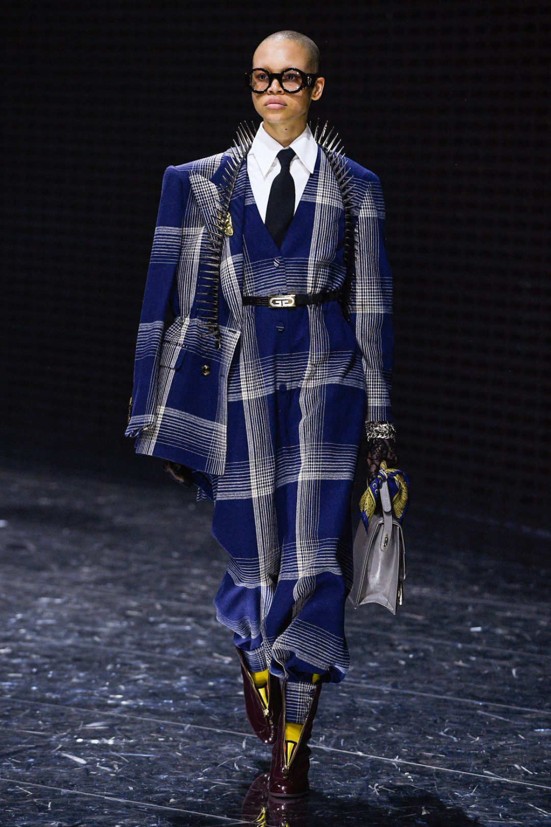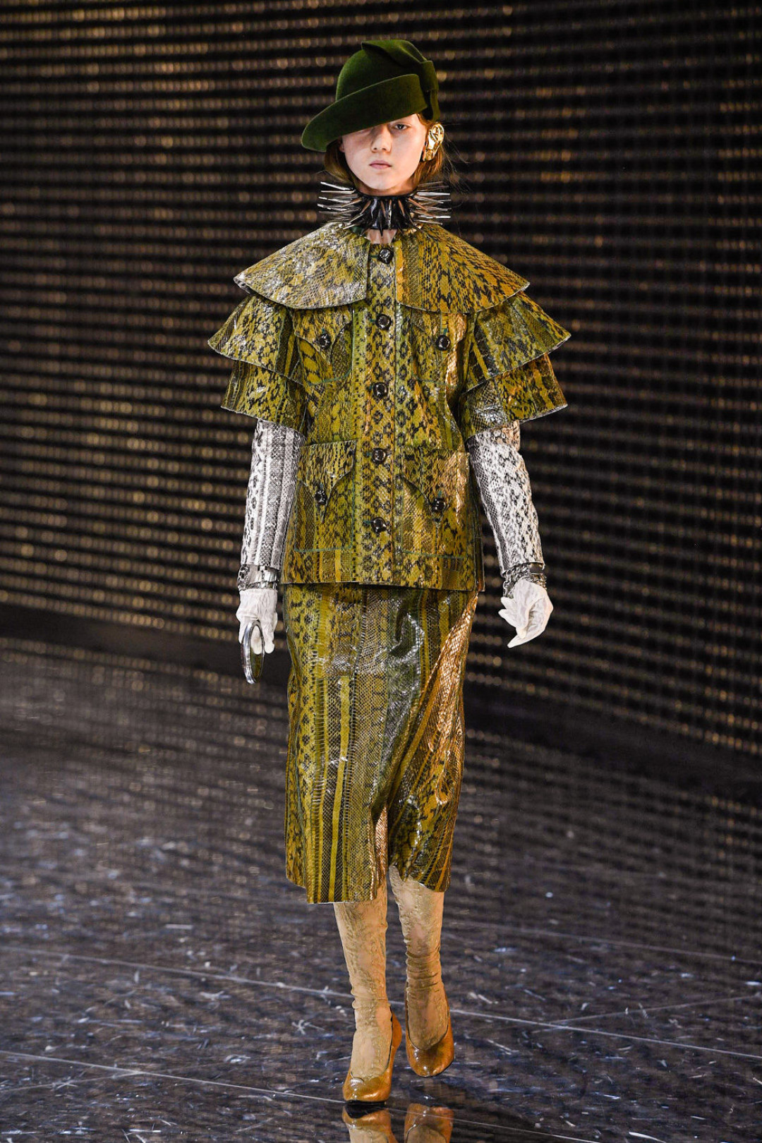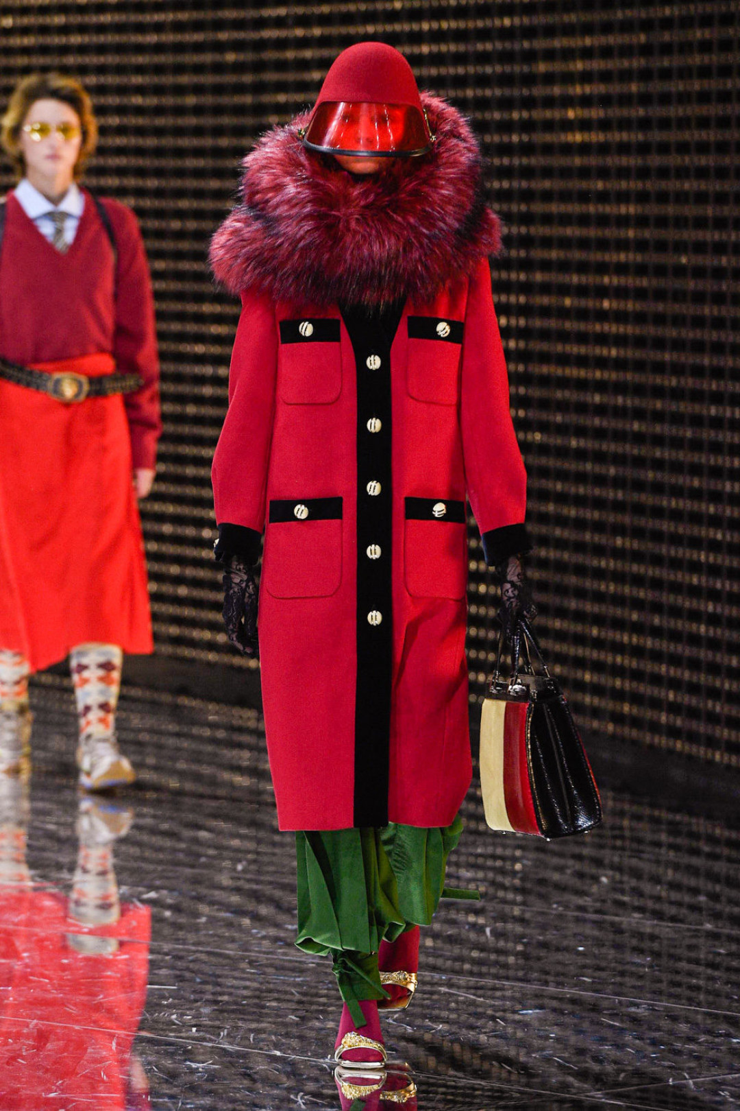 Если в прошлом сезоне Gucci ввели в моду балаклавы, то в следующем итальянский бренд настаивает на масках: фиолетовые, розовые, красные, дополненные шипами и прозрачными козырьками — лучший стайлинг для шерстяных костюмов, барочных платьев, твидовых жакетов и вязаных жилетов с изображением козленка. Еще один важнейший аксессуар с показа — массивный чокер, отсылающий к БДСМ-стилистике: его креативный директор Gucci мешает с брюками на подтяжках, нарядами с вензелями, многоярусными жакетами и кружевными колготками разных цветов.