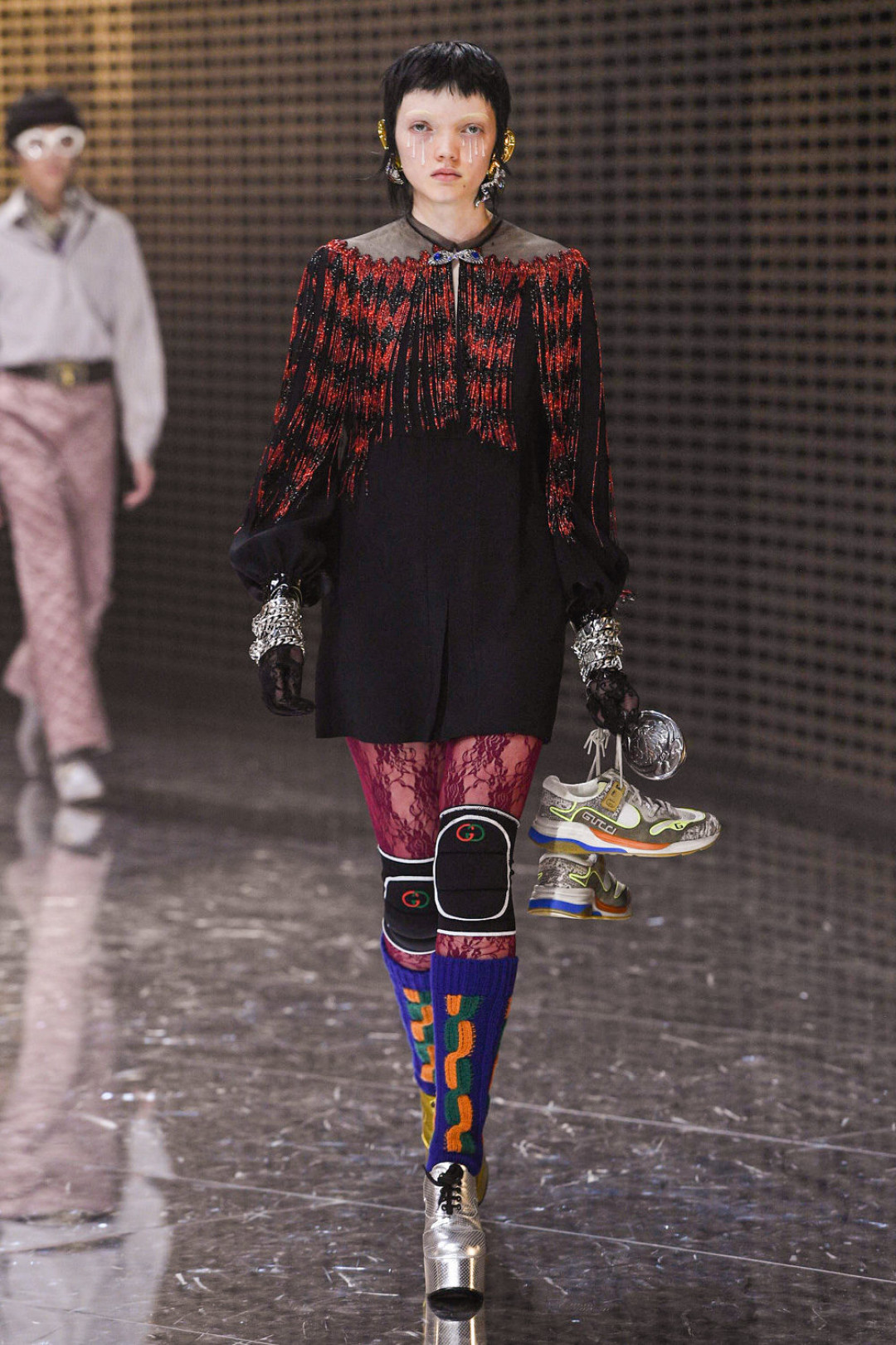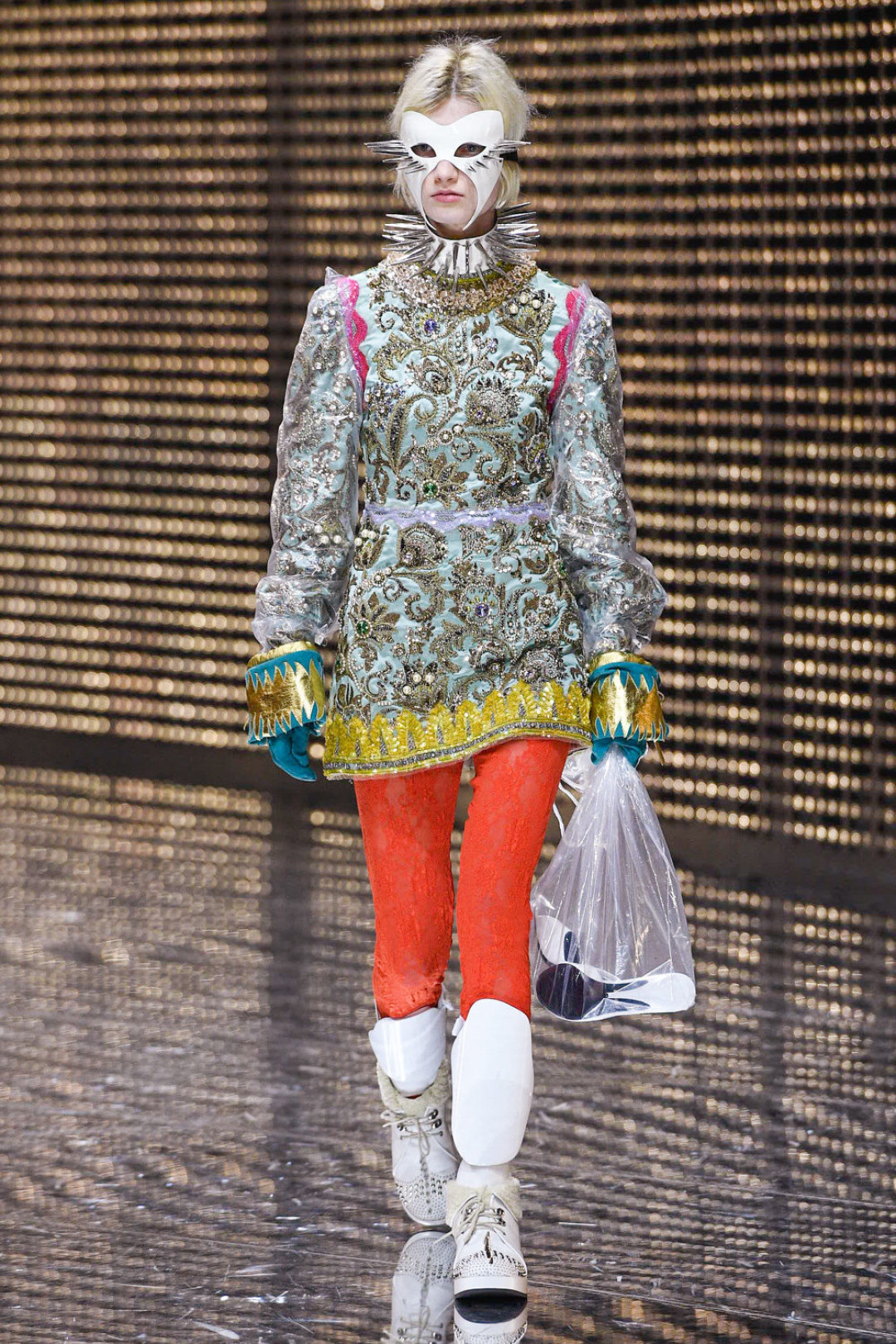 Недели моды переместились в Милан — одним из первых свою осенне-зимнюю коллекцию показал бренд Gucci. На 100-метровом зеркальном подиуме, украшенном 120 000 светодиодных лампочек, появились вариации Алессандро Микеле на тему греческой мифологии, фантазийных эльфов, героев фильма «Пятница 13» и золотых украшений Eduardo Costa.
