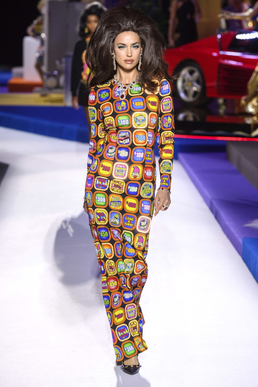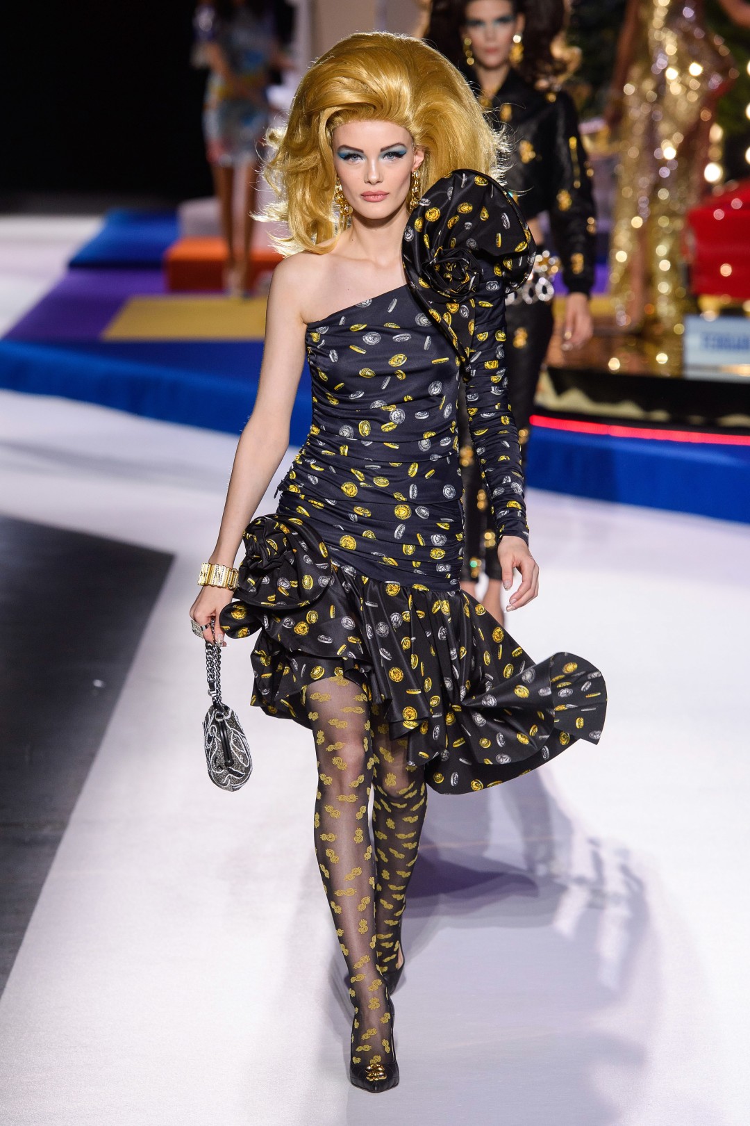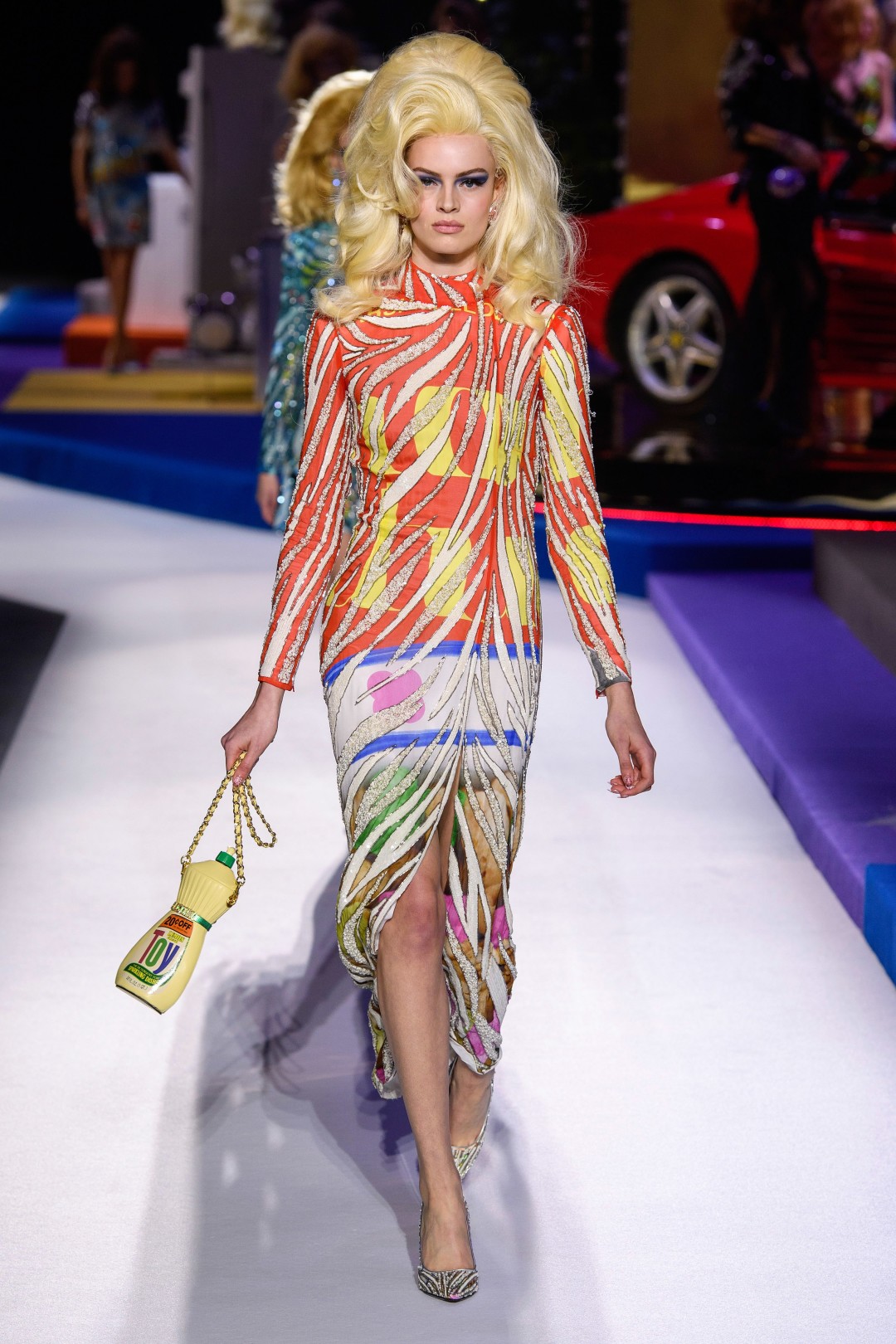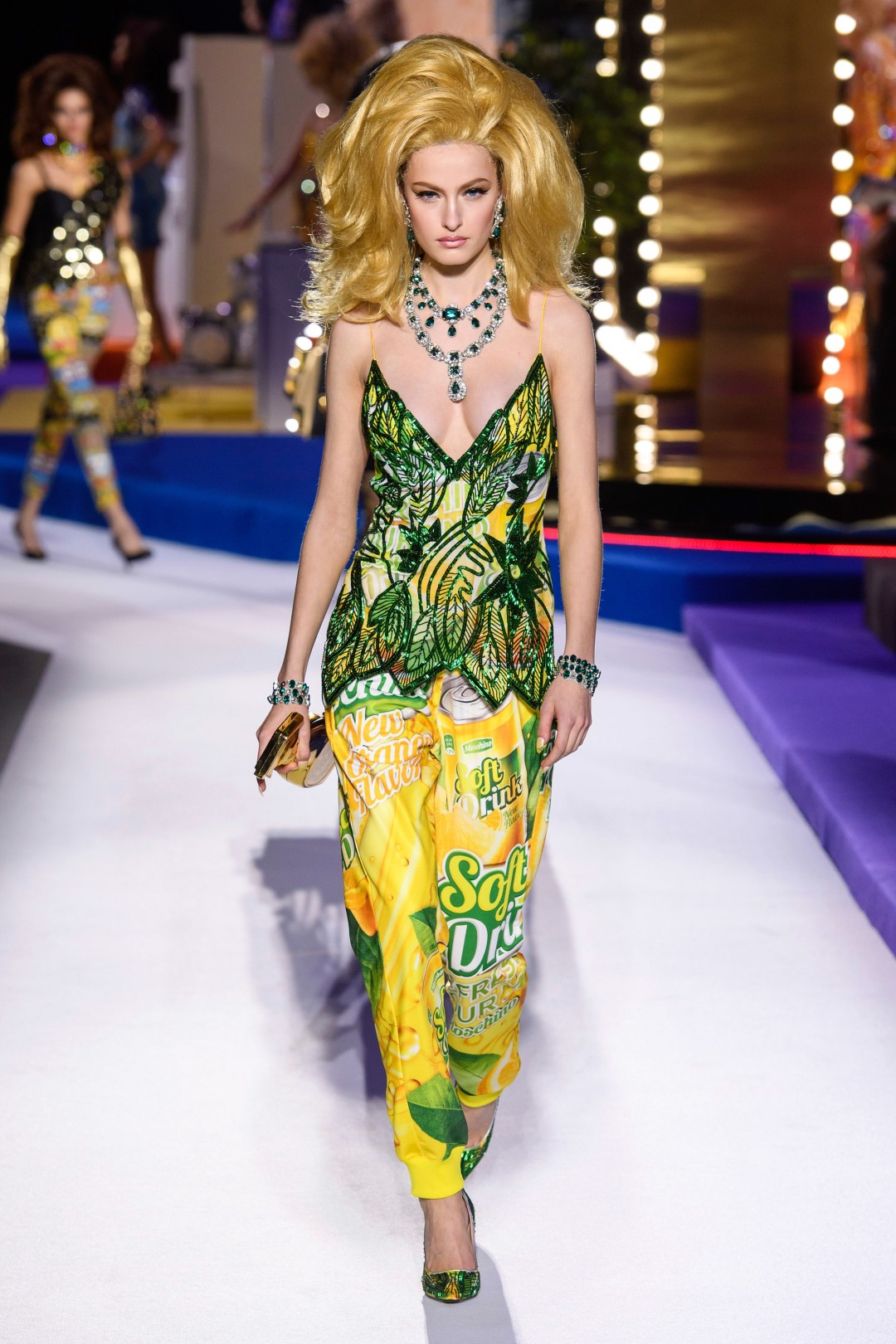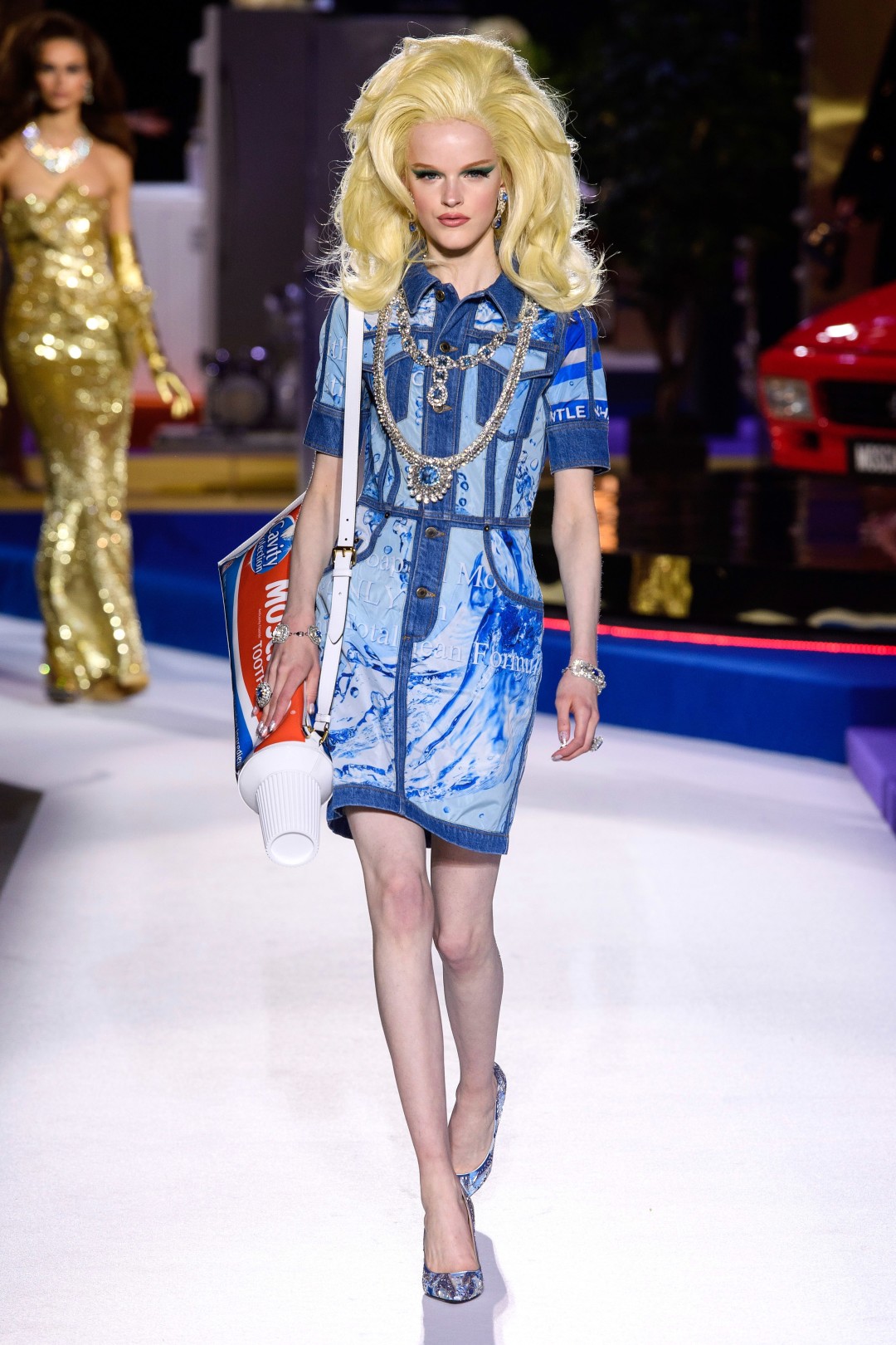 В этот вечер на крутящемся подиуме в Милане «продавали» моющие средства, зубные пасты и счетные машинки, превратившиеся в компактные вечерние сумки. Они стилизовали шубы из плюшевых игрушек, платья из детских ковриков и жакеты с имитацией долларовых банкнот, а также фирменные вещи бренда — джинсовые юбки, позолоченные сарафаны и кожаные куртки со стразами. Закрывал телемарафон костюм в виде плотного обеда: именно под такое пюре в сочетании с мексиканской едой американцы и смотрят подобные распродажи.