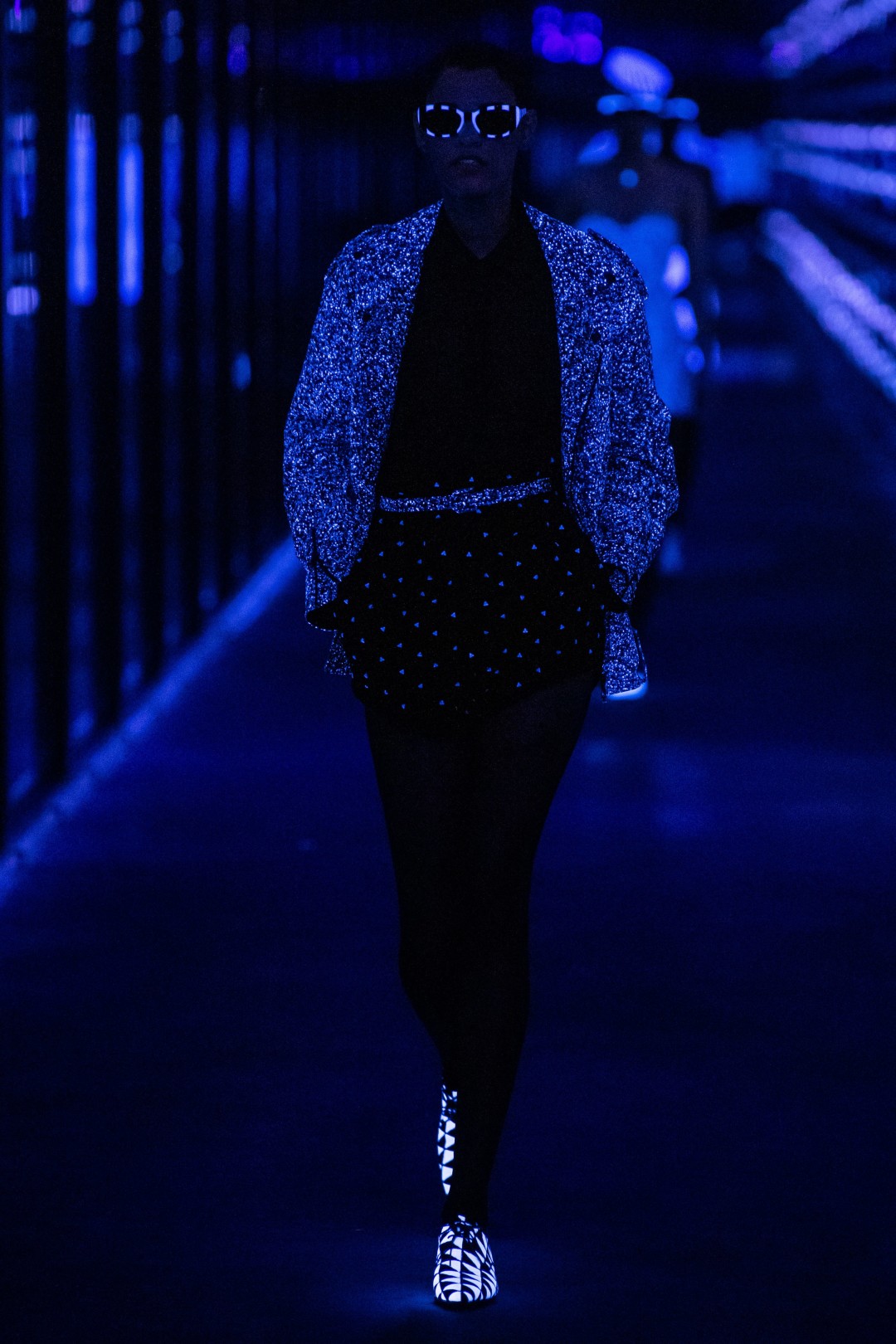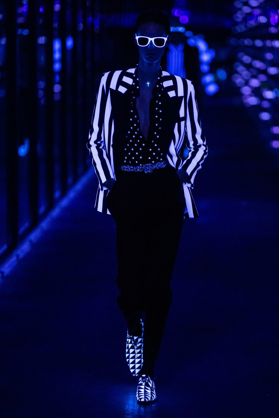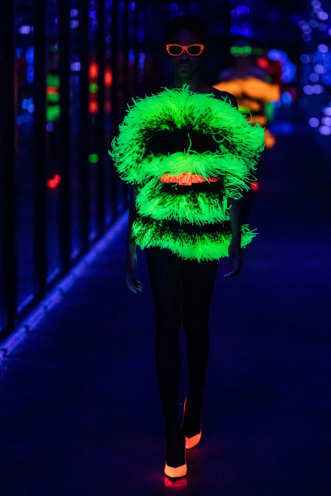 Вещи в конце показа у них рассмотреть не получилось — неожиданно на площади Трокадеро погас свет, а на подиуме появились флуоресцентные вещи со страусиными перьями. Кислотно-оранжевые, зеленые и розовые наряды дополняли такие же яркие ремни, очки, туфли и шляпы-таблетки. Рейв (и кутюр) не закончатся никогда!
