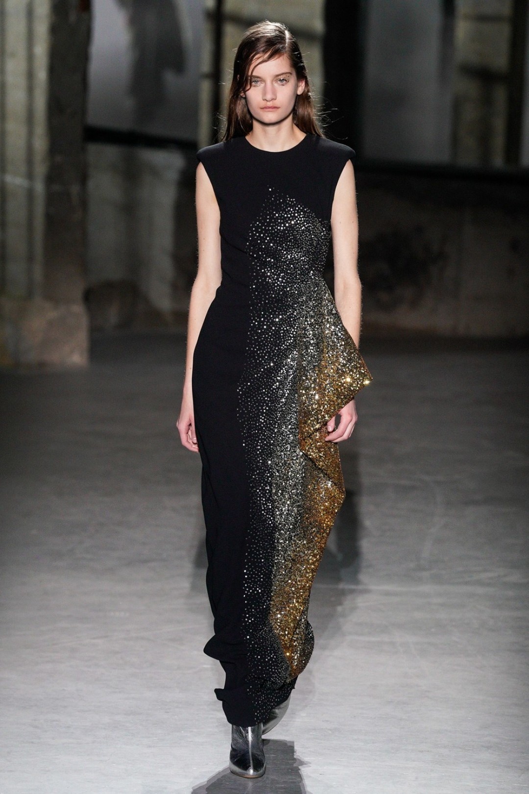 Представляли коллекцию тоже петербурженки: модель Tann Model Management Лия Павлова — в пестром воротнике из эко-меха и с пуховиком, мимикрирующим под сумку, и воспитанница Aurora Model Management Алина Болотина — в черном платье с переливающейся драпировкой, которое точно появится на красной дорожке в этом году.