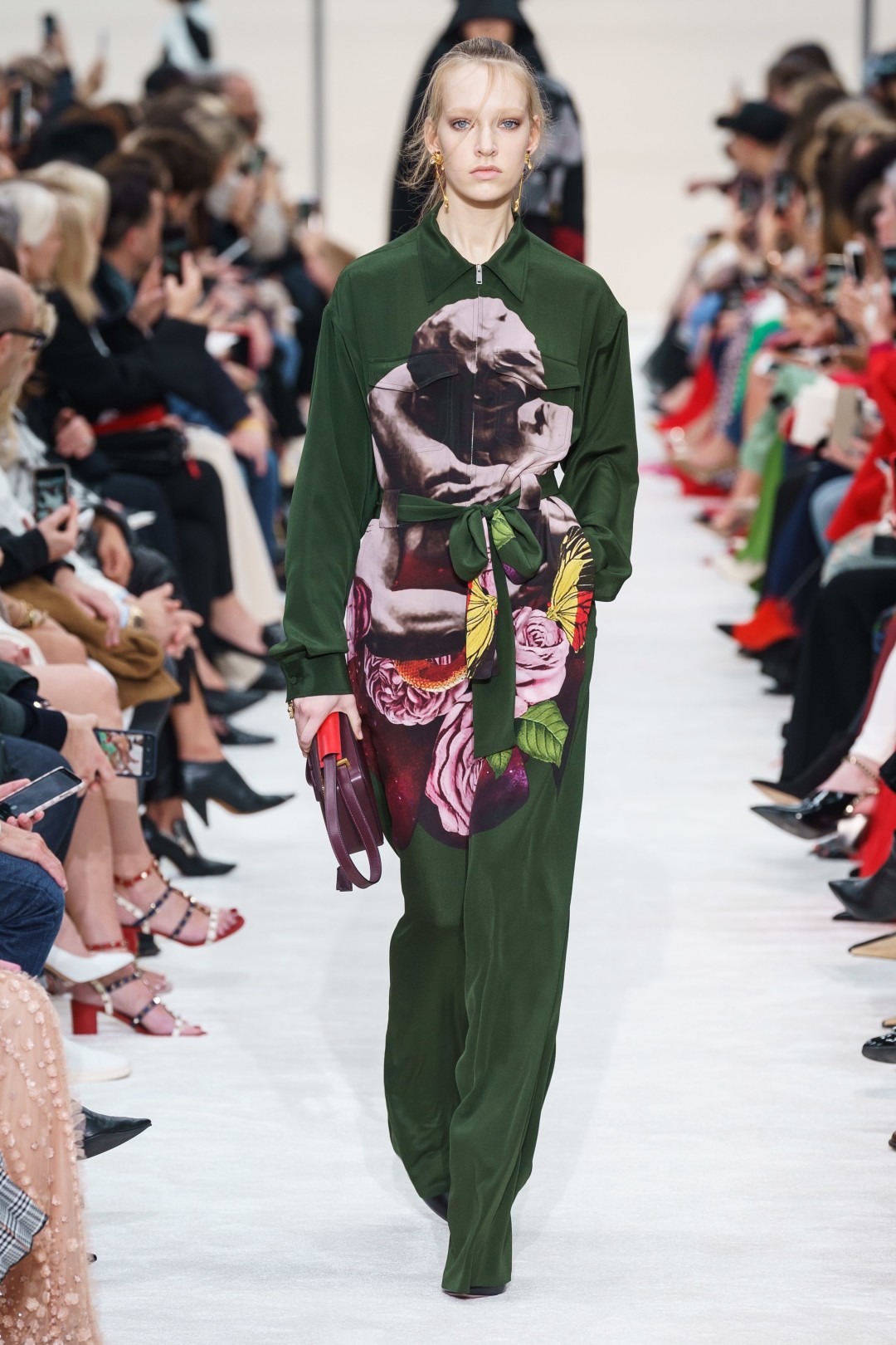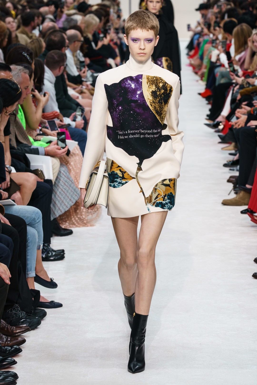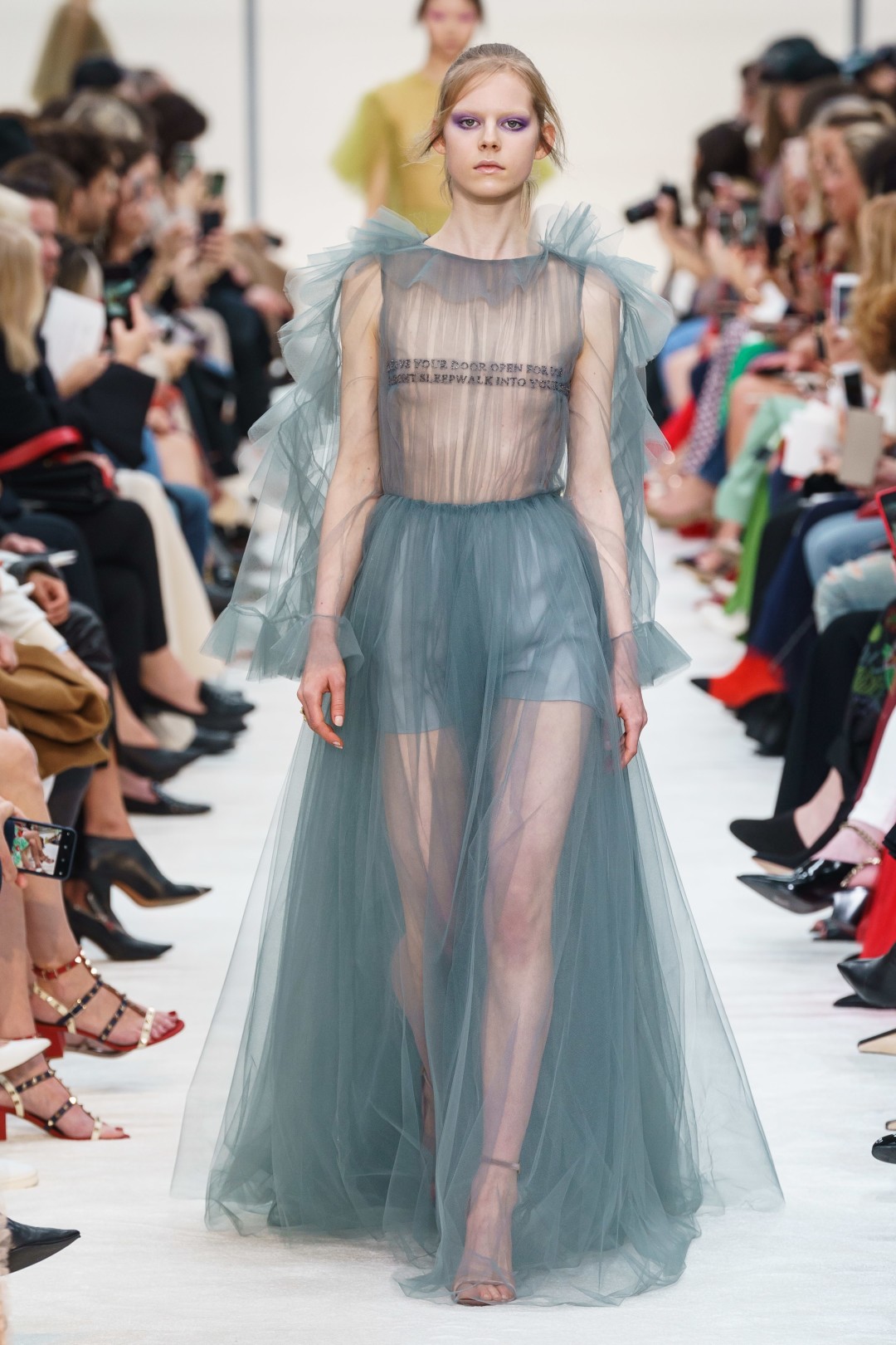 На коктейльные платья, летние комбинезоны, минималистичные жакеты и шляпы-колпаки креативный директор Valentino нанес коллажи от дизайнера Undercover Джуна Такахаши, который уже сотрудничал с французским брендом в рамках мужской коллекции. А архитектурные пальто, белоснежные шубы и бадлоны с кружевными вставками «облепил» цитатами Роберта Монтгомери, который также предоставил для показа свою знаменитую инсталляцию «The people you love become ghosts inside of you, and like this you keep them alive» («Люди, которых вы любите, становятся призраками внутри вас. И таким образом вы делаете их живыми»)