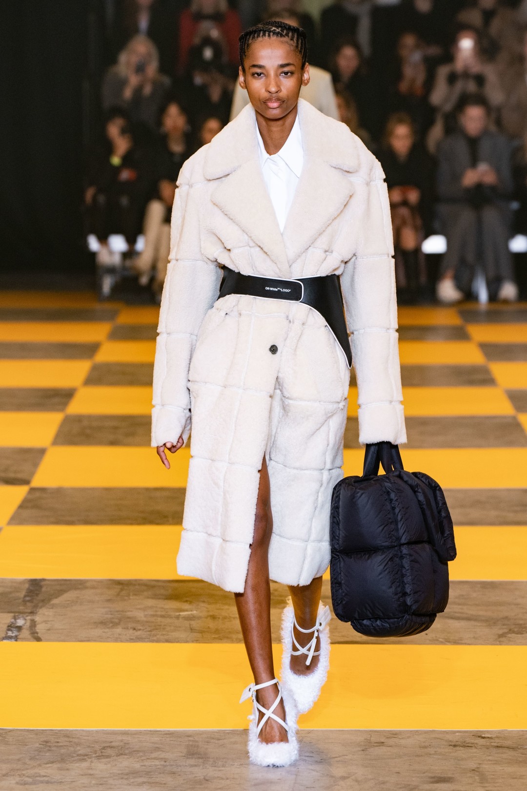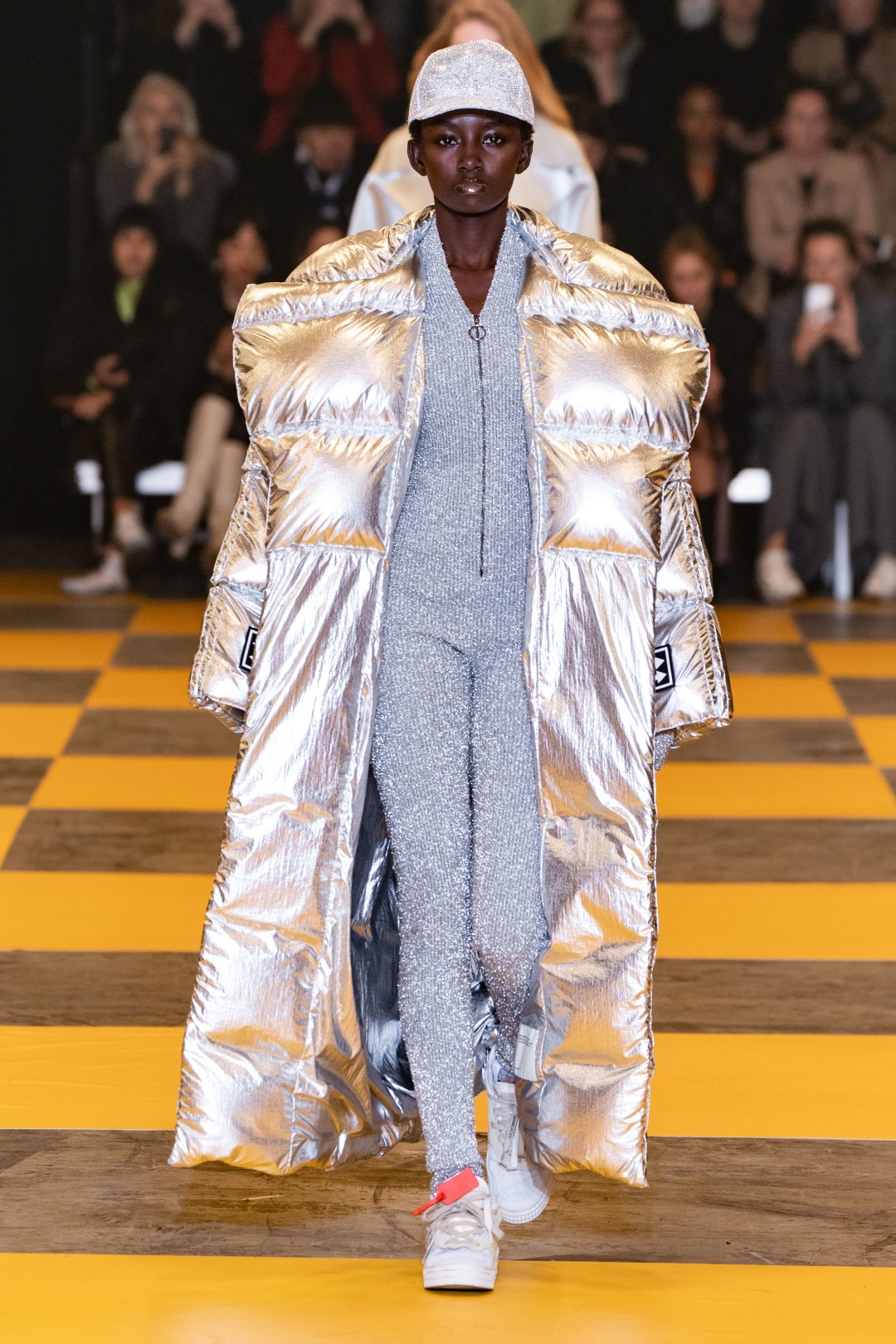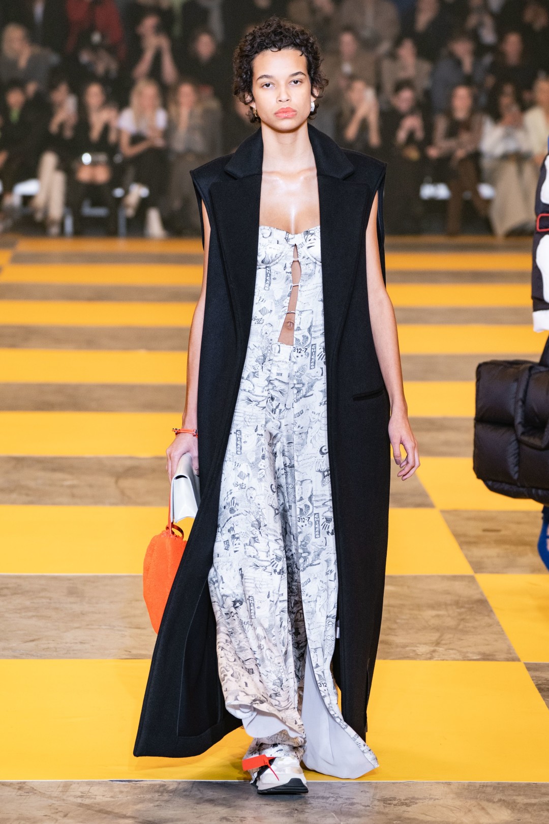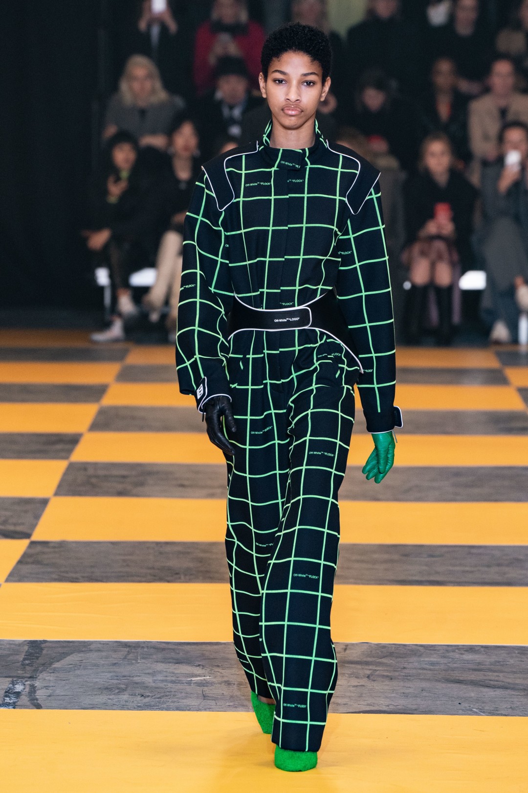 В осенне-зимней коллекции Off-White основатель и креативный директор бренда Вирджил Абло продолжает разговаривать о спорте: после сентябрьского показа, посвященного многоборью (с участием бегуньи Вашти Каннингем, спринтера Дина Эшер-Смит и олимпийской чемпионки Нафиссату Тиам), он переключился на авто и мото-спорт. Об этом говорили платья будто бы из гоночных флагов, дутые куртки как у участников Формулы-1 и комбинезоны как у пит-стопщиков, перетянутые фигурными кожаными ремнями.