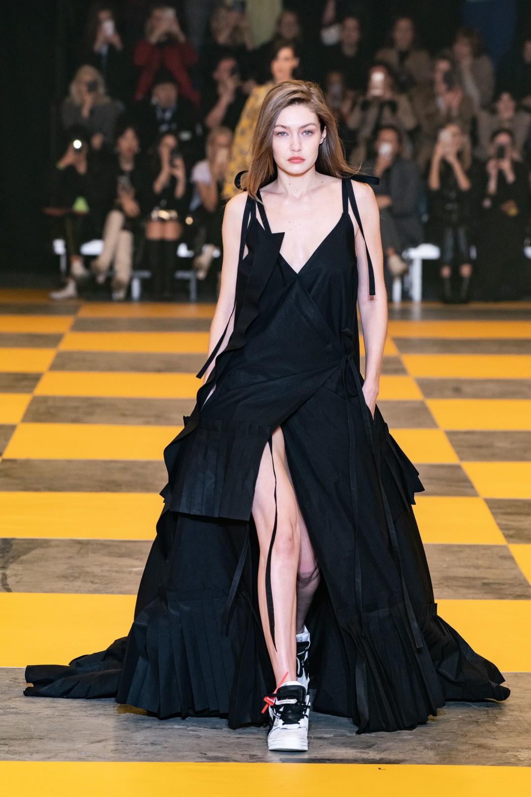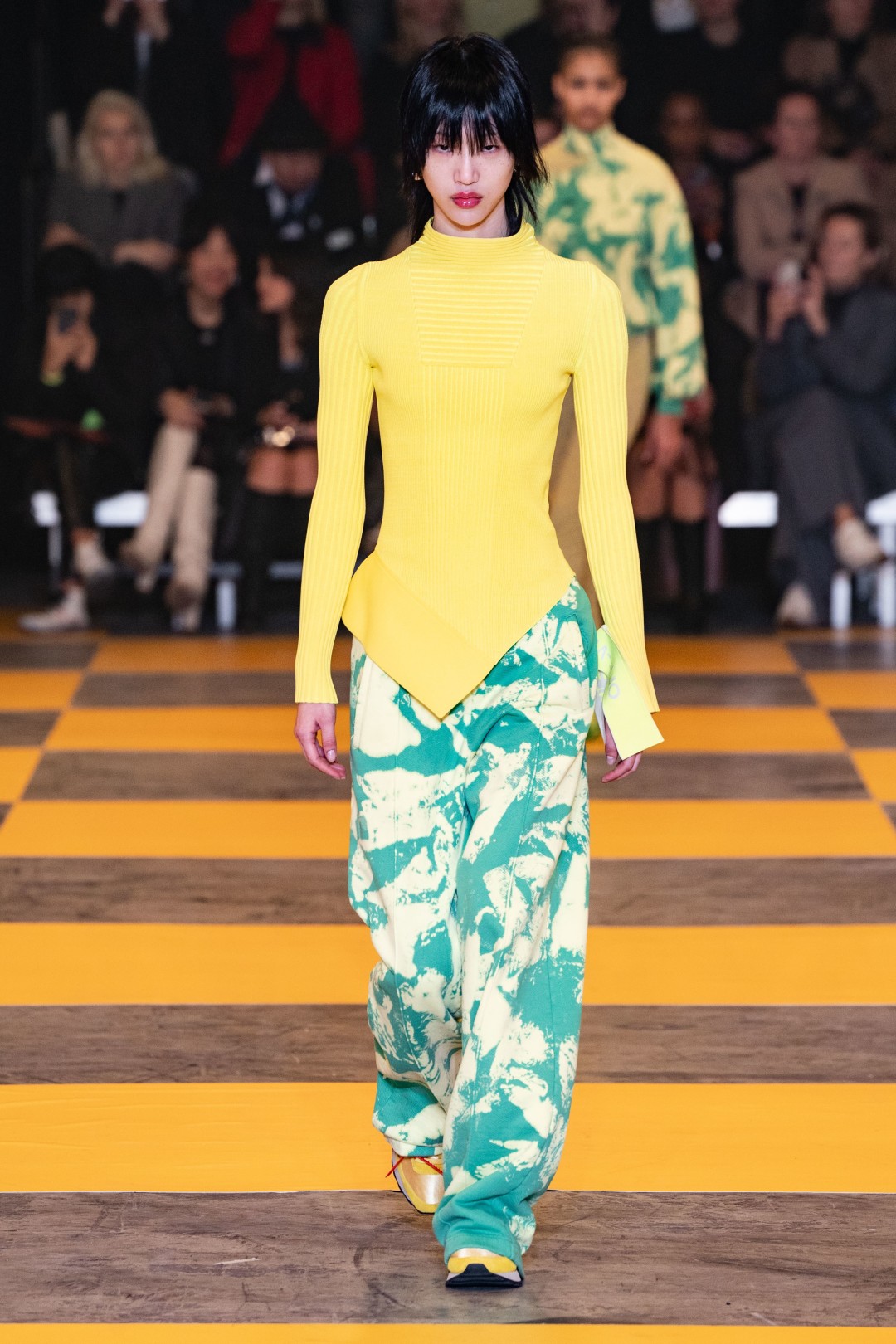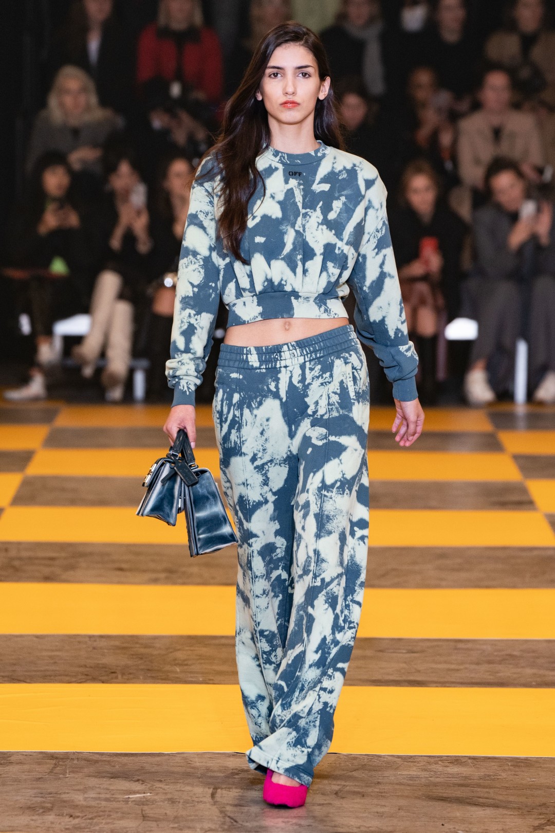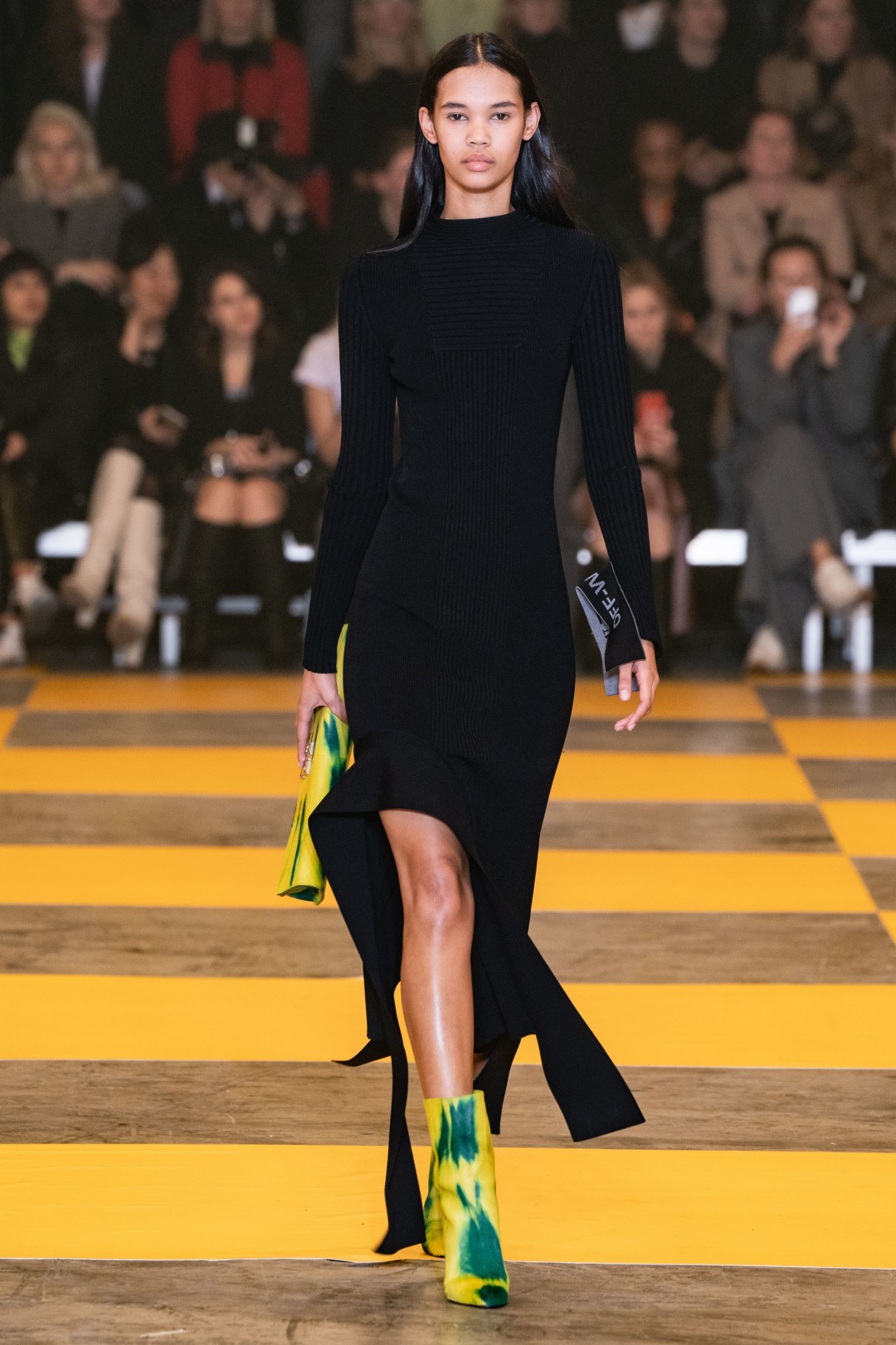 В осенне-зимней коллекции Off-White основатель и креативный директор бренда Вирджил Абло продолжает разговаривать о спорте: после сентябрьского показа, посвященного многоборью (с участием бегуньи Вашти Каннингем, спринтера Дина Эшер-Смит и олимпийской чемпионки Нафиссату Тиам), он переключился на авто и мото-спорт. Об этом говорили платья будто бы из гоночных флагов, дутые куртки как у участников Формулы-1 и комбинезоны как у пит-стопщиков, перетянутые фигурными кожаными ремнями.