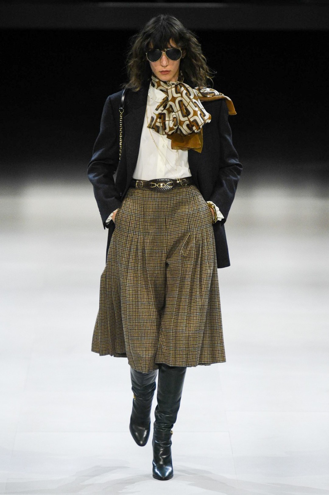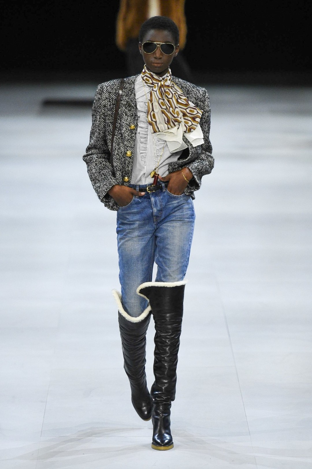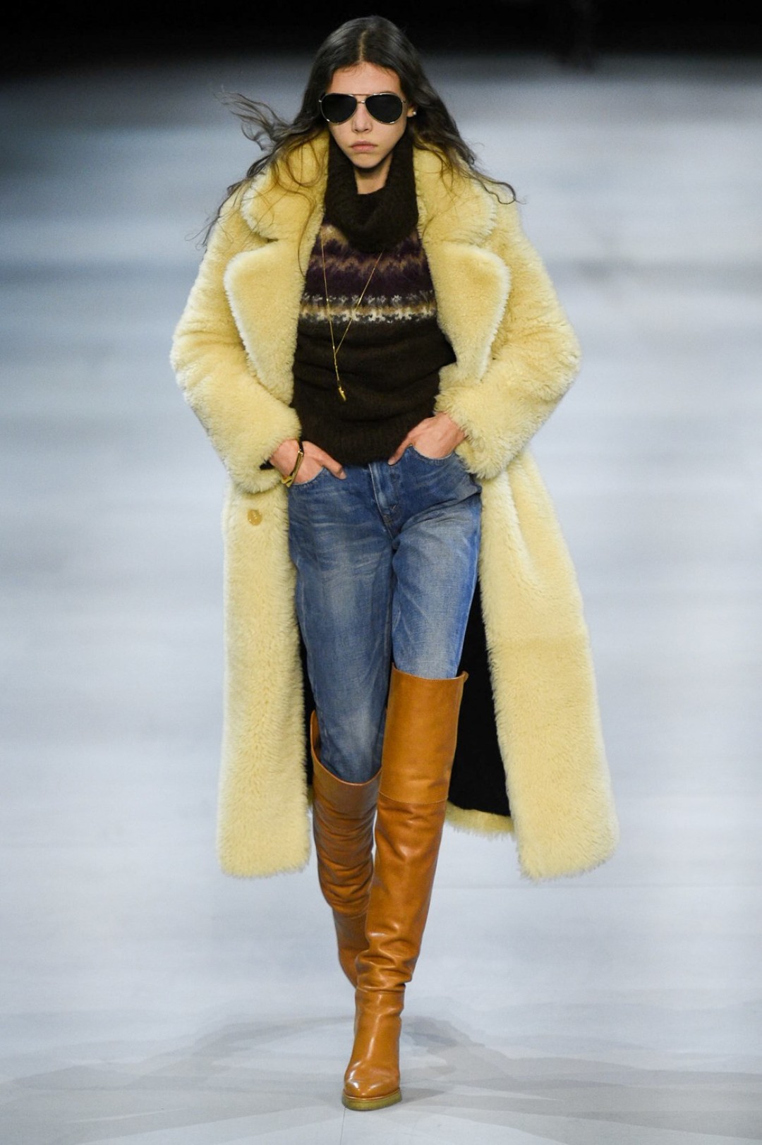 В этот раз на подиуме царили 1970-е: апогей унисекса (с образами, которые подходят и девушкам, и парням), расцвет preppy (с брендированными бомберами и шерстяными юбками), культ джинсов (надетых под ботфорты или обрезанных по колено) и возвращение диско (через пиджаки в пайетках и юбки, сверкающие как дискобол).