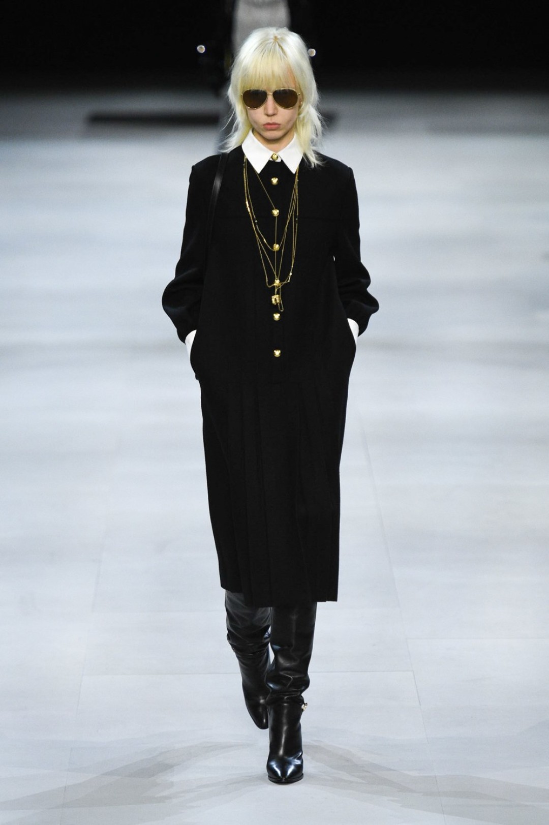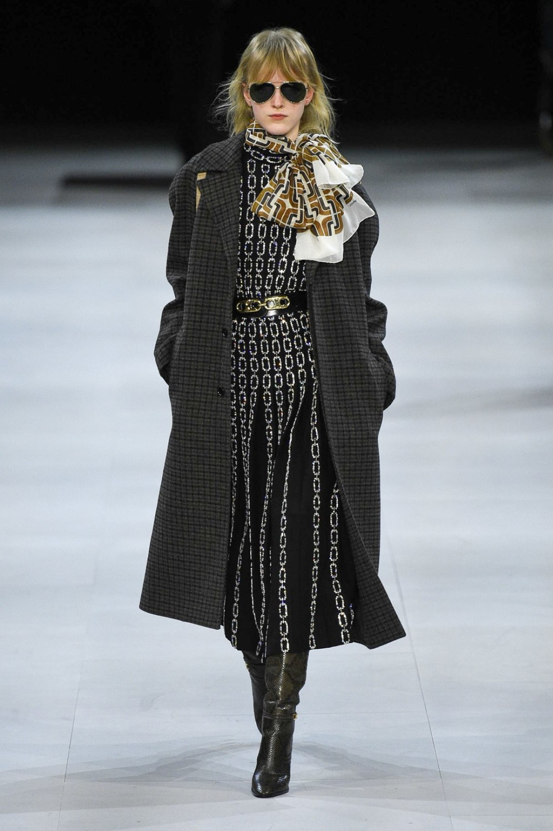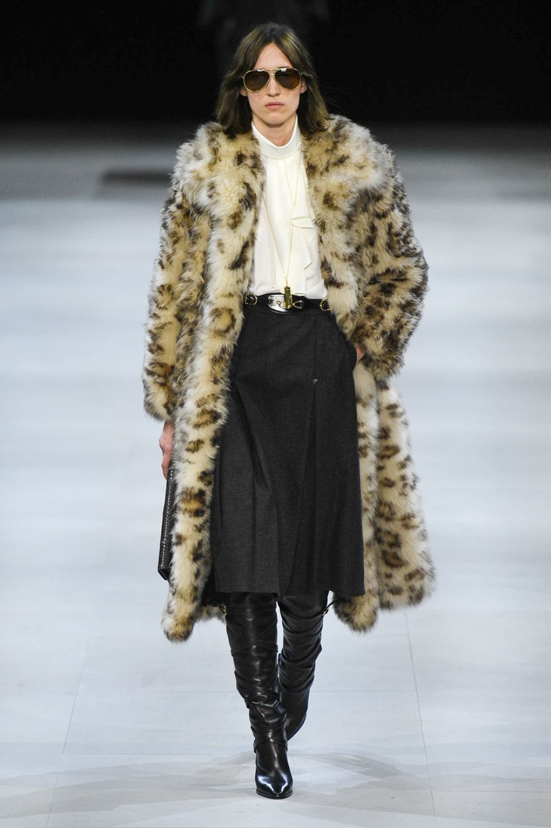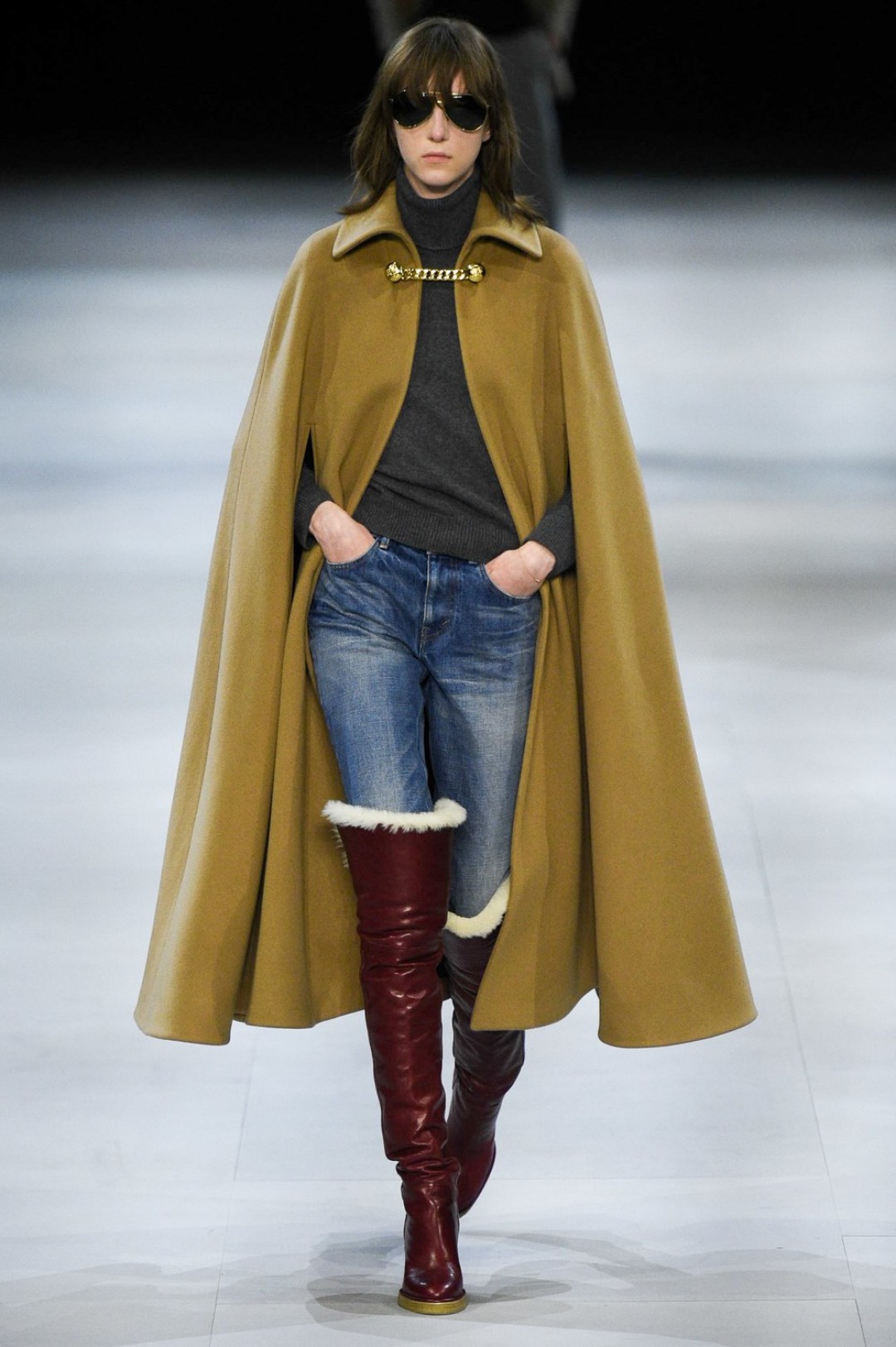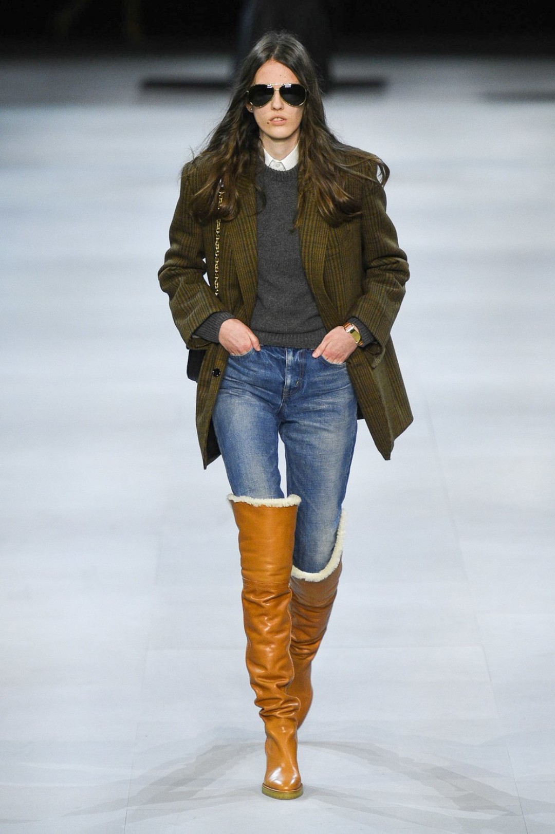 Главная вещь на показе (которую многие уже внесли в маст-хэв лист) — сапоги: утепленные изнутри овчиной, они стилизовали «лыжные» свитеры, белые шубы, «авиаторские» куртки и накидки, которые наверняка понравятся королеве Елизавете II. А учитывая любовь Эди Слимана к кастомизации платьев для красных дорожек, мы уже видим на звездах (и на себе!) платье с имитацией цепей и золотой тотал-лук с кюлотами.